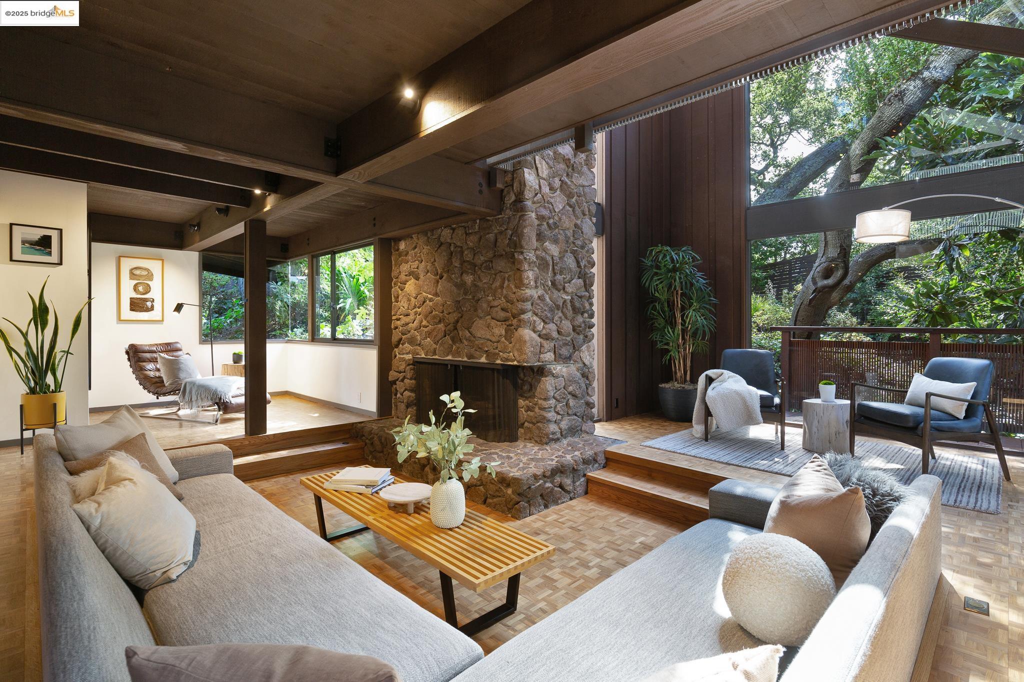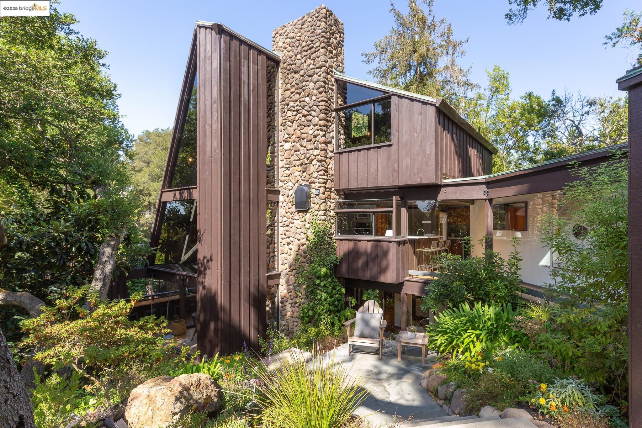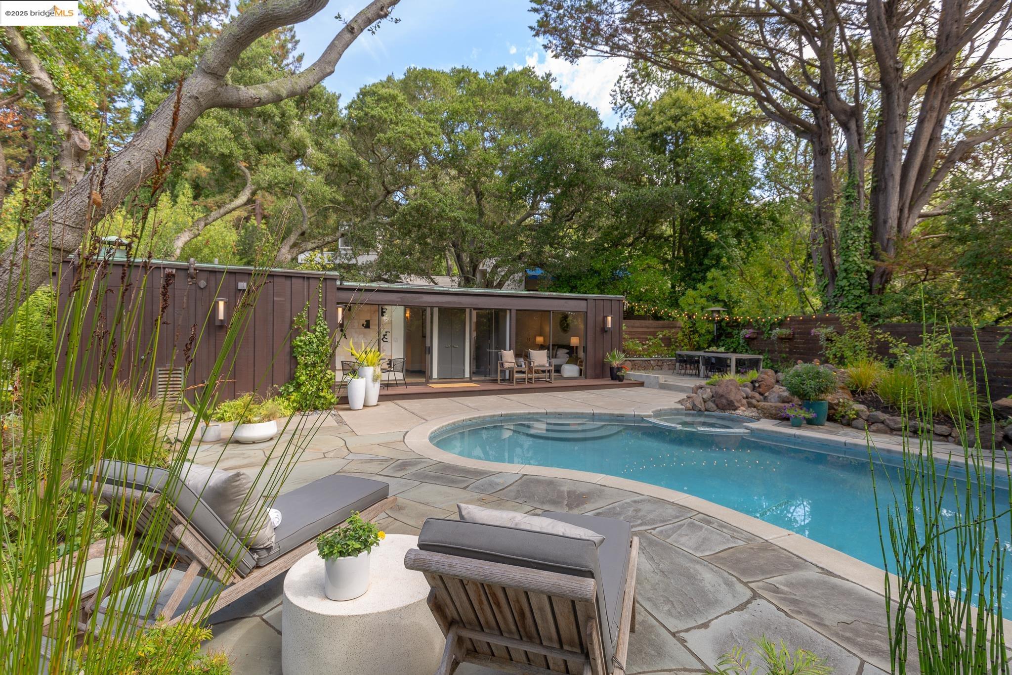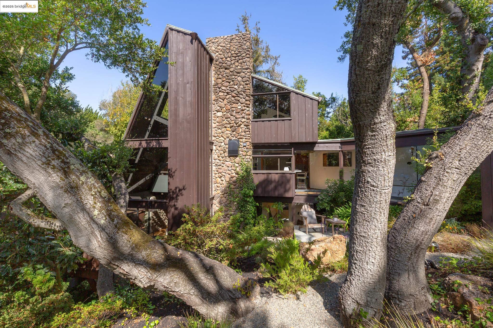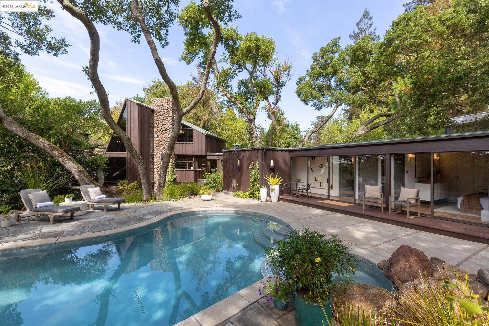 Discover a rare architectural gem in Berkeley’s coveted Uplands neighborhood. Designed by architect Lyman Jee for his family, this sun-filled home is a private retreat that seamlessly blends design, nature, and tranquility. Set on a serene, oak-studded parcel, the home is introduced by a distinctive copper roof and a stained-wood footbridge spanning a rippling creek—a magical entry that sets the stage for what’s inside. Soaring ceilings, walls of glass, and a dramatic floor-to-ceiling stone fireplace create an inviting interior that frames the lush, landscaped surroundings. With three bedrooms, three full baths, & exceptional indoor-outdoor flow, this home was designed for both relaxation & entertaining. Step outside to the pool & hot tub for resort-style living, or enjoy the peaceful connection to nature from every room. The location offers the best of Berkeley living: Close to Claremont Resort, Fournee, Peets, the Elmwood’s charming shops and cafés, transbay transit, and it’s just minutes from UC Berkeley. A stunning piece of architecture, this home is ready for its next discerning owner who values design, tranquility, and a truly unique setting.
