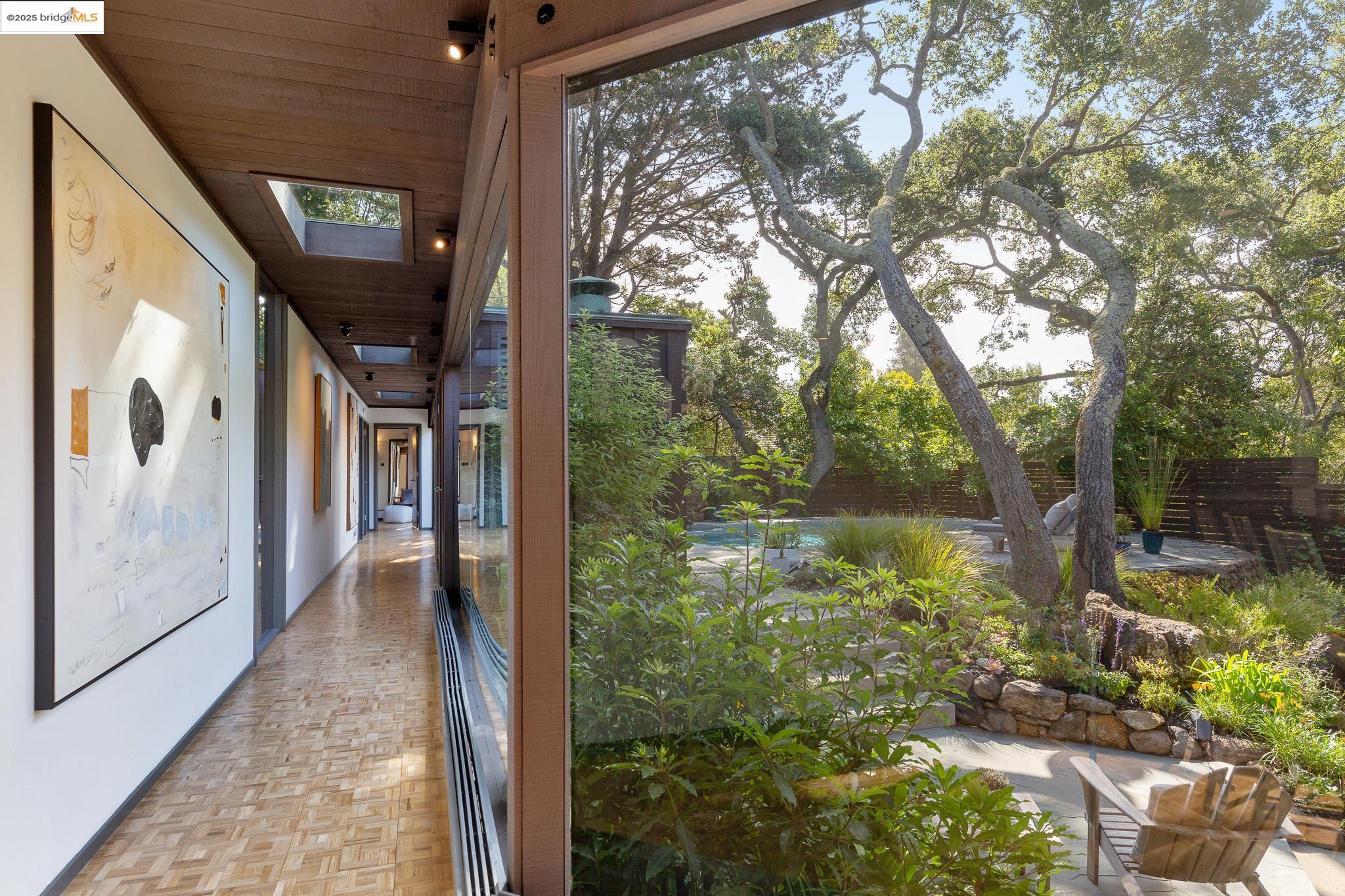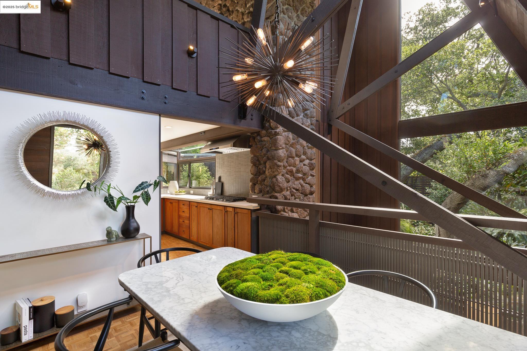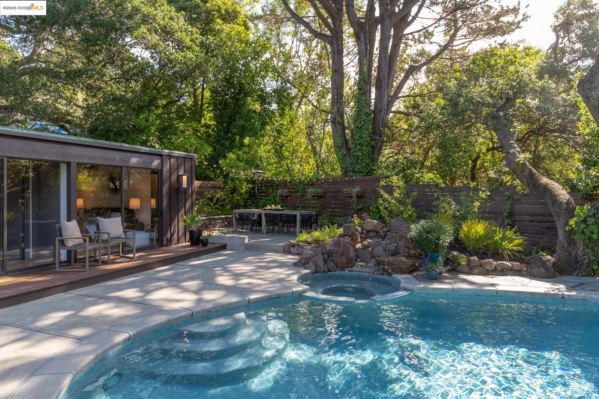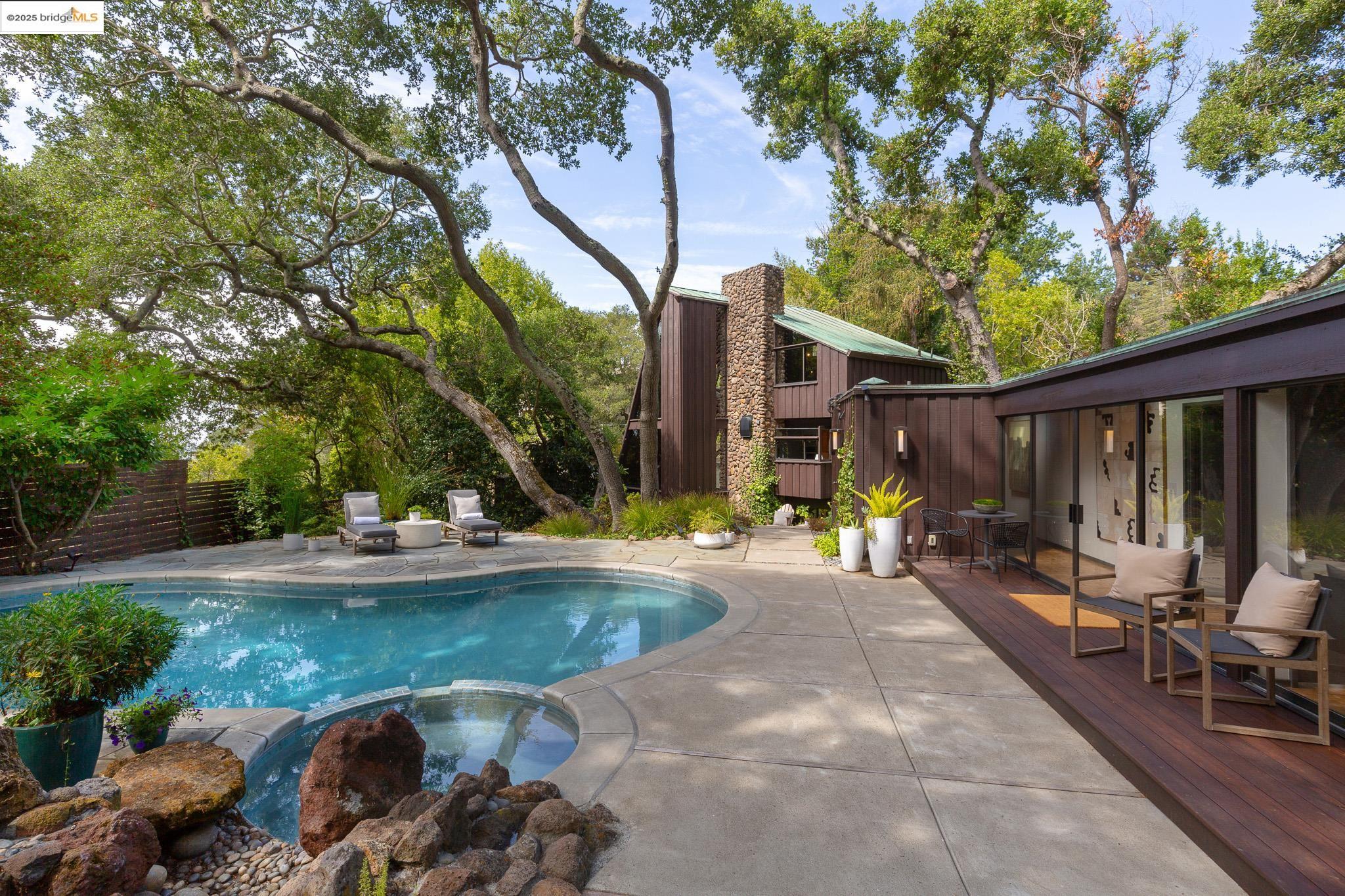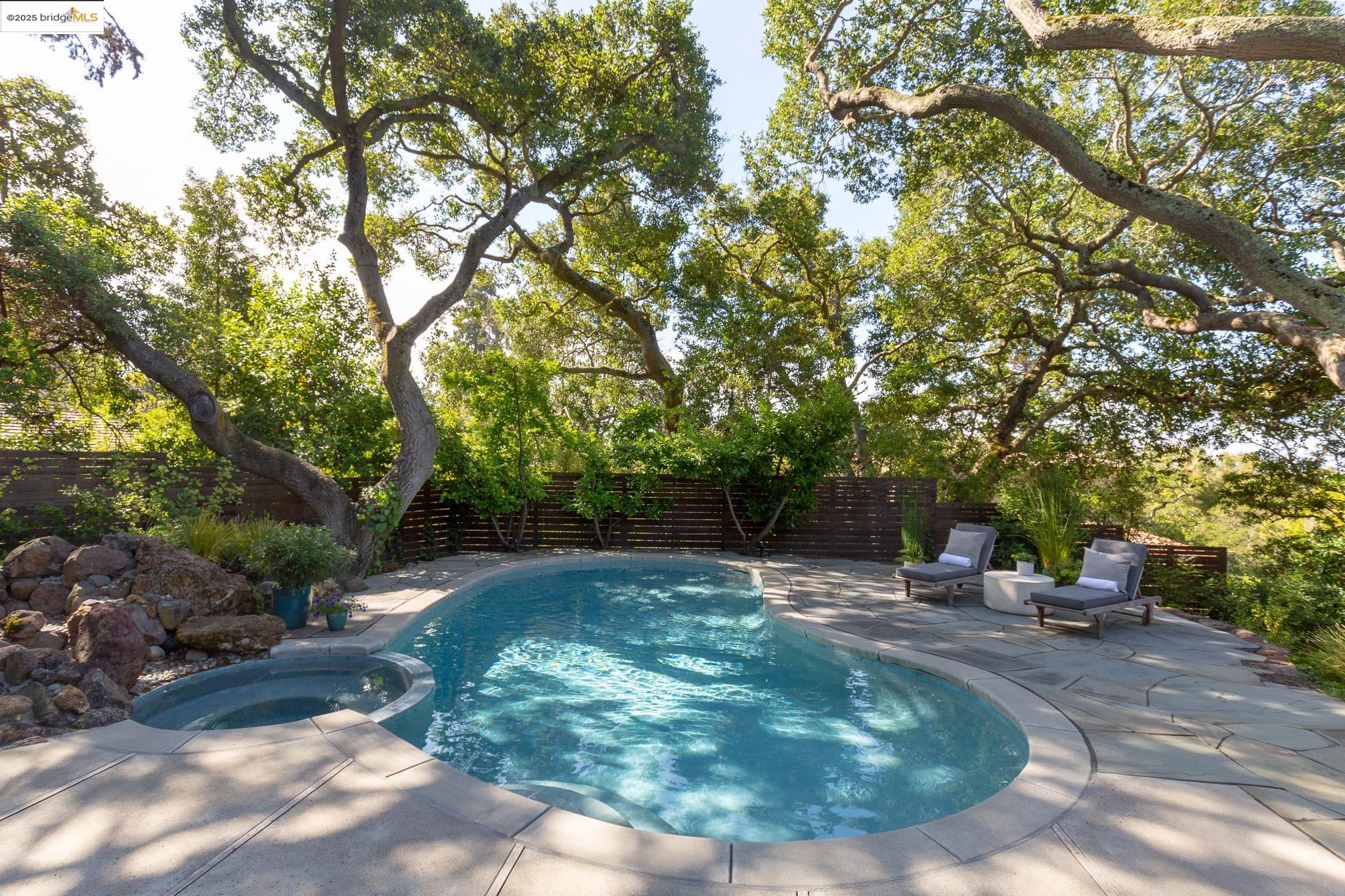Discover a rare architectural gem in Berkeley’s coveted Uplands neighborhood. Designed by architect Lyman Jee for his family, this sun-filled home is a private retreat that seamlessly blends design, nature, and tranquility. Set on a serene, oak-studded parcel, the home is introduced by a distinctive copper roof and a stained-wood footbridge spanning a rippling creek—a magical entry that sets the stage for what’s inside. Soaring ceilings, walls of glass, and a dramatic floor-to-ceiling stone fireplace create an inviting interior that frames the lush, landscaped surroundings. With three bedrooms, three full baths, & exceptional indoor-outdoor flow, this home was designed for both relaxation & entertaining. Step outside to the pool & hot tub for resort-style living, or enjoy the peaceful connection to nature from every room. The location offers the best of Berkeley living: Close to Claremont Resort, Fournee, Peets, the Elmwood’s charming shops and cafés, transbay transit, and it’s just minutes from UC Berkeley. A stunning piece of architecture, this home is ready for its next discerning owner who values design, tranquility, and a truly unique setting.