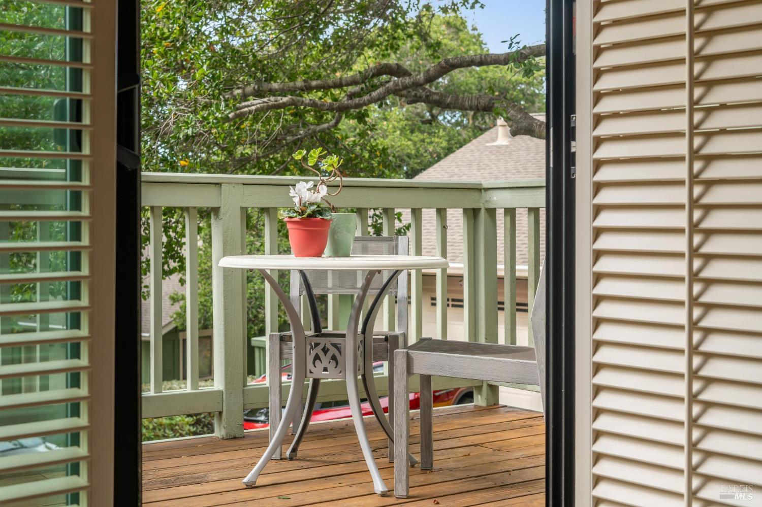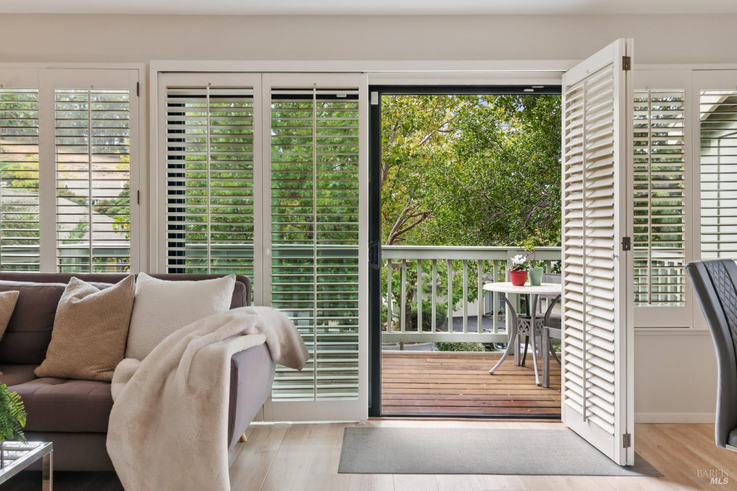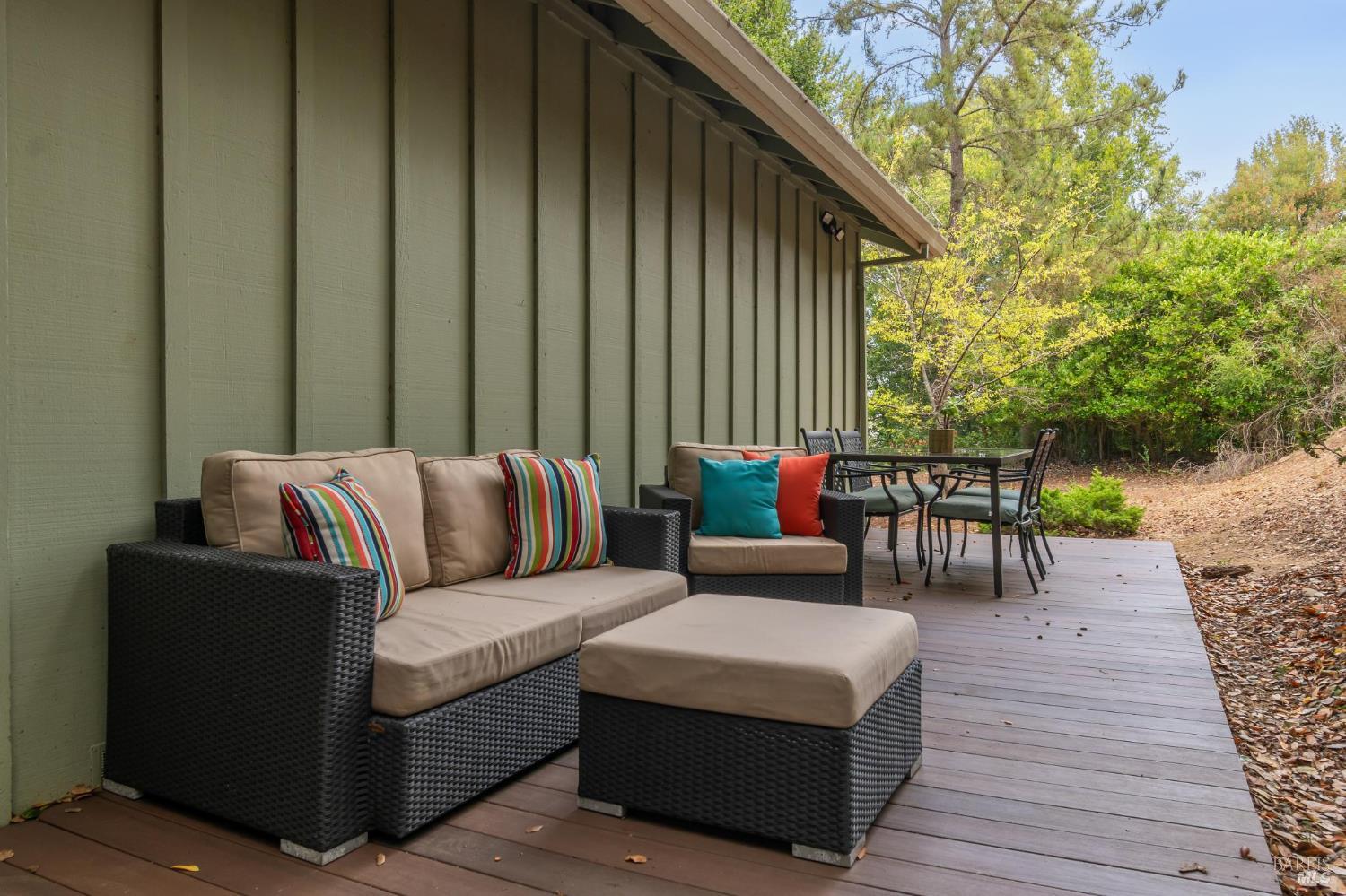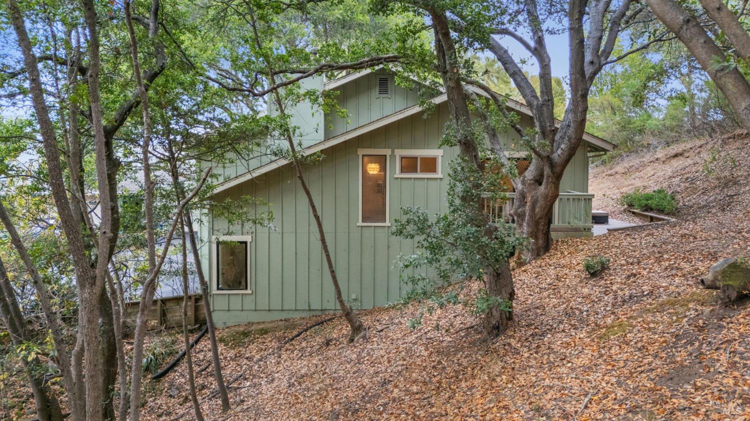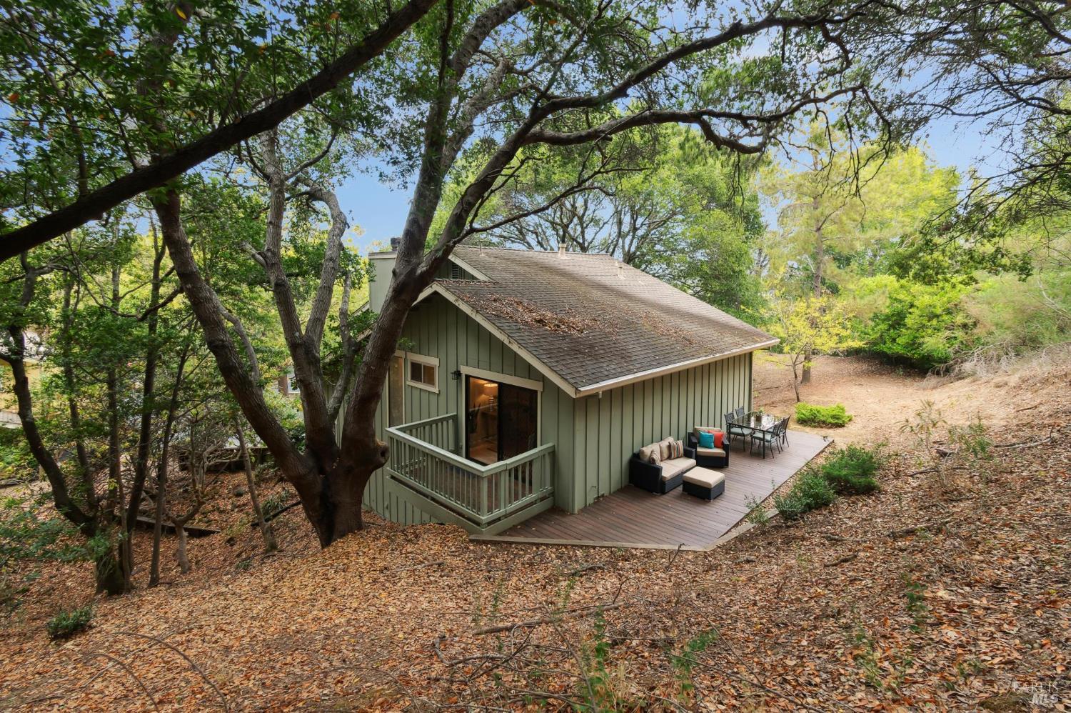 Ultra private, this fully-detached stand alone townhouse is nestled among the trees in the Quarry Meadows PUD community. Located at the end of a cul-de-sac, the nearest neighbor is 35-feet away, with only forest to the back and one side. Inside, the contemporary home is bright and inviting, with lots of windows and greenery outlooks. The spacious living room is warmed by a cozy fireplace, while the living room and dining area open onto a large front deck. The updated kitchen has stainless appliances and great natural light. The spacious primary bedroom with ensuite bath, opens onto a private deck. That deck wraps around to a third patio/deck facing peaceful open space. The second bedroom has built-in office cabinetry where you can work in a tranquil setting listening to the rustling trees. There is a second full bath and ample closet space. The 2-car attached garage with interior access has an abundance of built-in storage. Ideally located near award-winning schools, the Corte Madera Library, Peet's, and the restaurants and shops of Corte Madera Town Center and the Village.