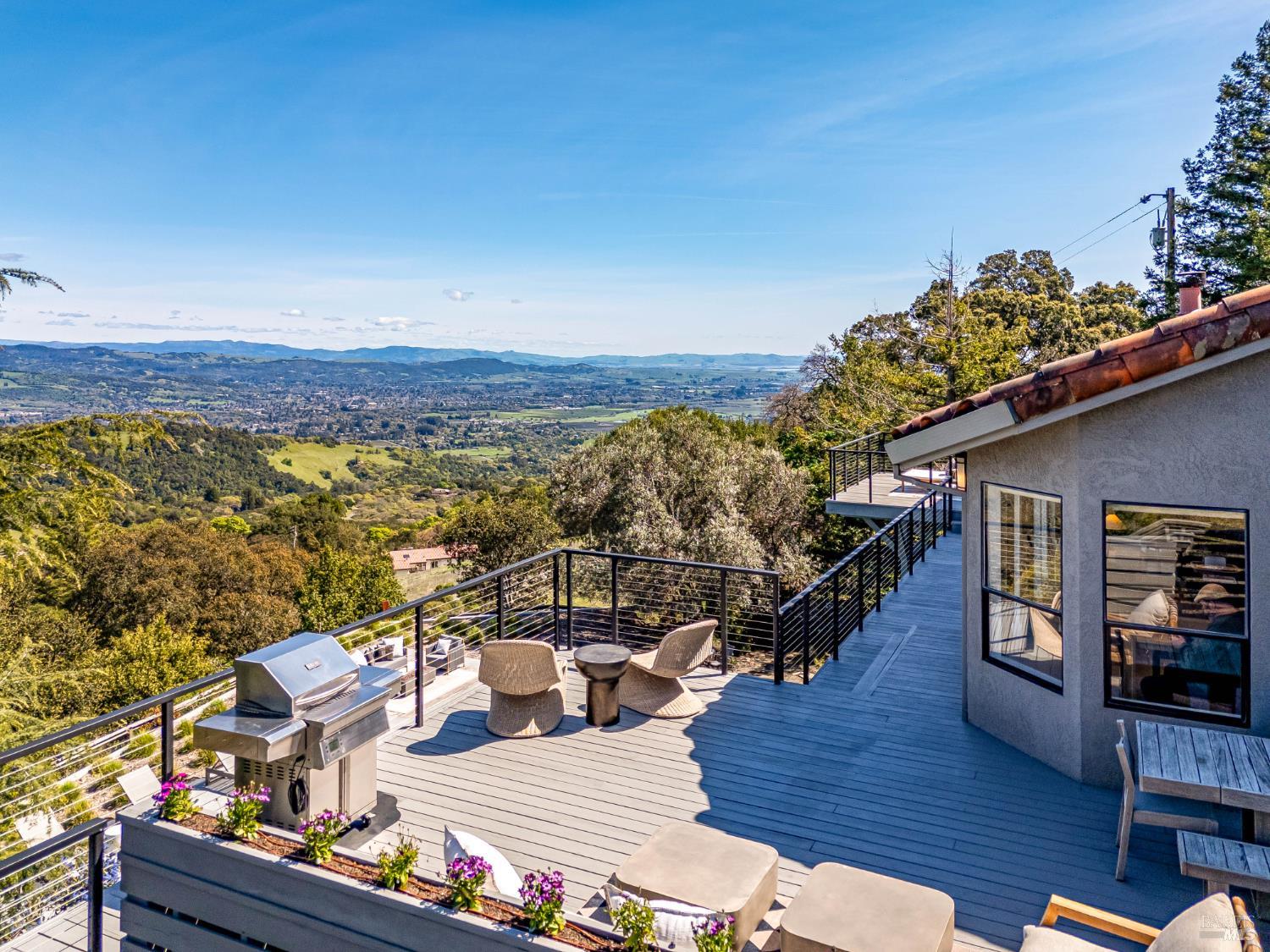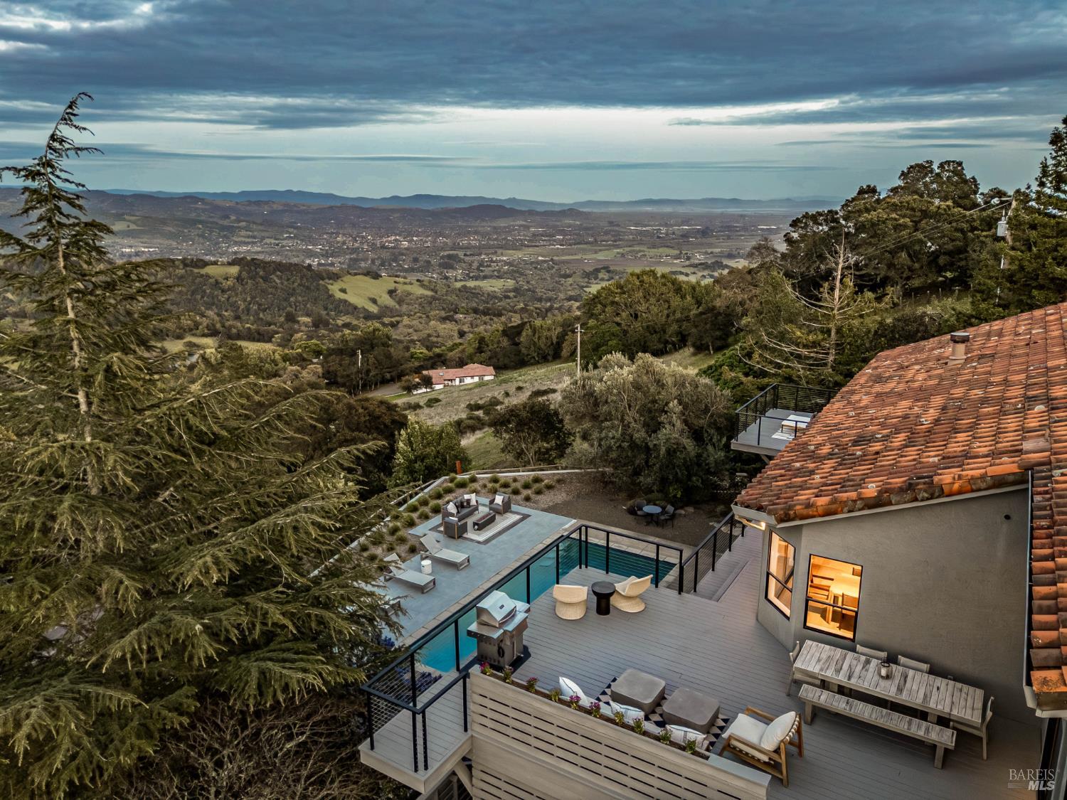 Perched on 5 acres atop Sonoma Valley's rolling hills, less than an hour from SF, this 4-bed, 3.5-bath home is a private retreat. This custom home has views from every room and showcases thoughtful details with new wide-plank oak floors, floor-to-ceiling windows, custom built-ins & new A/C. The finishes by Goldenbird Design reflect the changing hues of the Sonoma sky. The expansive great room has soaring ceilings and a stunning oceanic limewash accent wall and flows out to two levels of decks. The chef's kitchen has professional appliances, custom cabinetry & an eat-up bar plus a breakfast area. The dining area flows onto an outdoor deck with a BBQ & views. The primary bedroom offers calming earth-toned neutrals, a walk-in closet and a spa-like bath with a soaking tub, walk-in shower, towel warmer & a private deck w/ down-valley views. A private ensuite for guests, laundry room & powder room complete this level. Downstairs w/ great room, 2 guest rooms, a bath & storagge. Water filtration. 3-car garage pkg + much more. The landscaped yard features a heated pool & ample lounge space. Diamond A has a great community & offers walking/horse trails, rec center with events, pickleball, tennis, pool, park, + more! 10 mins from Sonoma Square & wineries.