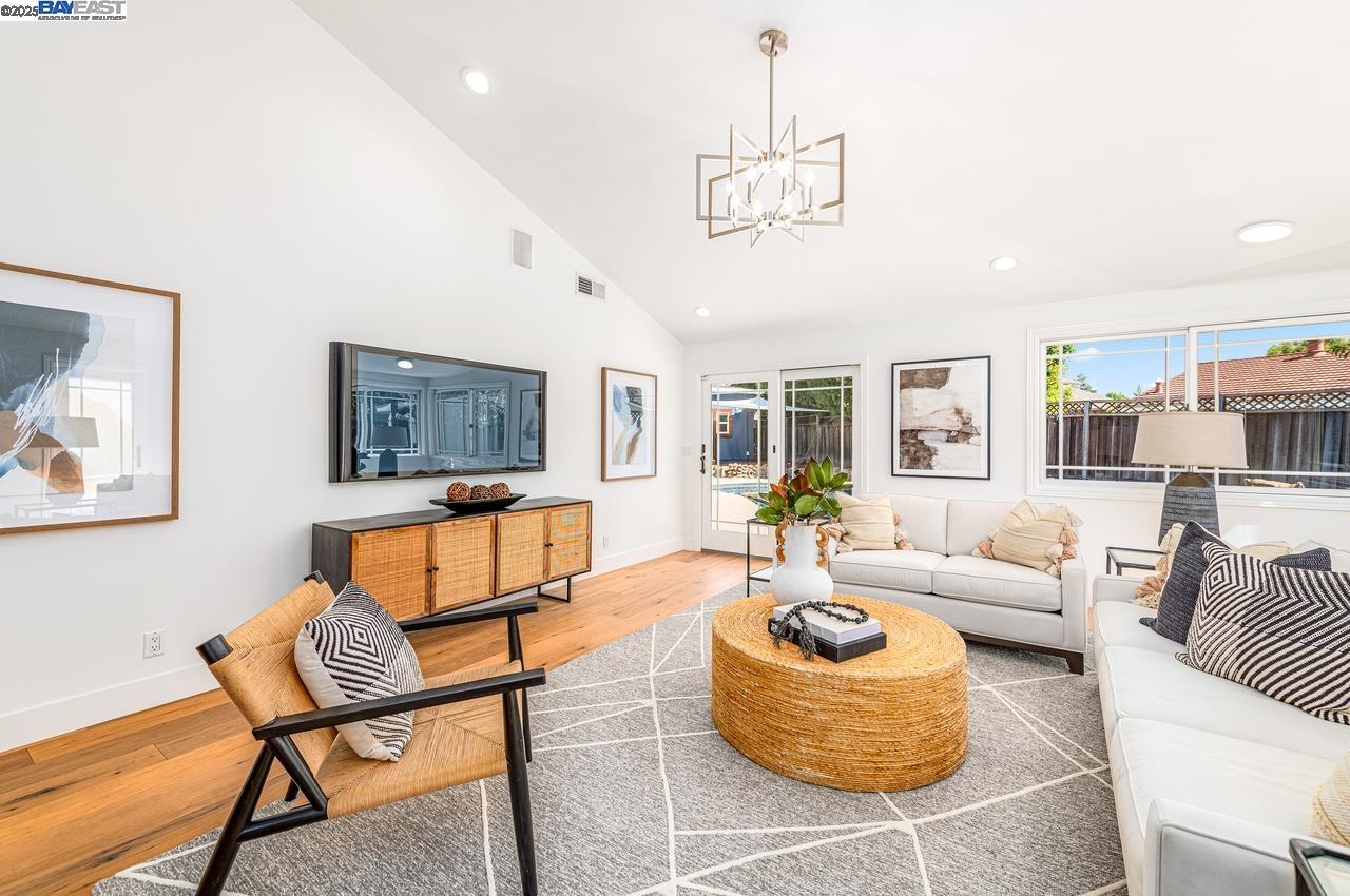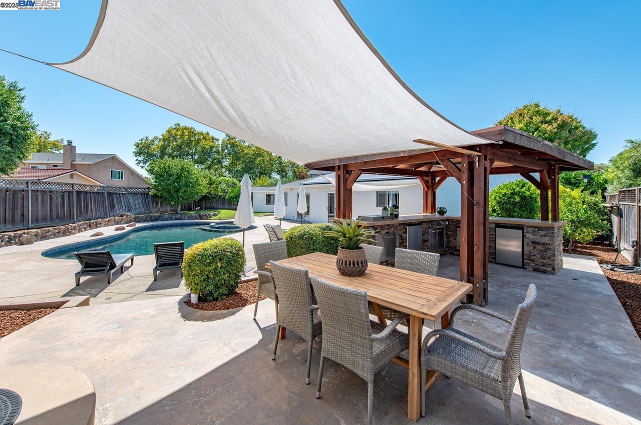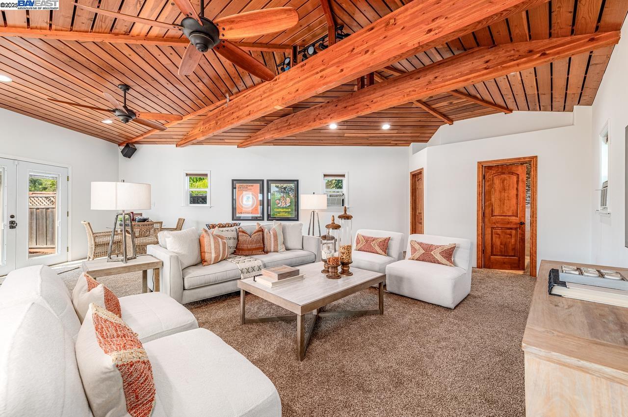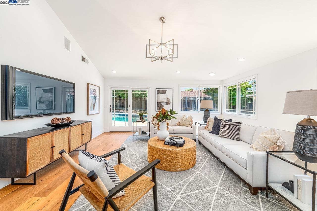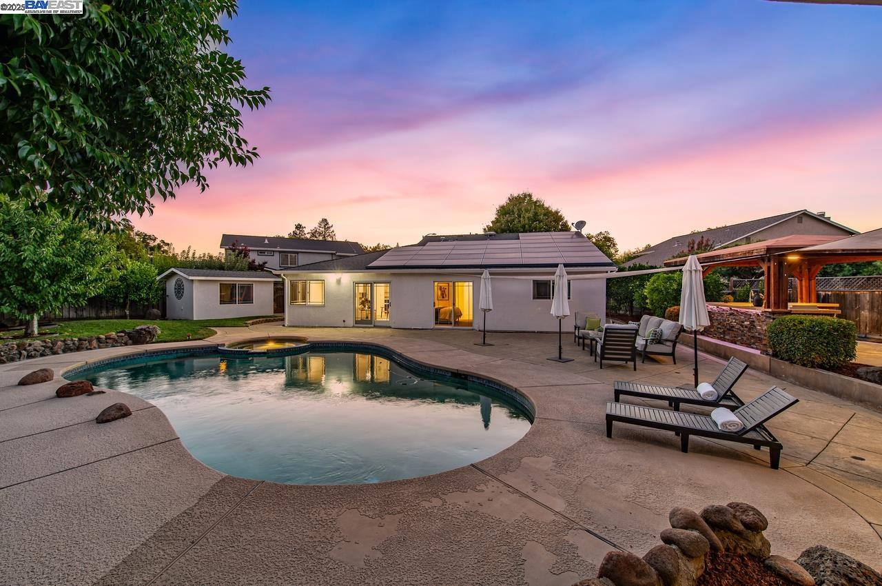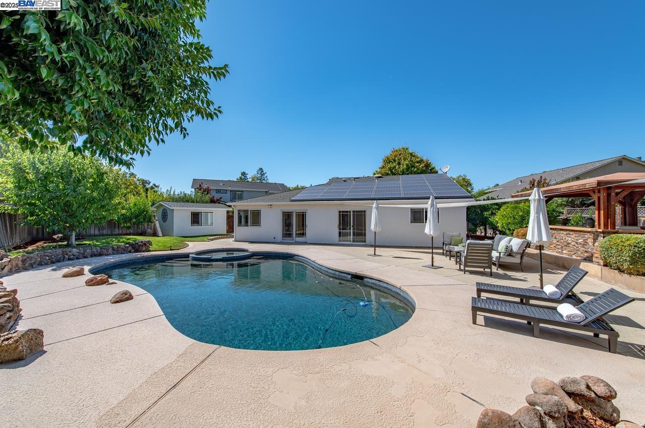 Beautiful wide plank engineered wood floors welcome you into this single-level home, where soaring vaulted ceilings in the living and family rooms create a bright, inviting atmosphere. The family room frames sparkling pool views, seamlessly connecting indoor and outdoor living. At the heart of the home, the expansive kitchen impresses with a large center island, dining area, built-in stainless refrigerator, and commercial-grade Dacor 6-burner gas stove and ovens. The primary suite is a private retreat, with a sliding door to the backyard and a thoughtfully designed walk-in closet. In the backyard, a 675 sq. ft. fully finished detached space with open-beamed ceilings and a full bathroom adds to the homes versatility—perfect as a guest house, private retreat, office, or add a kitchenette for a complete ADU. Together with the 1,815 sq. ft. main home, the total is 2,490 sq. ft. The layout provides flexible living to suit any lifestyle. Designed for entertaining, the backyard also includes a stacked stone-covered arbor with built-in fridge and burners, sparkling pool, and inviting spaces for gatherings large and small. Nestled on a quiet court, this home combines relaxed California living with a Pleasanton location—just steps from top-rated schools, parks, shopping, & Iron Horse Trail