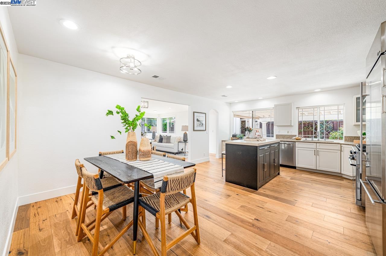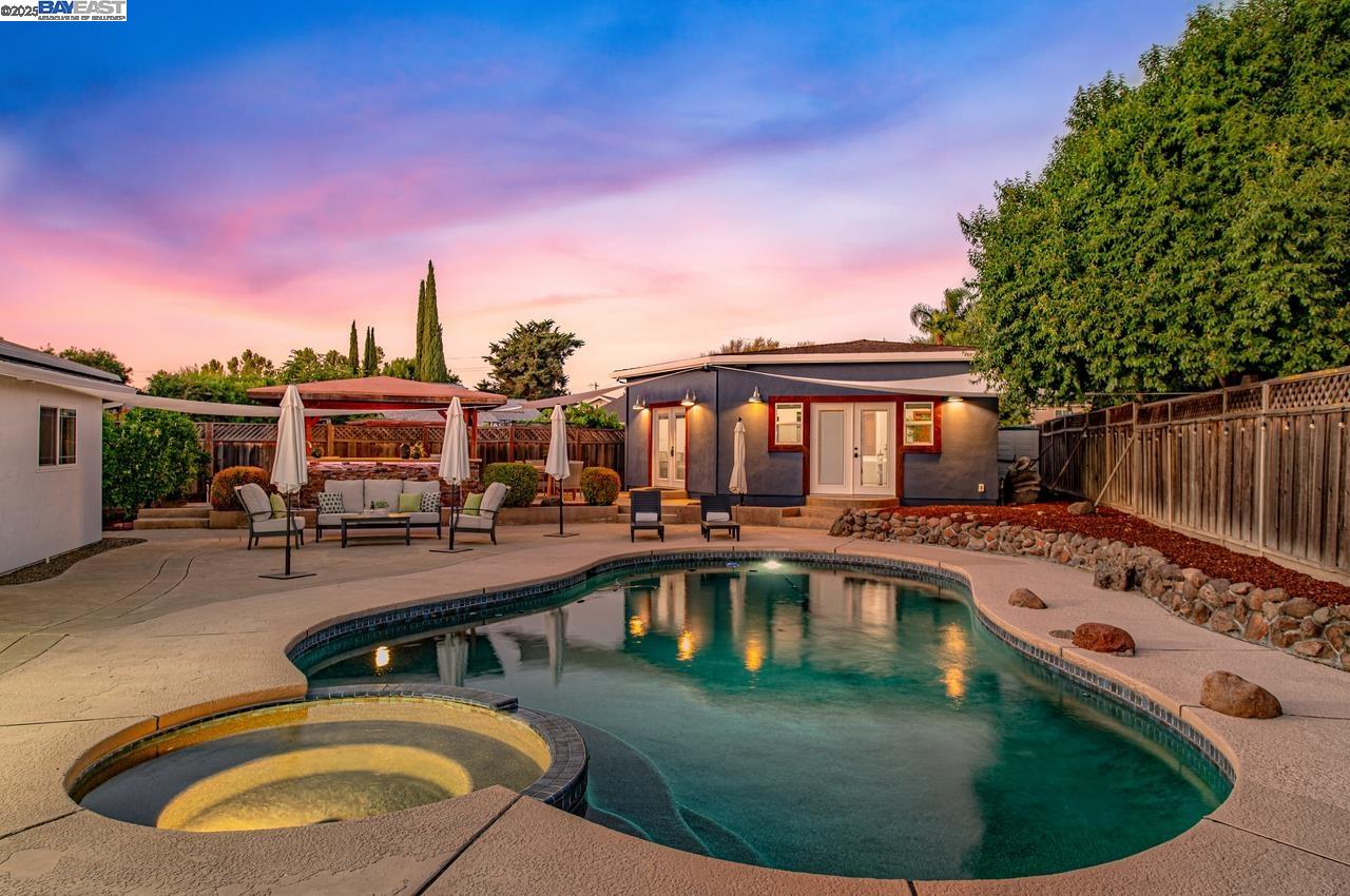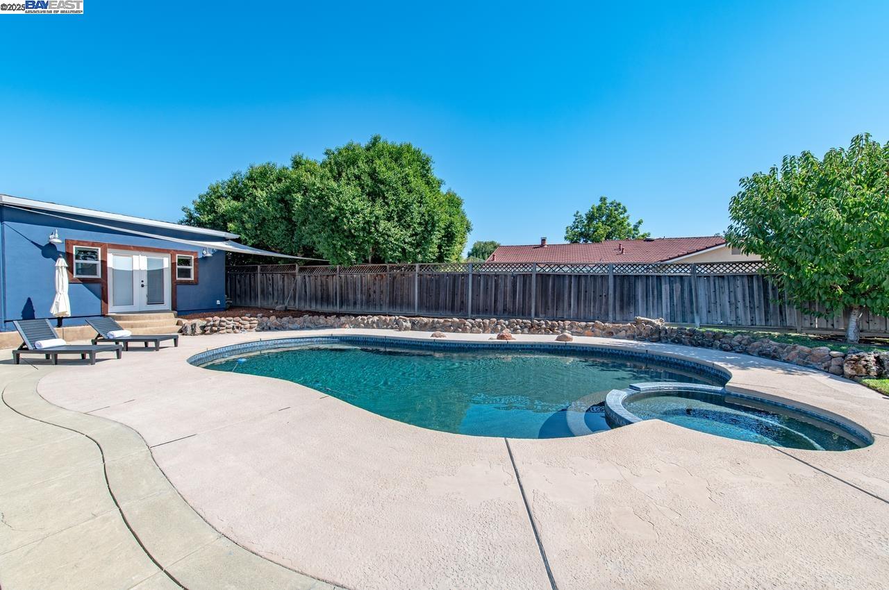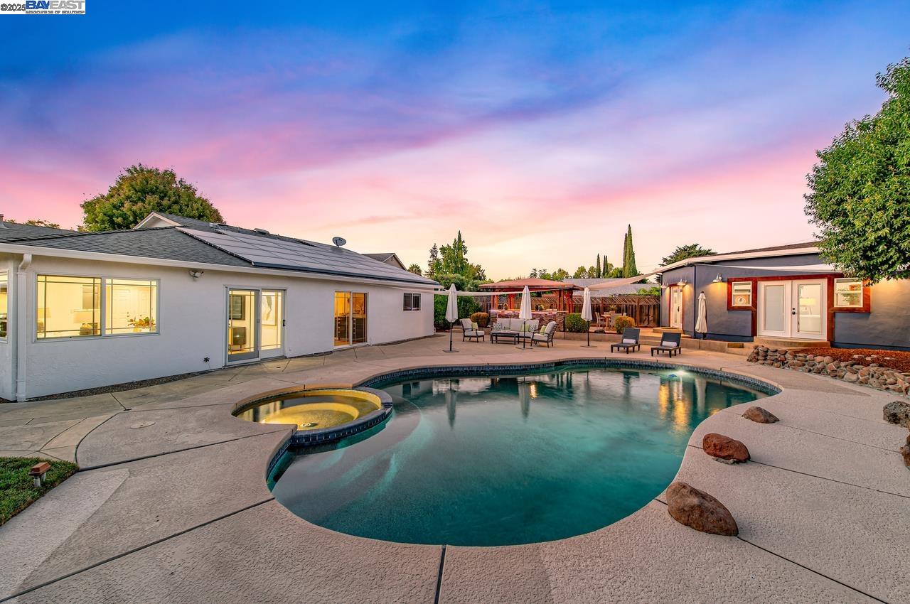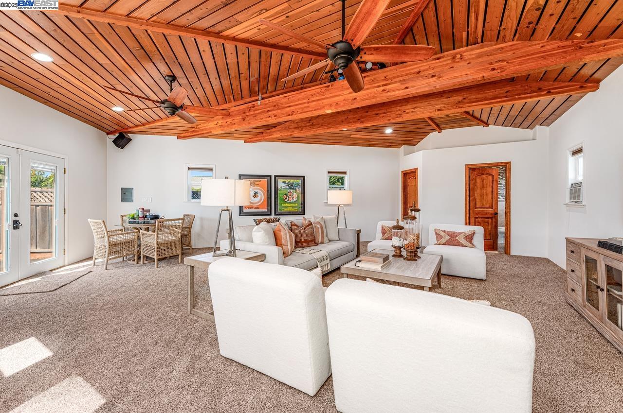 Beautiful wide plank engineered wood floors welcome you into this single-level home, where soaring vaulted ceilings in the living and family rooms create a bright, inviting atmosphere. The family room frames sparkling pool views, seamlessly connecting indoor and outdoor living. At the heart of the home, the expansive kitchen impresses with a large center island, dining area, built-in stainless refrigerator, and commercial-grade Dacor 6-burner gas stove and ovens. The primary suite is a private retreat, with a sliding door to the backyard and a thoughtfully designed walk-in closet. In the backyard, a 675 sq. ft. fully finished detached space with open-beamed ceilings and a full bathroom adds to the homes versatility—perfect as a guest house, private retreat, office, or add a kitchenette for a complete ADU. Together with the 1,815 sq. ft. main home, the total is 2,490 sq. ft. The layout provides flexible living to suit any lifestyle. Designed for entertaining, the backyard also includes a stacked stone-covered arbor with built-in fridge and burners, sparkling pool, and inviting spaces for gatherings large and small. Nestled on a quiet court, this home combines relaxed California living with a Pleasanton location—just steps from top-rated schools, parks, shopping, & Iron Horse Trail