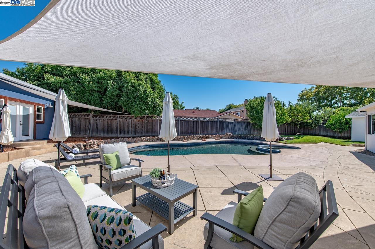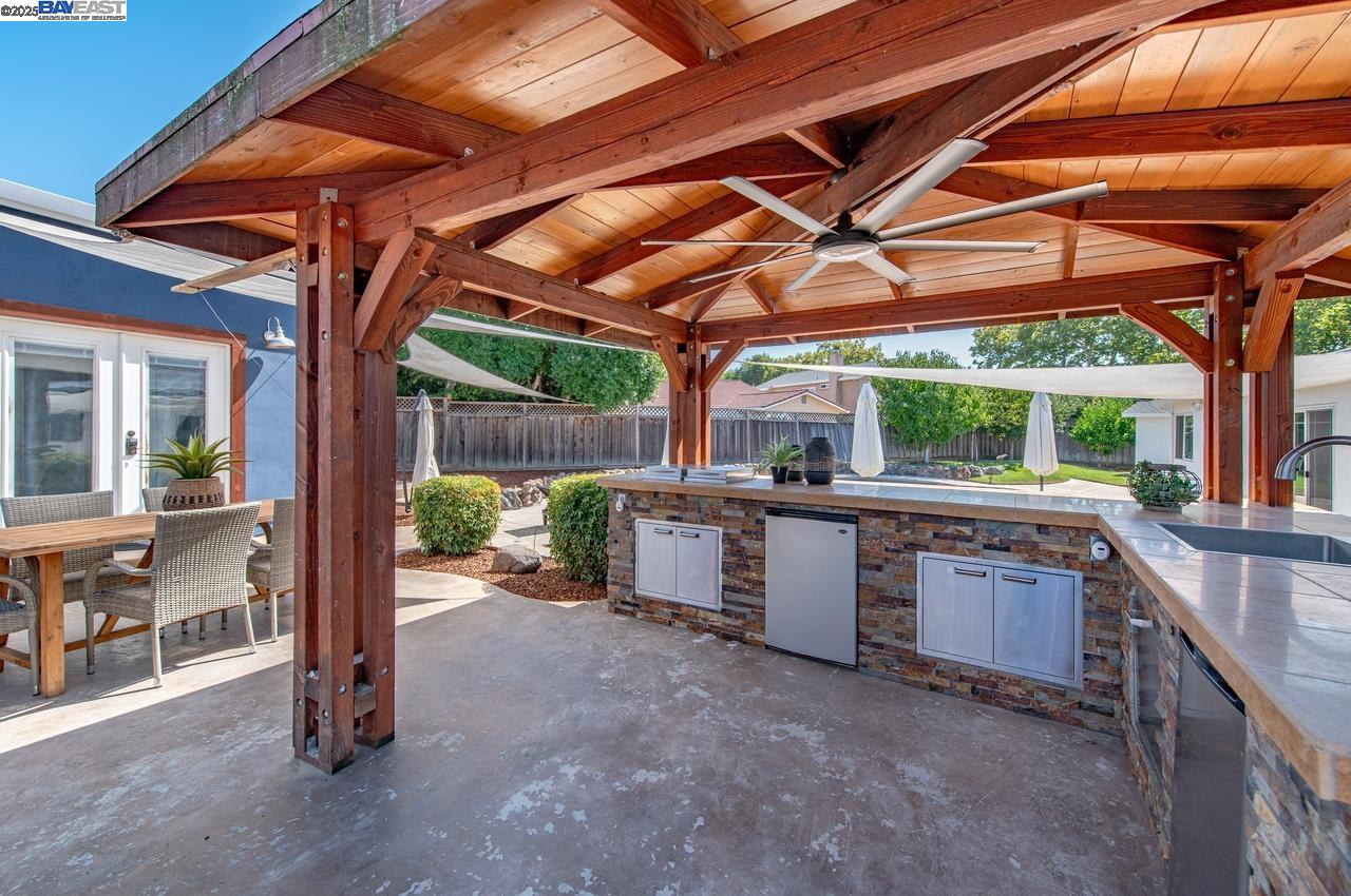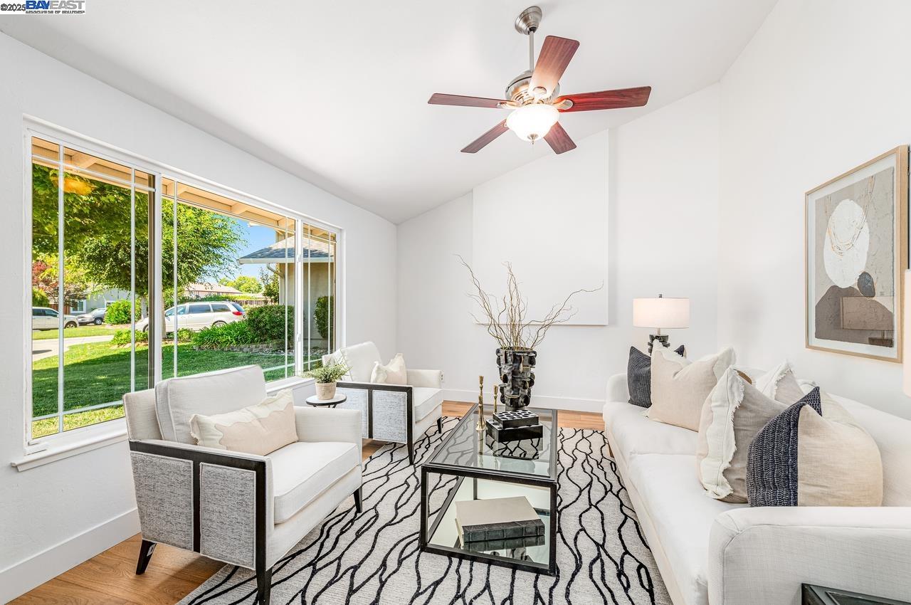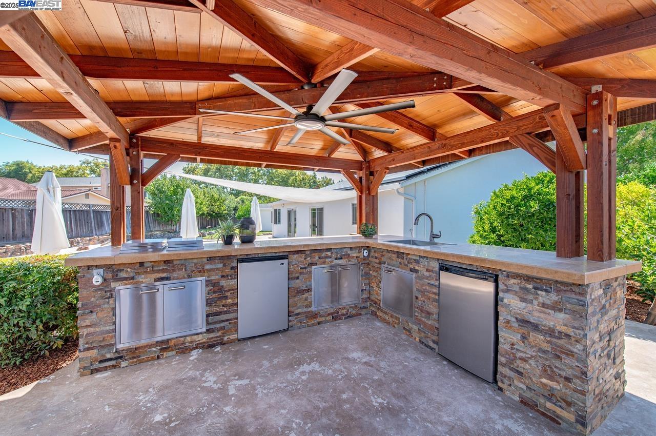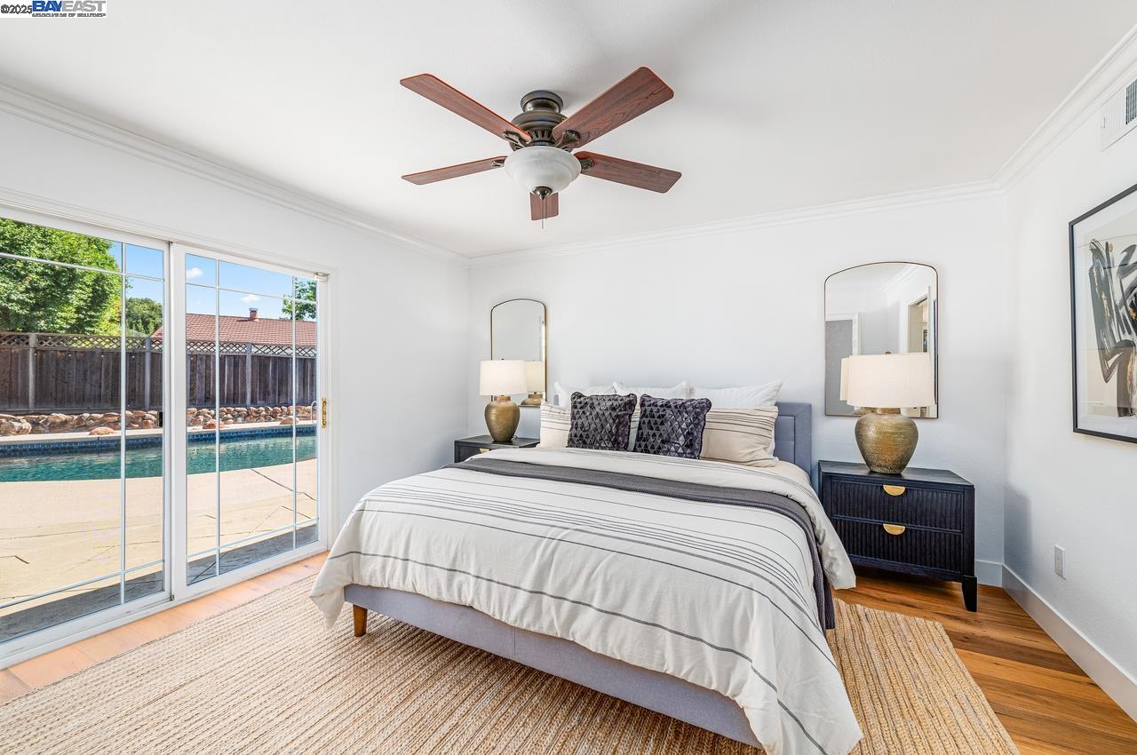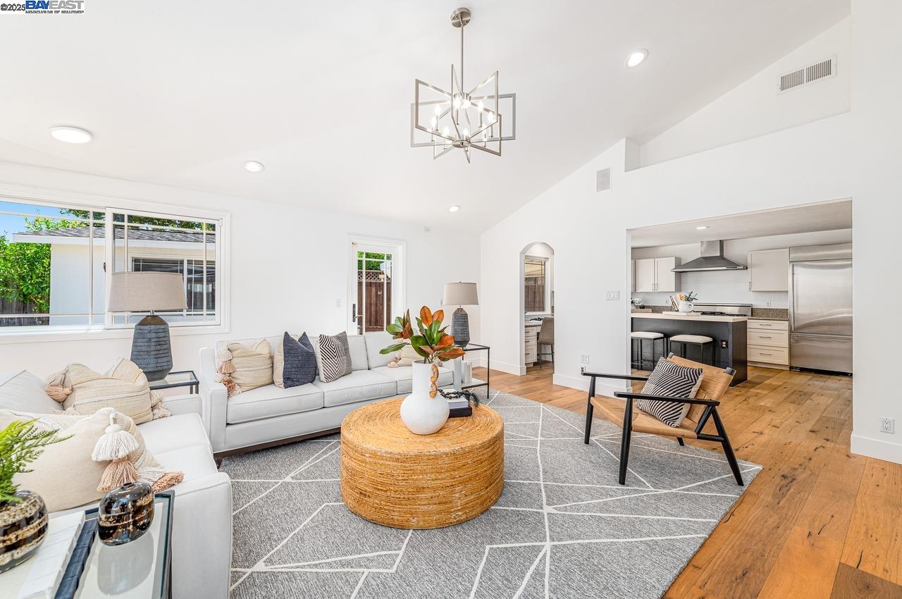 Beautiful wide plank engineered wood floors welcome you into this single-level home, where soaring vaulted ceilings in the living and family rooms create a bright, inviting atmosphere. The family room frames sparkling pool views, seamlessly connecting indoor and outdoor living. At the heart of the home, the expansive kitchen impresses with a large center island, dining area, built-in stainless refrigerator, and commercial-grade Dacor 6-burner gas stove and ovens. The primary suite is a private retreat, with a sliding door to the backyard and a thoughtfully designed walk-in closet. In the backyard, a 675 sq. ft. fully finished detached space with open-beamed ceilings and a full bathroom adds to the homes versatility—perfect as a guest house, private retreat, office, or add a kitchenette for a complete ADU. Together with the 1,815 sq. ft. main home, the total is 2,490 sq. ft. The layout provides flexible living to suit any lifestyle. Designed for entertaining, the backyard also includes a stacked stone-covered arbor with built-in fridge and burners, sparkling pool, and inviting spaces for gatherings large and small. Nestled on a quiet court, this home combines relaxed California living with a Pleasanton location—just steps from top-rated schools, parks, shopping, & Iron Horse Trail