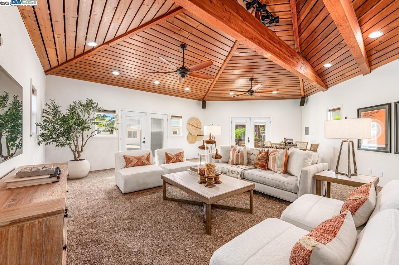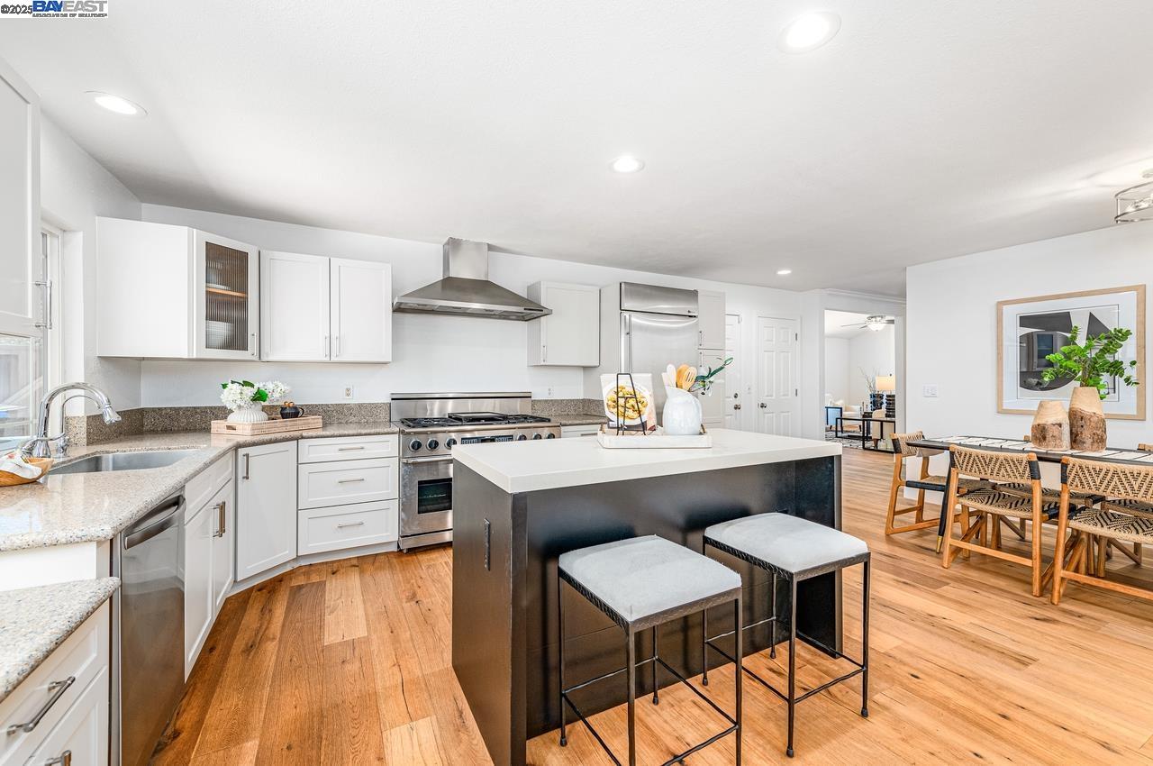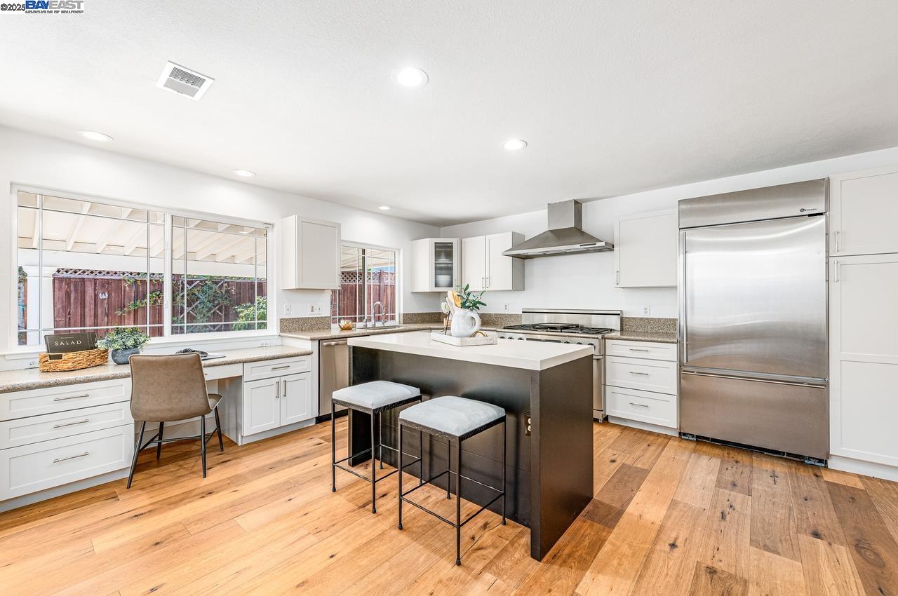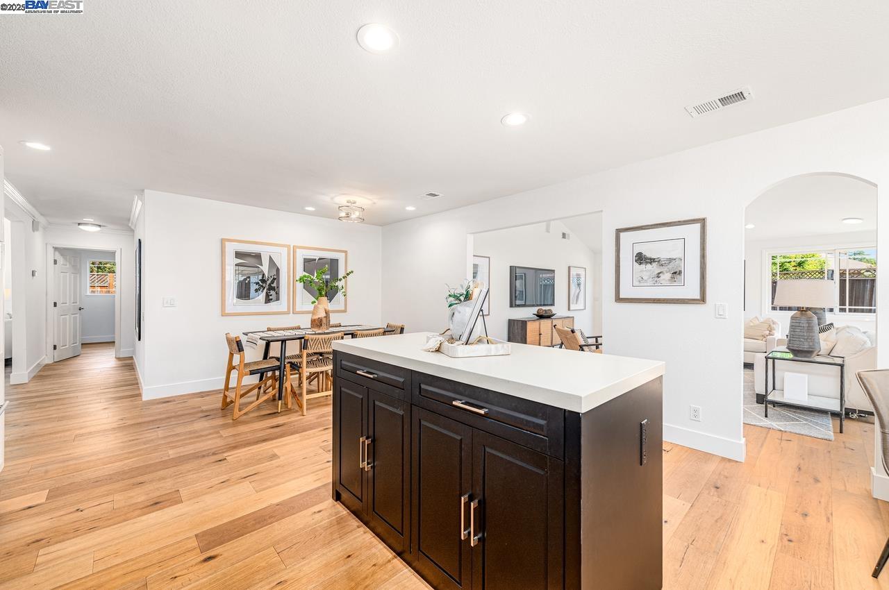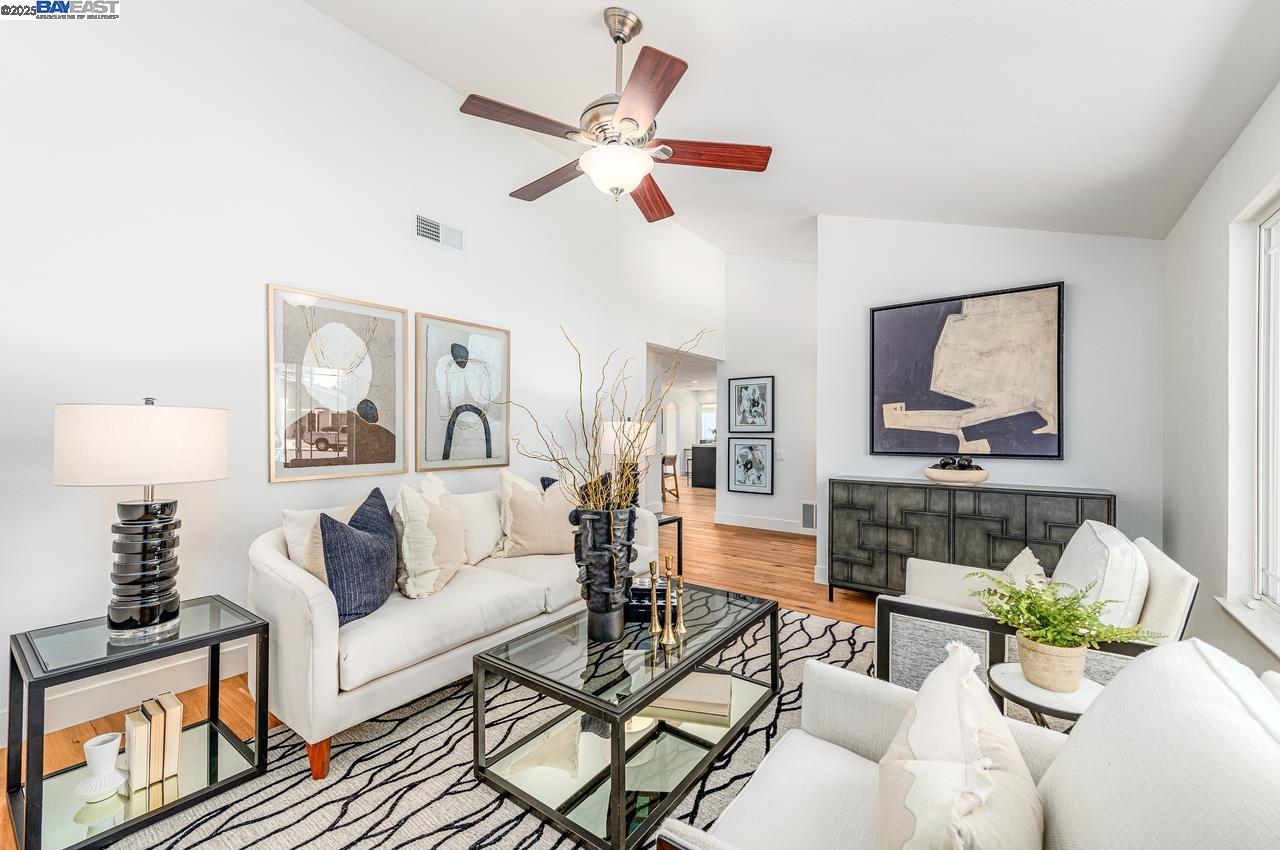 Beautiful wide plank engineered wood floors welcome you into this single-level home, where soaring vaulted ceilings in the living and family rooms create a bright, inviting atmosphere. The family room frames sparkling pool views, seamlessly connecting indoor and outdoor living. At the heart of the home, the expansive kitchen impresses with a large center island, dining area, built-in stainless refrigerator, and commercial-grade Dacor 6-burner gas stove and ovens. The primary suite is a private retreat, with a sliding door to the backyard and a thoughtfully designed walk-in closet. In the backyard, a 675 sq. ft. fully finished detached space with open-beamed ceilings and a full bathroom adds to the homes versatility—perfect as a guest house, private retreat, office, or add a kitchenette for a complete ADU. Together with the 1,815 sq. ft. main home, the total is 2,490 sq. ft. The layout provides flexible living to suit any lifestyle. Designed for entertaining, the backyard also includes a stacked stone-covered arbor with built-in fridge and burners, sparkling pool, and inviting spaces for gatherings large and small. Nestled on a quiet court, this home combines relaxed California living with a Pleasanton location—just steps from top-rated schools, parks, shopping, & Iron Horse Trail