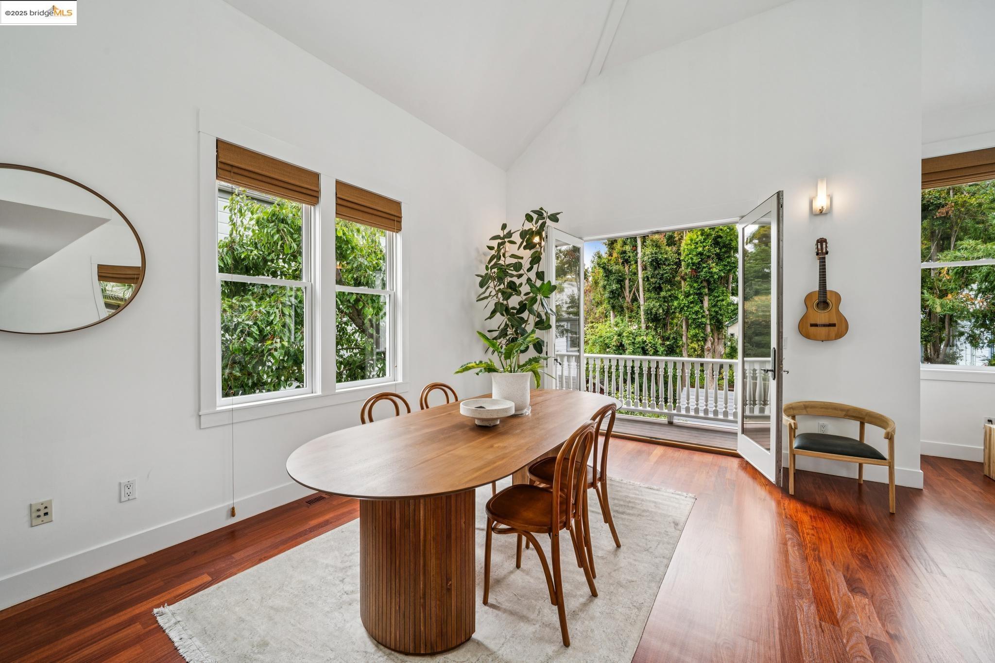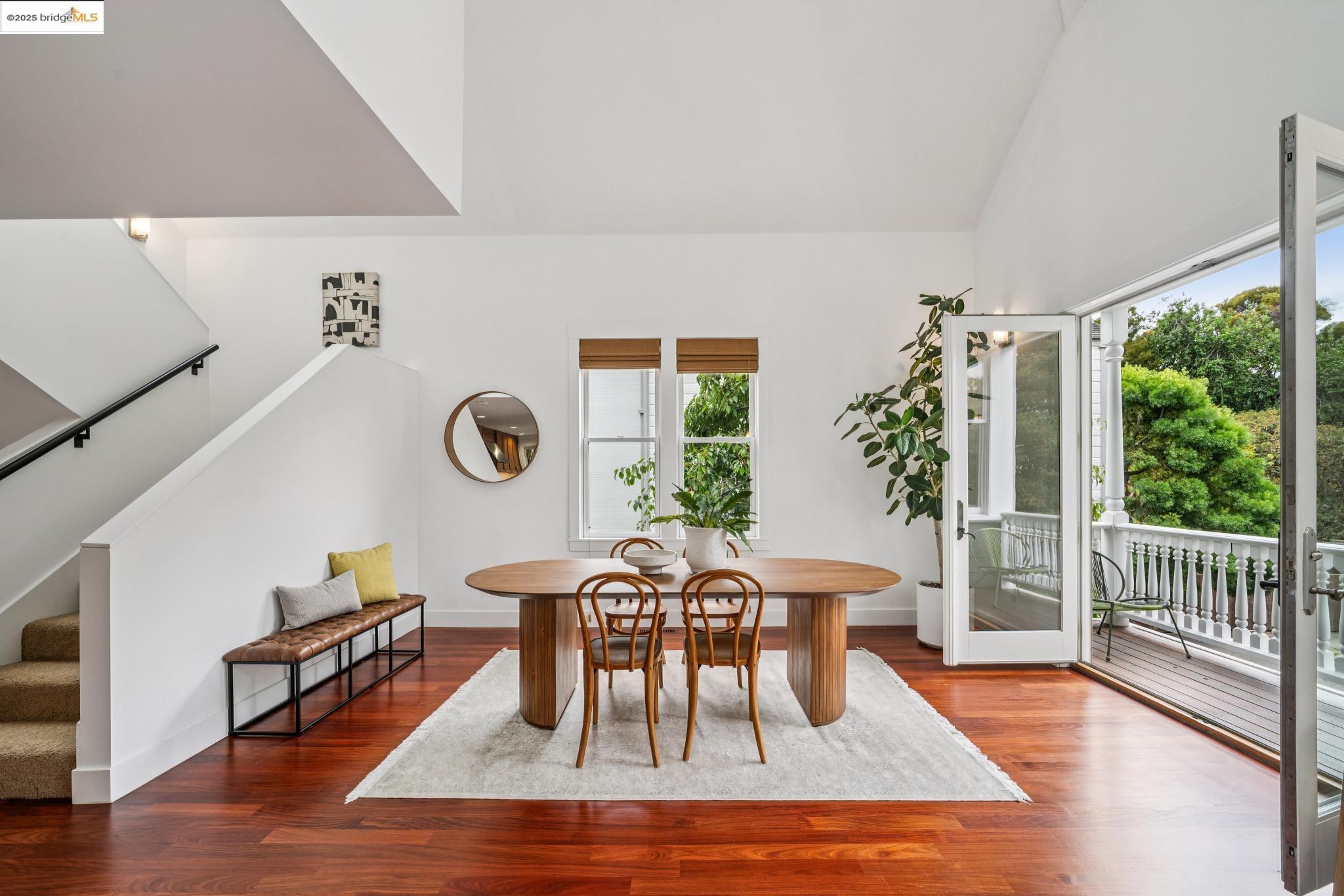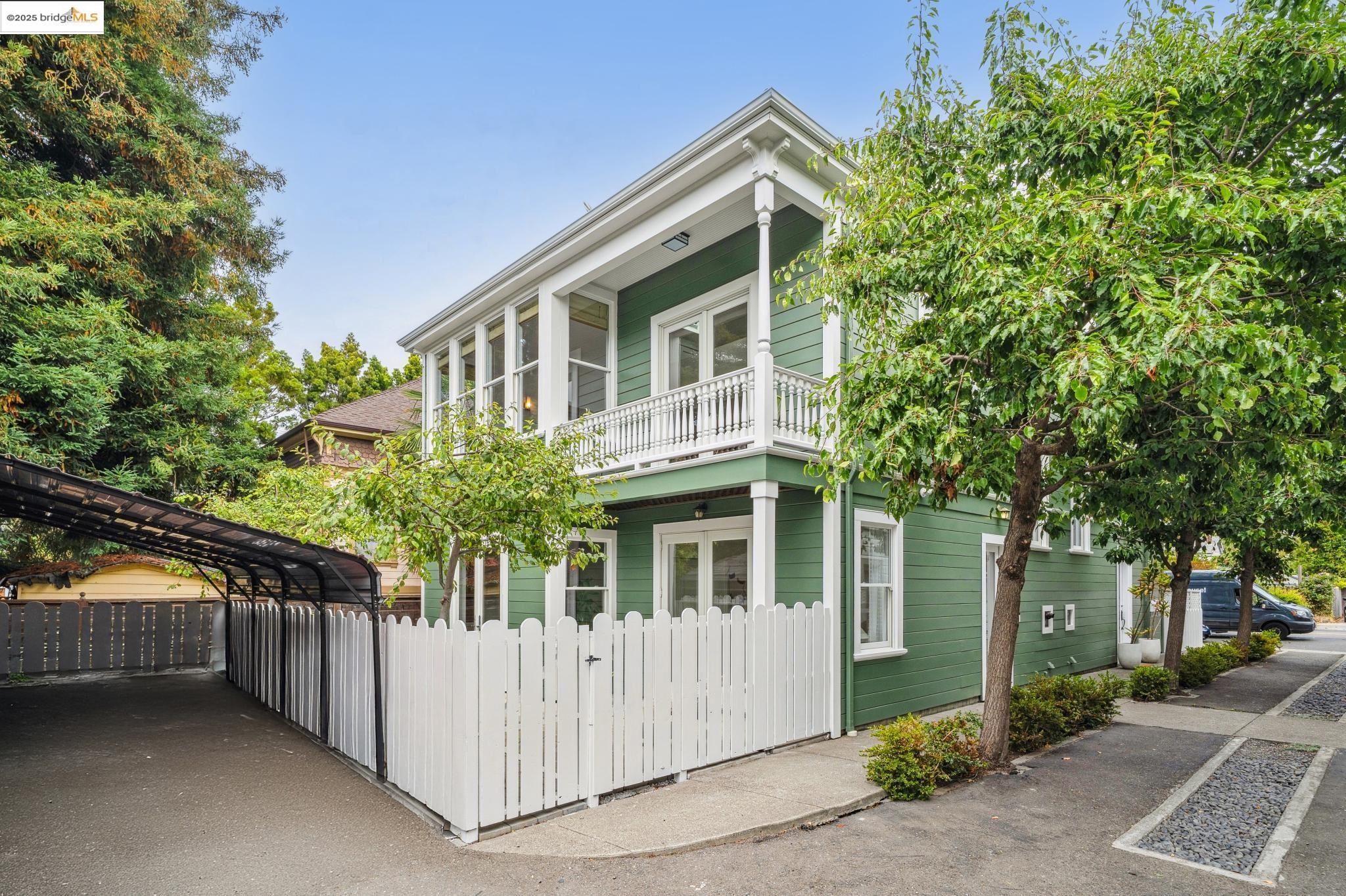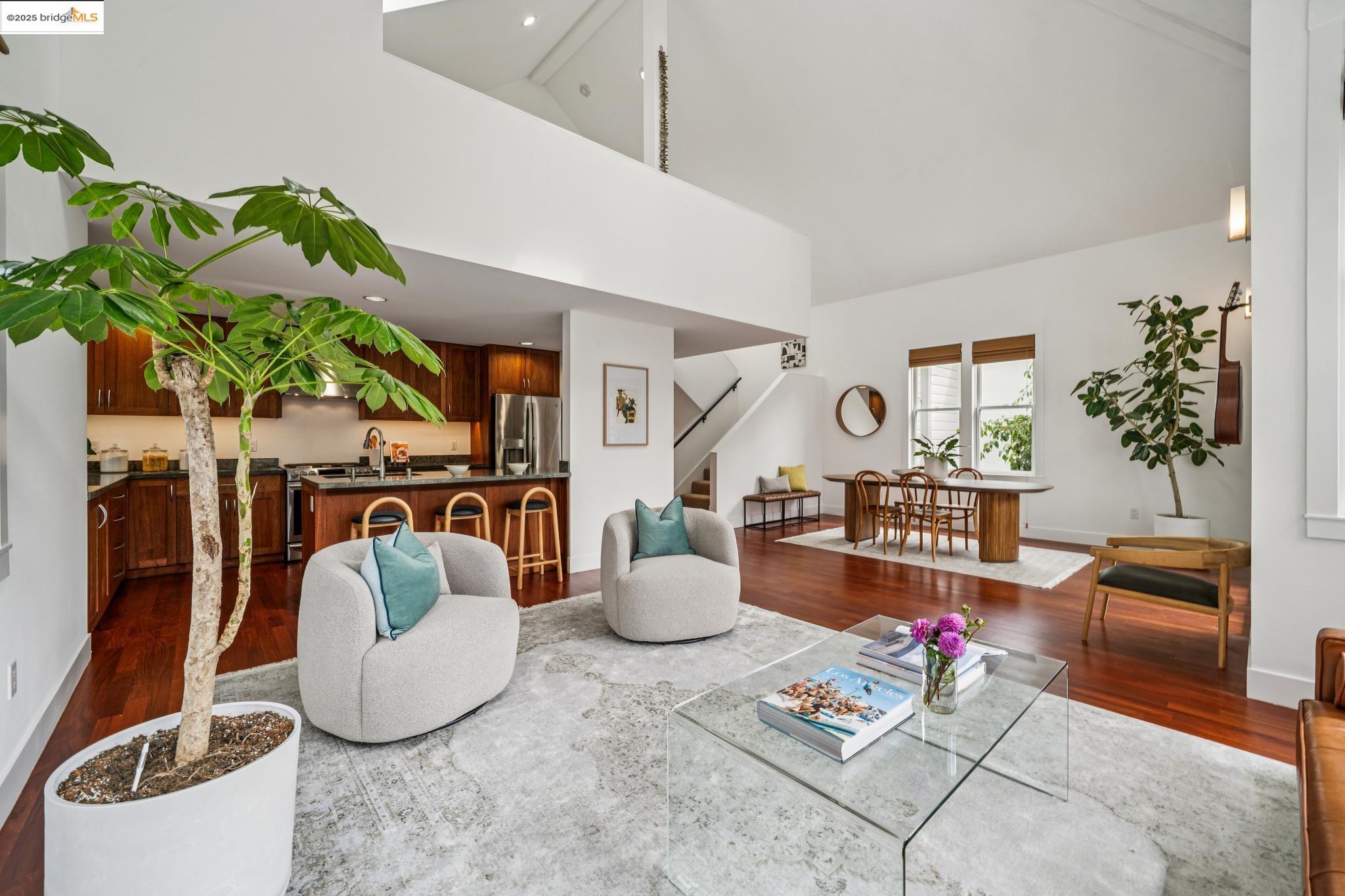 2104 Sixth Street seamlessly blends historic charm with modern style. Tucked away and off the street, with a private entrance and patio that’s equal parts retreat and city living, 2104 Sixth Street is just blocks from the restaurants, cafés and boutiques of Berkeley’s 4th Street district. With three levels inside, the entry floor features a serene and spacious primary suite with French doors to the patio, plus a second bedroom and full bath for guests, family, or a home gym. Light filters in through dramatic windows and skylights on the second level, highlighting the beautifully refinished hardwood floors and open living, dining, and kitchen space. A balcony off the dining area overlooking the private patio invites easy outdoor enjoyment. Floating above the main living area is a spacious mezzanine, adding a versatile spot for a lounge, office, or guest nook with a dedicated half bath. Distinctive architecture, private outdoor spaces, and a coveted West Berkeley location make this residence both a stunning design statement and an everyday sanctuary. Some photos may be virtually enhanced.