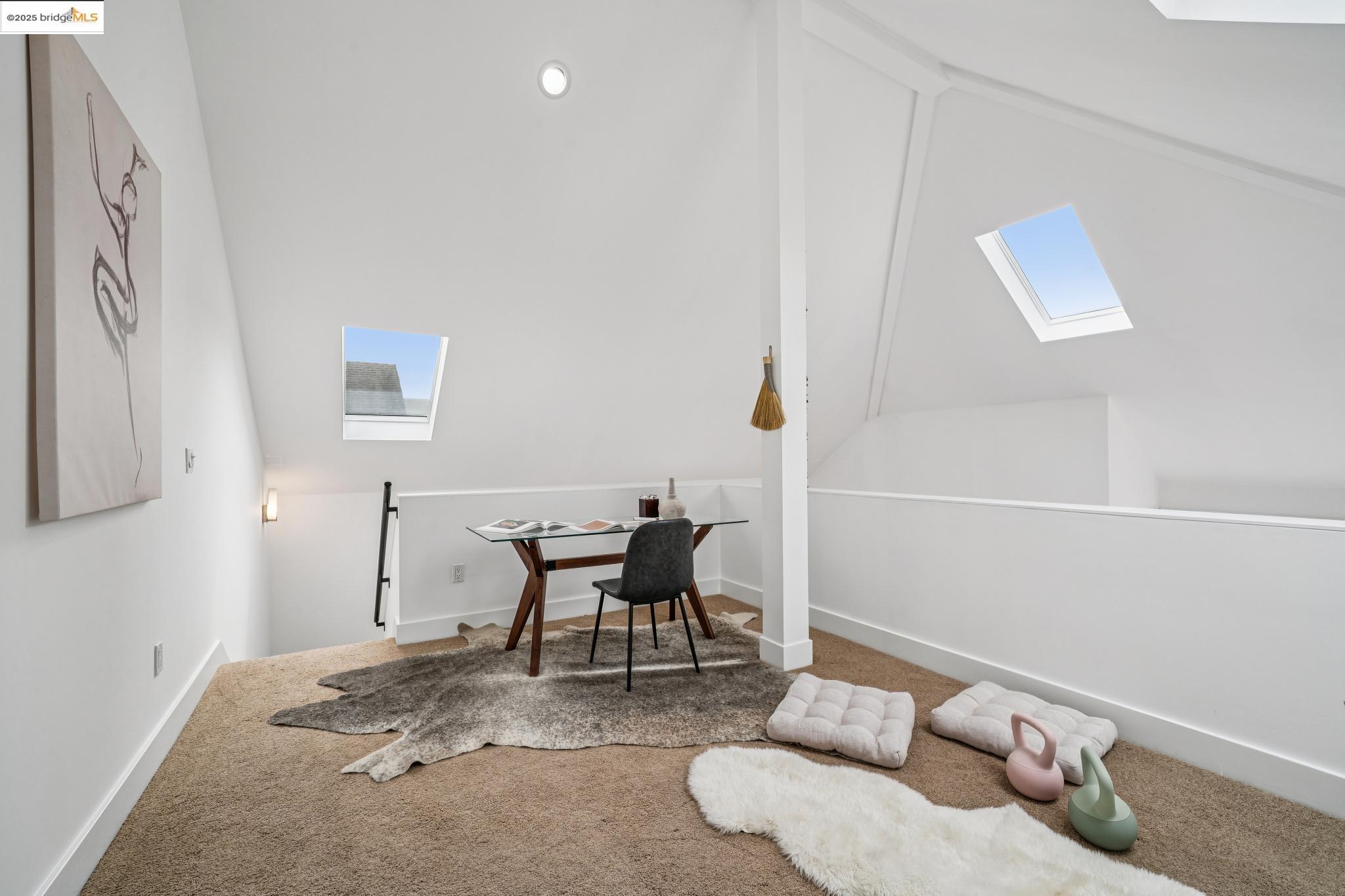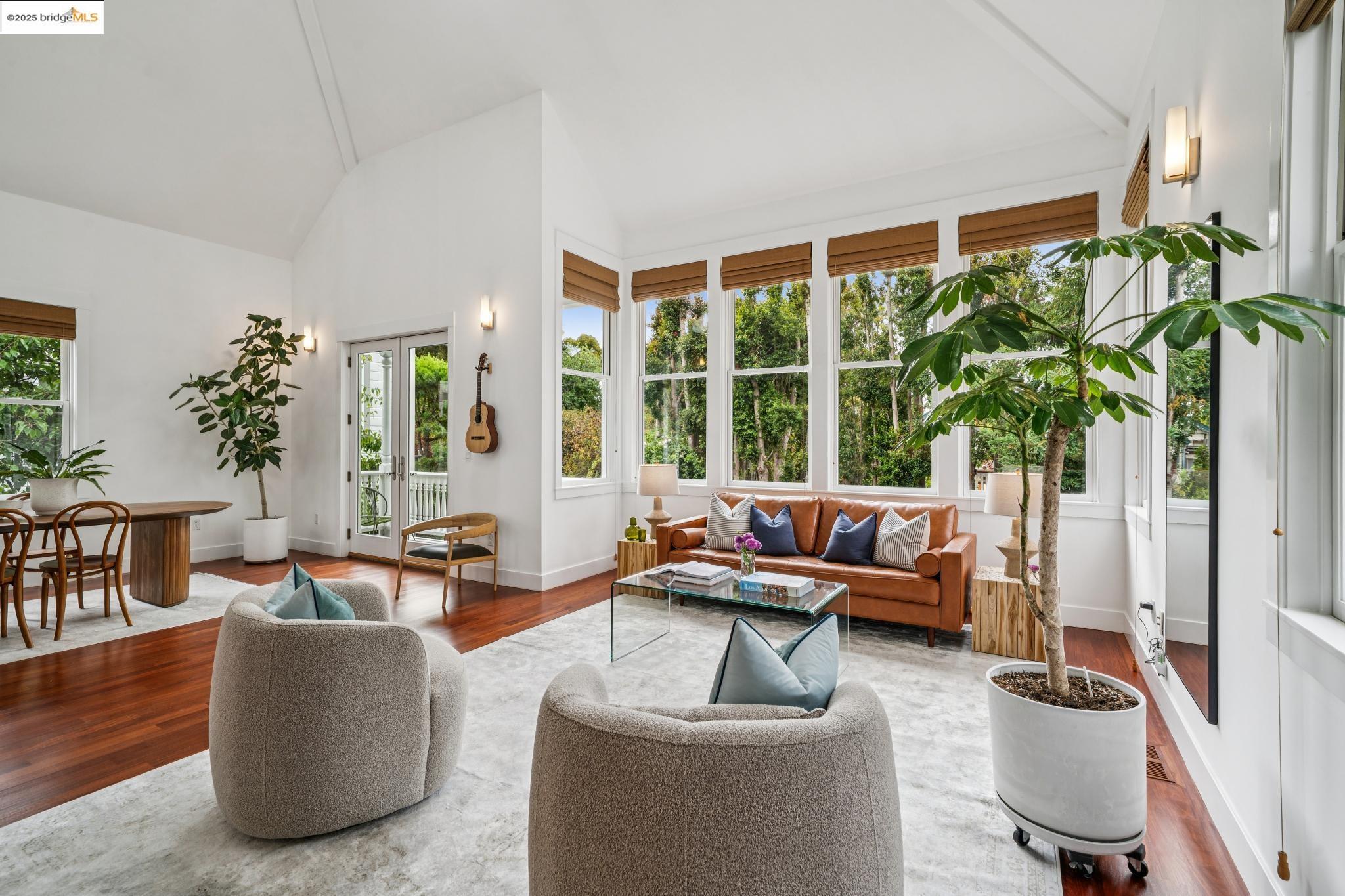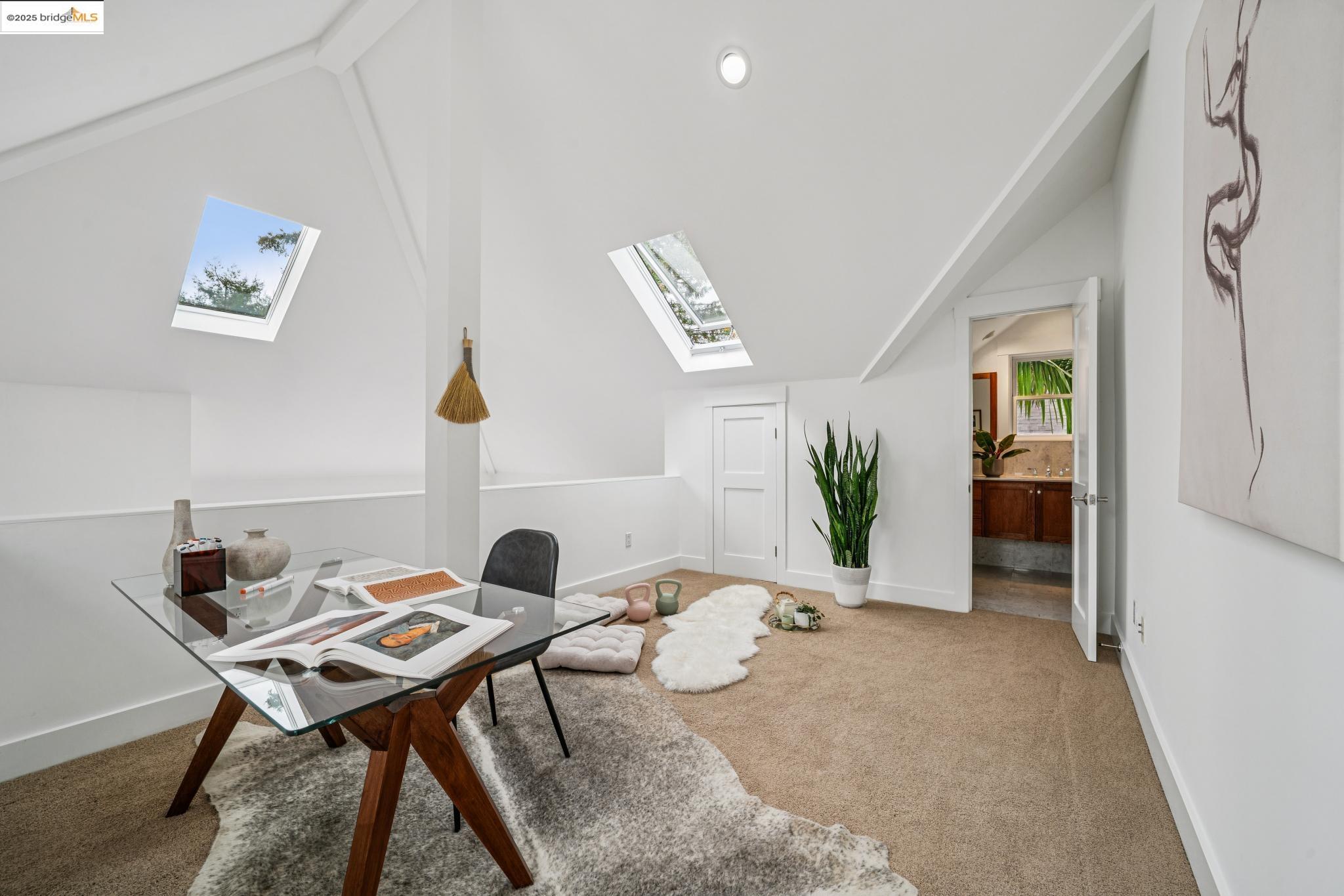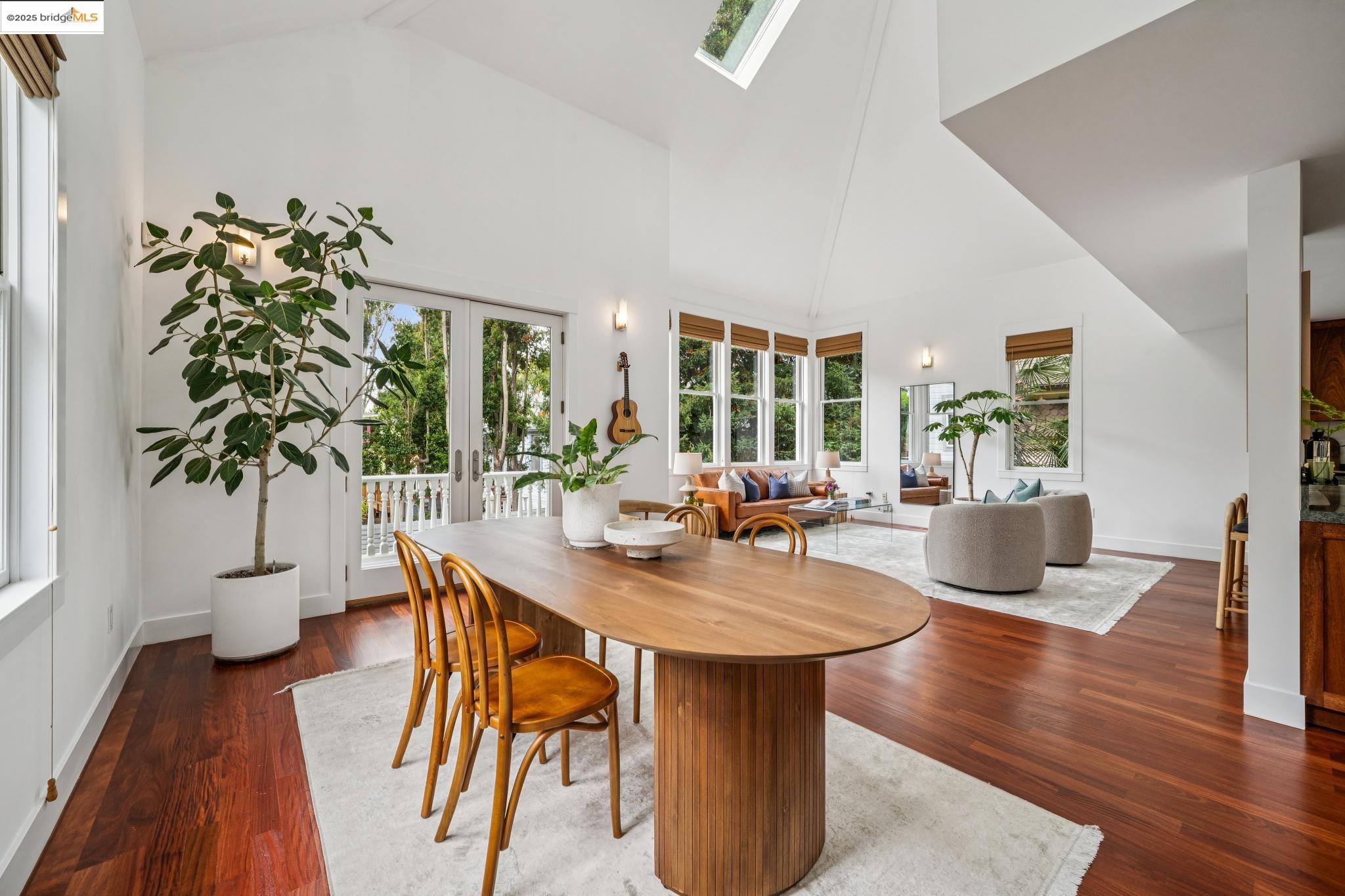 2104 Sixth Street seamlessly blends historic charm with modern style. Tucked away and off the street, with a private entrance and patio that’s equal parts retreat and city living, 2104 Sixth Street is just blocks from the restaurants, cafés and boutiques of Berkeley’s 4th Street district. With three levels inside, the entry floor features a serene and spacious primary suite with French doors to the patio, plus a second bedroom and full bath for guests, family, or a home gym. Light filters in through dramatic windows and skylights on the second level, highlighting the beautifully refinished hardwood floors and open living, dining, and kitchen space. A balcony off the dining area overlooking the private patio invites easy outdoor enjoyment. Floating above the main living area is a spacious mezzanine, adding a versatile spot for a lounge, office, or guest nook with a dedicated half bath. Distinctive architecture, private outdoor spaces, and a coveted West Berkeley location make this residence both a stunning design statement and an everyday sanctuary. Some photos may be virtually enhanced.
