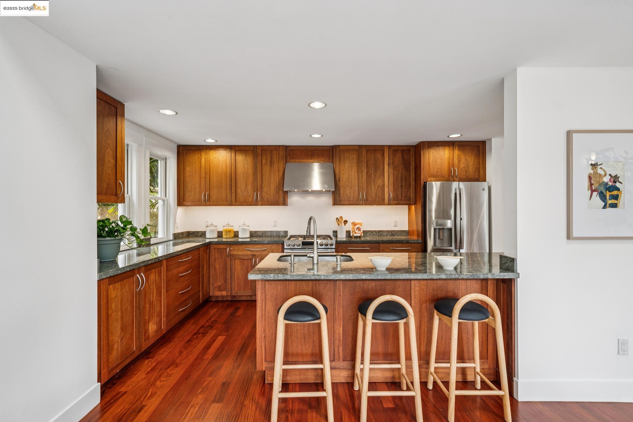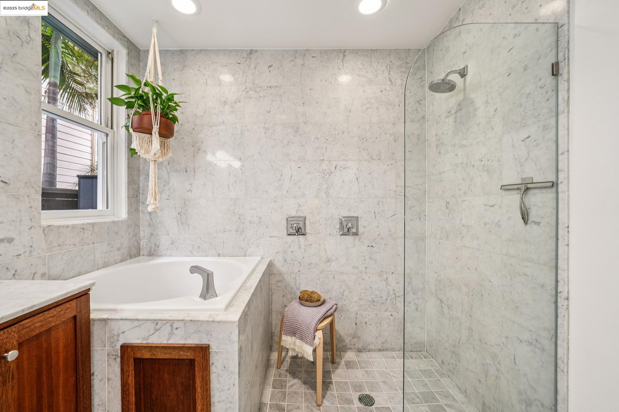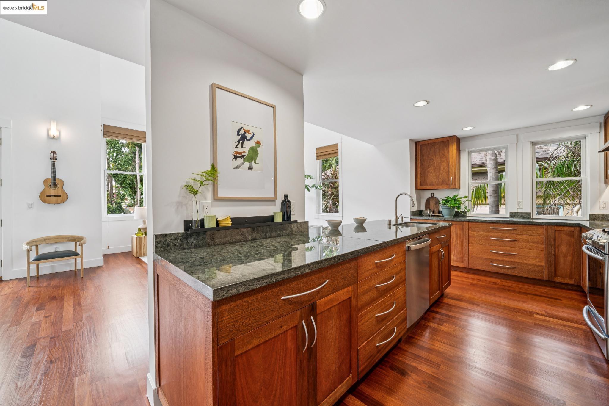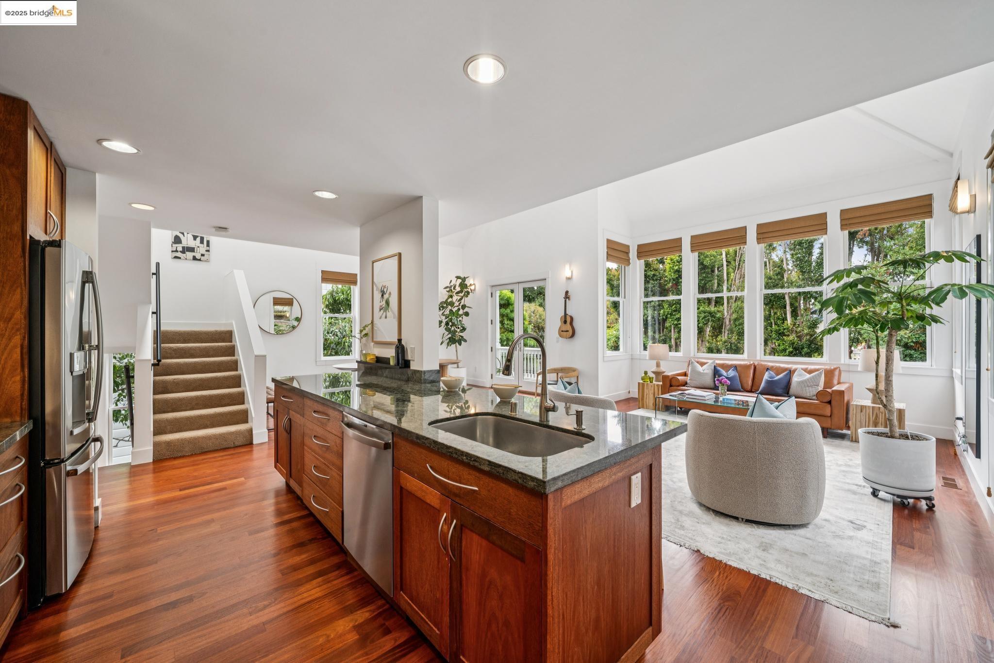 2104 Sixth Street seamlessly blends historic charm with modern style. Tucked away and off the street, with a private entrance and patio that’s equal parts retreat and city living, 2104 Sixth Street is just blocks from the restaurants, cafés and boutiques of Berkeley’s 4th Street district. With three levels inside, the entry floor features a serene and spacious primary suite with French doors to the patio, plus a second bedroom and full bath for guests, family, or a home gym. Light filters in through dramatic windows and skylights on the second level, highlighting the beautifully refinished hardwood floors and open living, dining, and kitchen space. A balcony off the dining area overlooking the private patio invites easy outdoor enjoyment. Floating above the main living area is a spacious mezzanine, adding a versatile spot for a lounge, office, or guest nook with a dedicated half bath. Distinctive architecture, private outdoor spaces, and a coveted West Berkeley location make this residence both a stunning design statement and an everyday sanctuary. Some photos may be virtually enhanced.