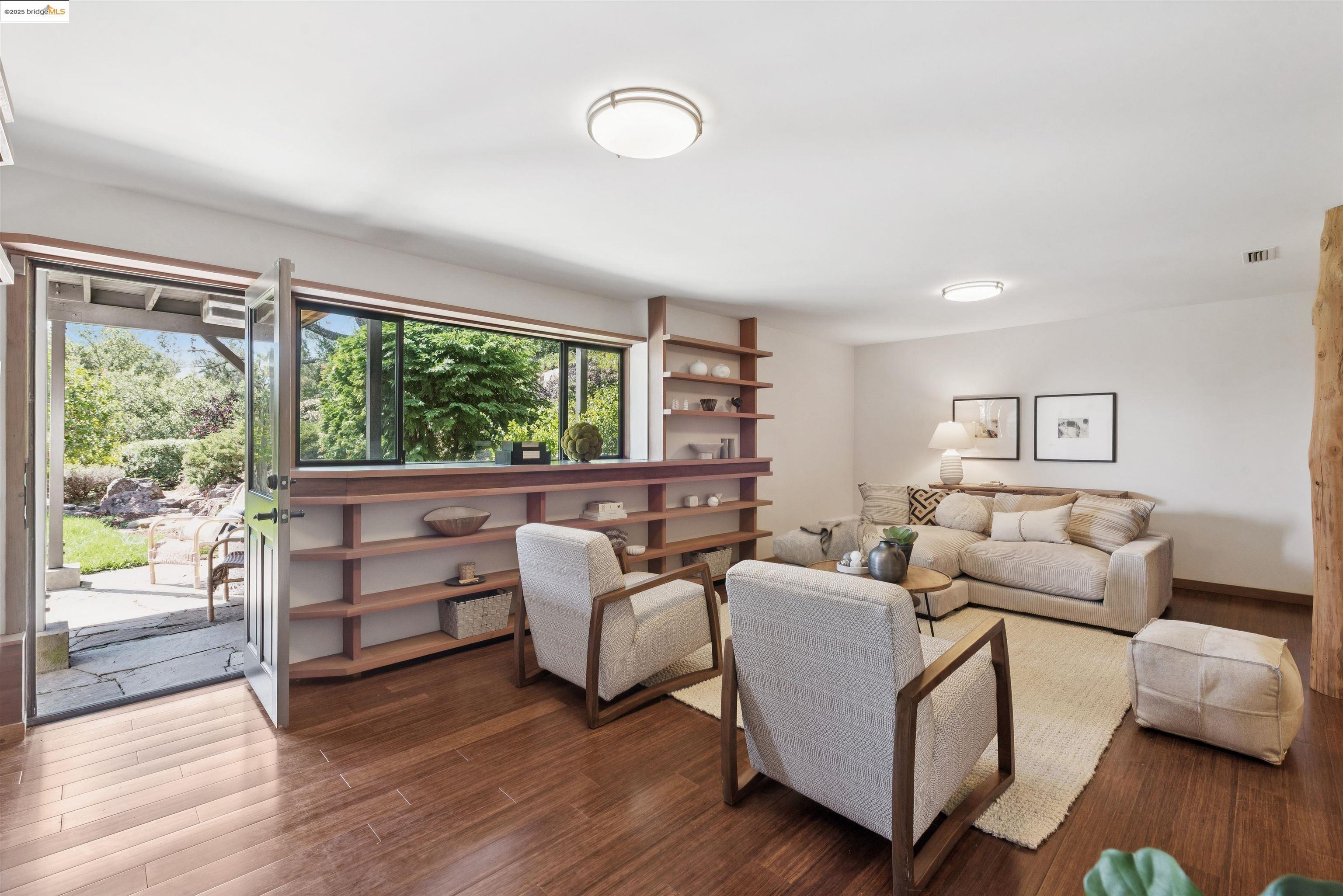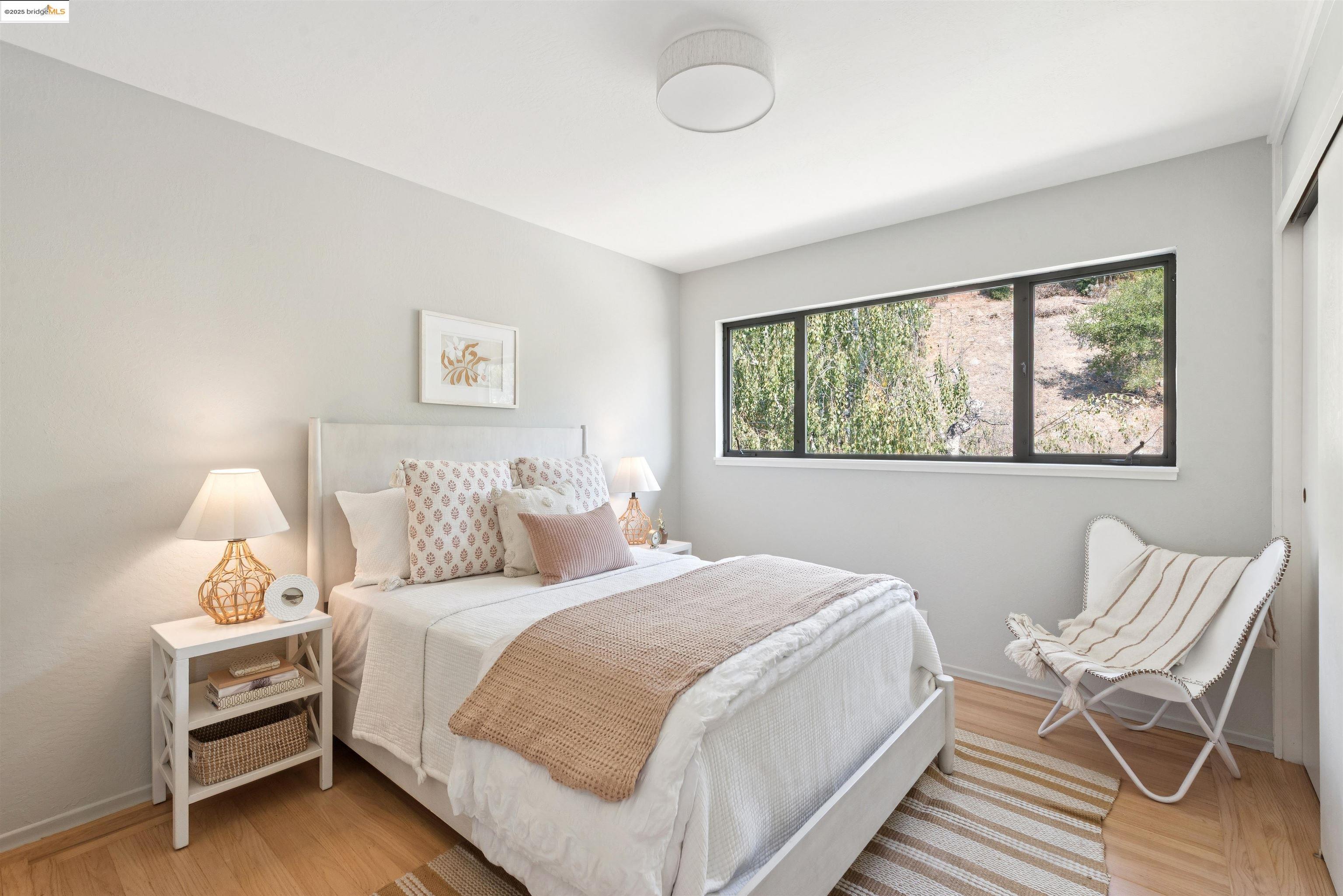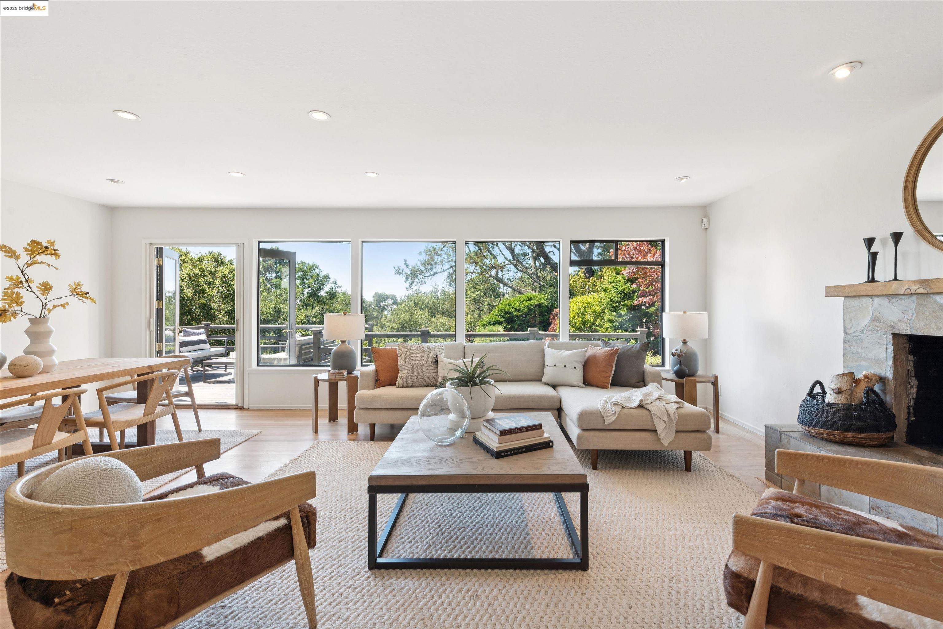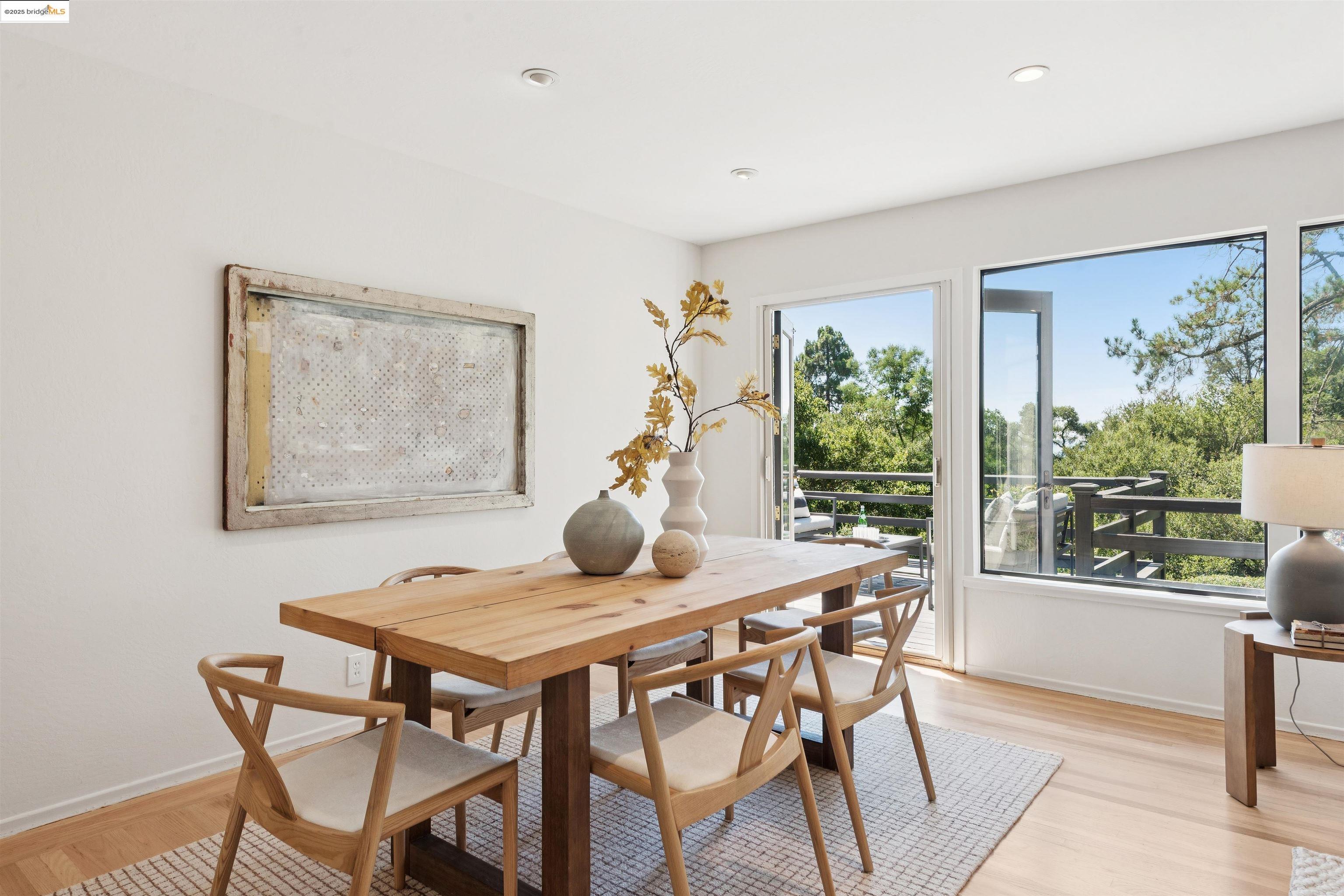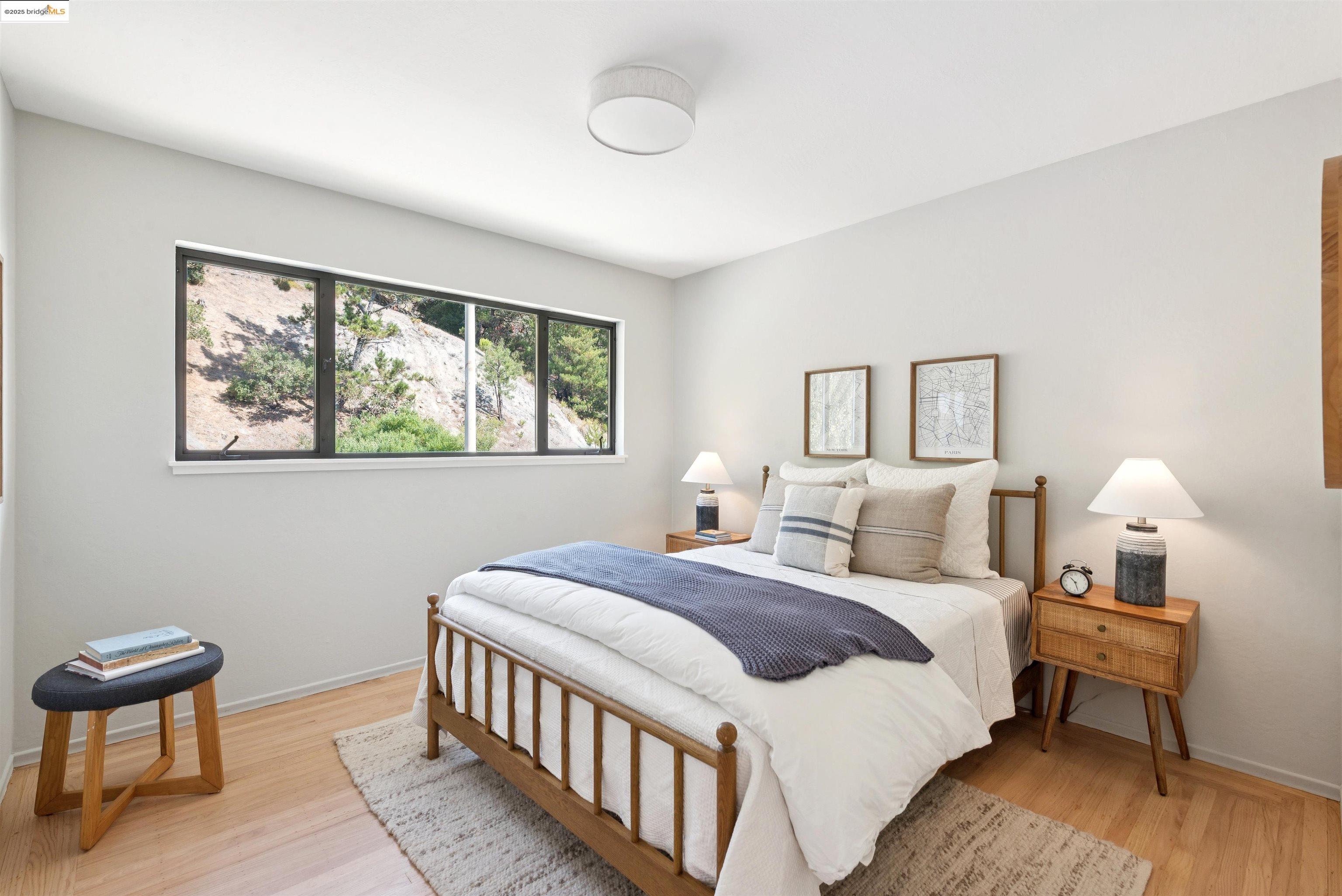 This quality, mid-century home with Bay views and an elegantly designed garden is located in the highly desirable Crestmont neighborhood. It is conveniently located to Highway 13 and Highway 580. The local community offers shopping at the top-rated Skyline Community Market and nearby Montclair. Abundant outdoor activities are available at the Oakland Hills Swim & Tennis Club, Joaquin Miller Dog Park, Redwood Regional Park, Robert’s Park, and Redwood Equestrian Arena. The main living and dining area features a stone fireplace and an expansive window wall which opens onto a deck with Bay views and overlooks a serene garden. Hardwood floors span most of the upper level. The kitchen has been recently updated with all new appliances and offers a spacious eating area plus plenty of storage. The spacious primary bedroom has two closets, bay views and an updated bathroom with a tub. There are also two other bedrooms and a second updated bathroom on this level. The lower level has a spacious family room with built-in shelving, a wet bar, an office, large storage areas, and access to the garden. There is a half bathroom, two workshop areas, and laundry facilities adjacent to the 2-car garage. The back garden has a level lawn, meandering pathways and an Asian inspired landscape area.