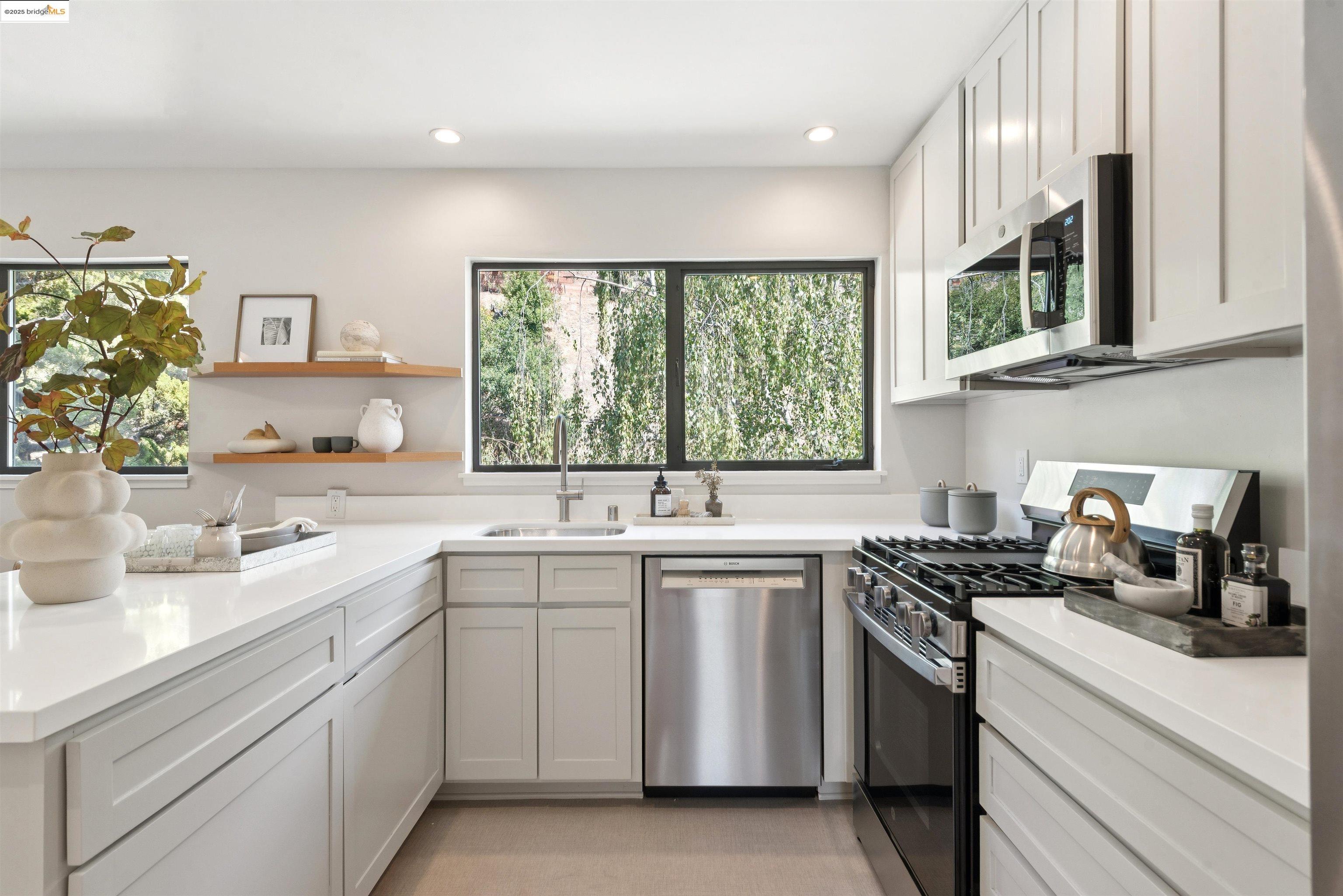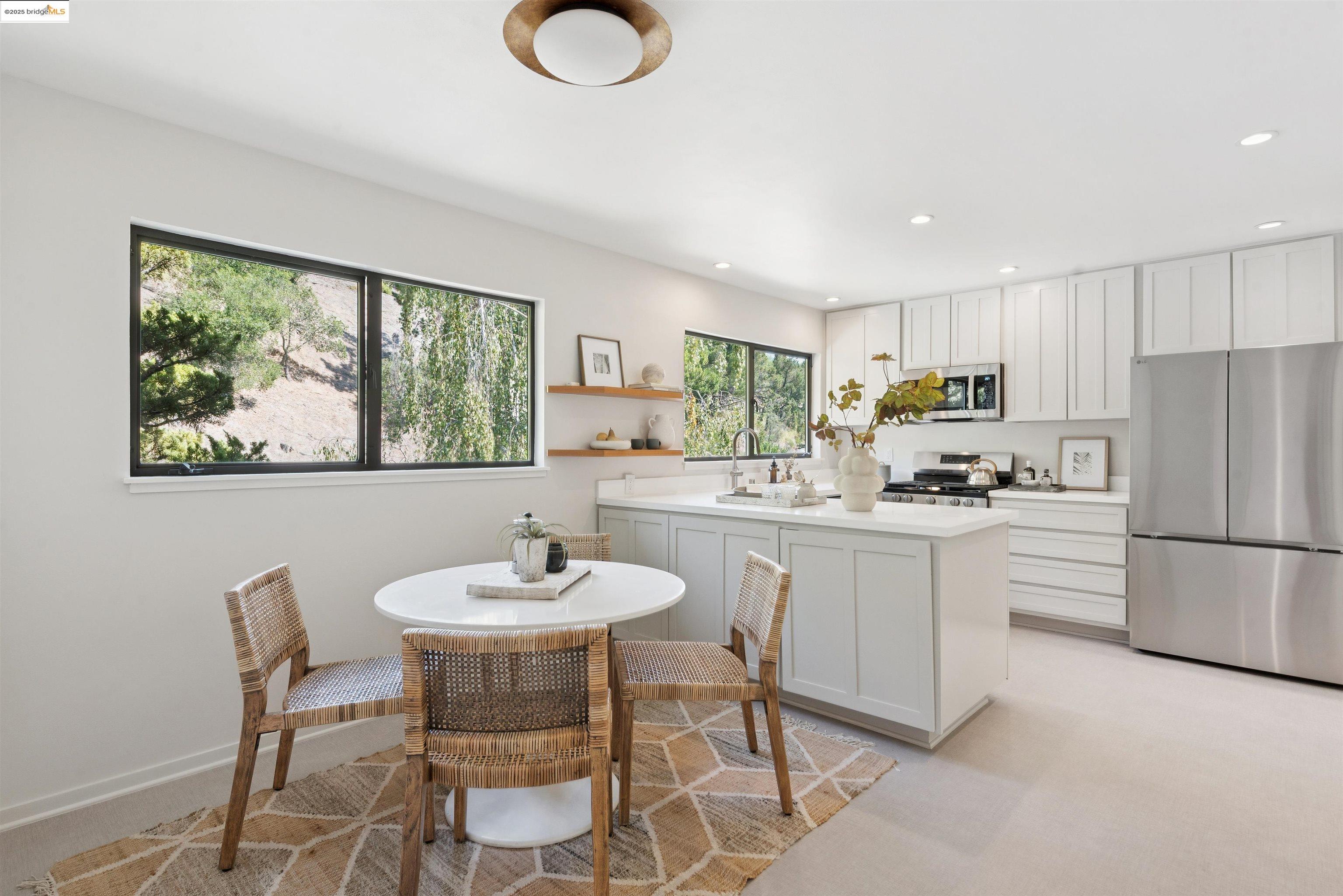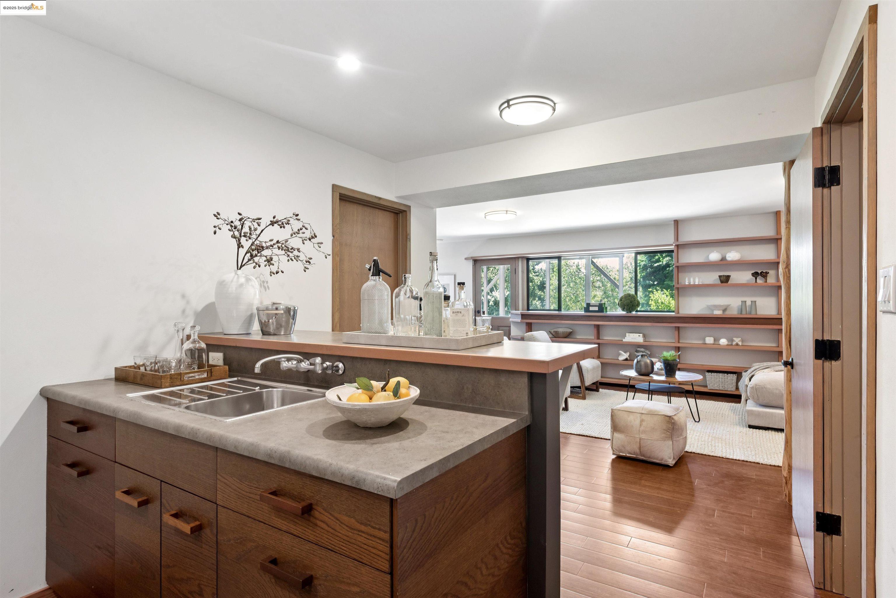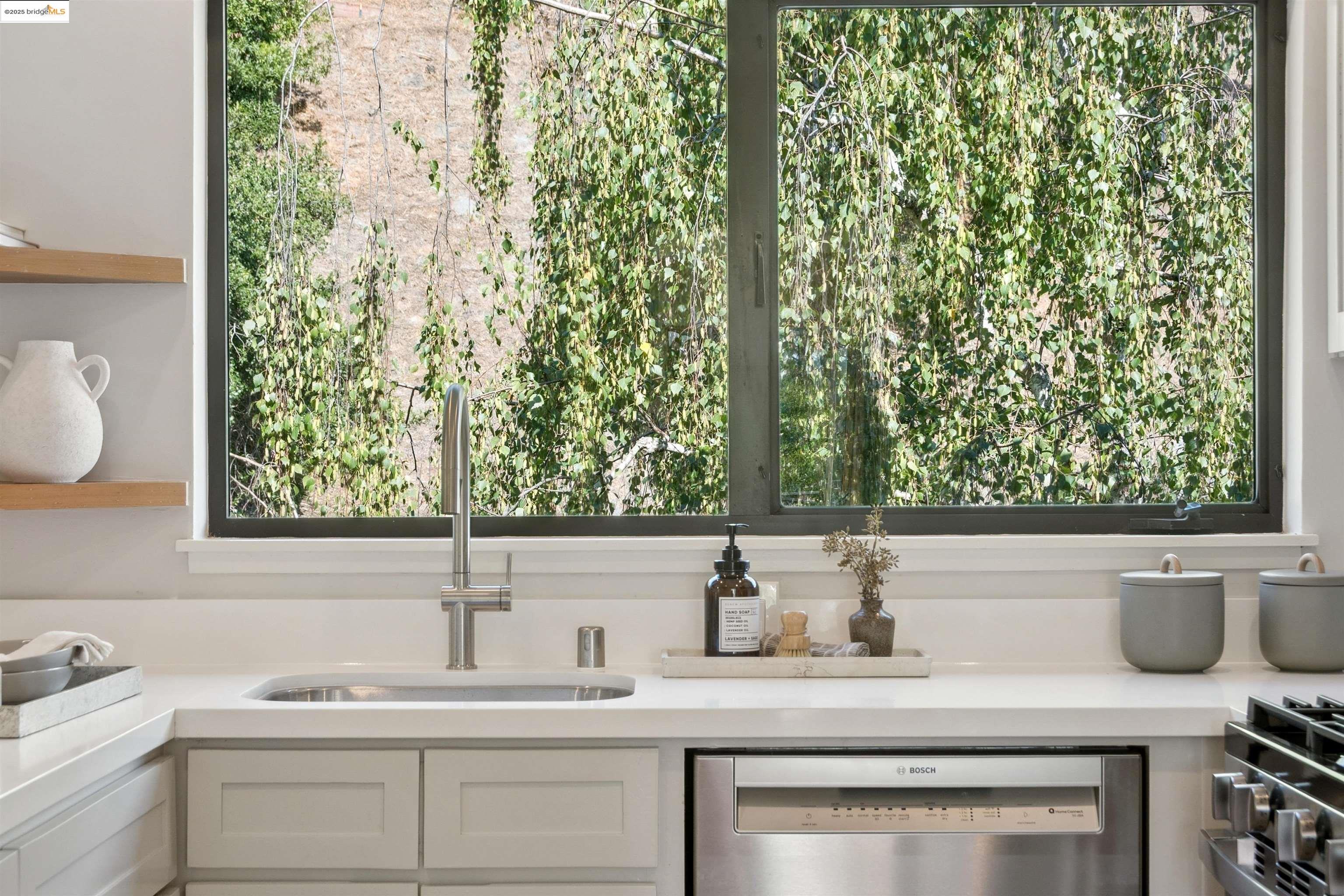 This quality, mid-century home with Bay views and an elegantly designed garden is located in the highly desirable Crestmont neighborhood. It is conveniently located to Highway 13 and Highway 580. The local community offers shopping at the top-rated Skyline Community Market and nearby Montclair. Abundant outdoor activities are available at the Oakland Hills Swim & Tennis Club, Joaquin Miller Dog Park, Redwood Regional Park, Robert’s Park, and Redwood Equestrian Arena. The main living and dining area features a stone fireplace and an expansive window wall which opens onto a deck with Bay views and overlooks a serene garden. Hardwood floors span most of the upper level. The kitchen has been recently updated with all new appliances and offers a spacious eating area plus plenty of storage. The spacious primary bedroom has two closets, bay views and an updated bathroom with a tub. There are also two other bedrooms and a second updated bathroom on this level. The lower level has a spacious family room with built-in shelving, a wet bar, an office, large storage areas, and access to the garden. There is a half bathroom, two workshop areas, and laundry facilities adjacent to the 2-car garage. The back garden has a level lawn, meandering pathways and an Asian inspired landscape area.