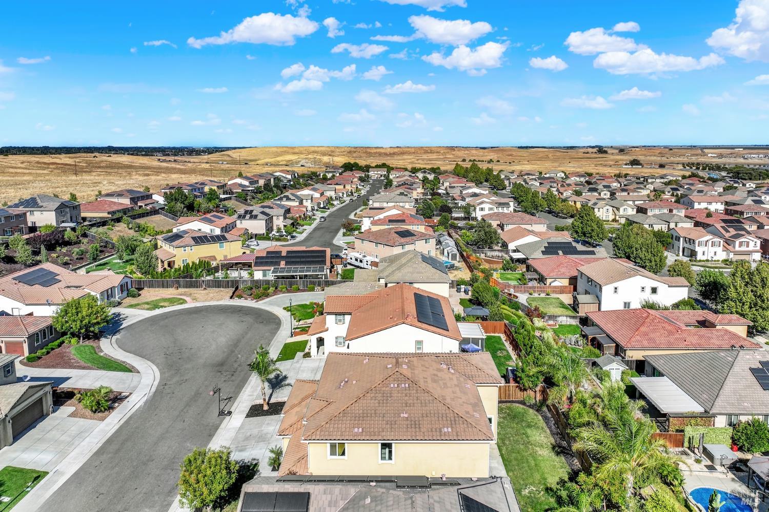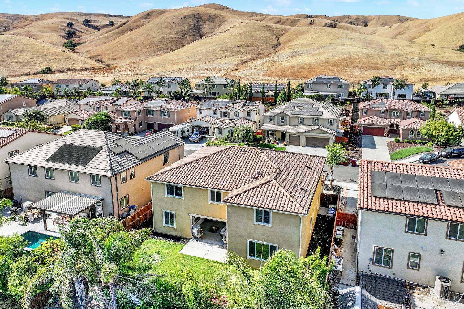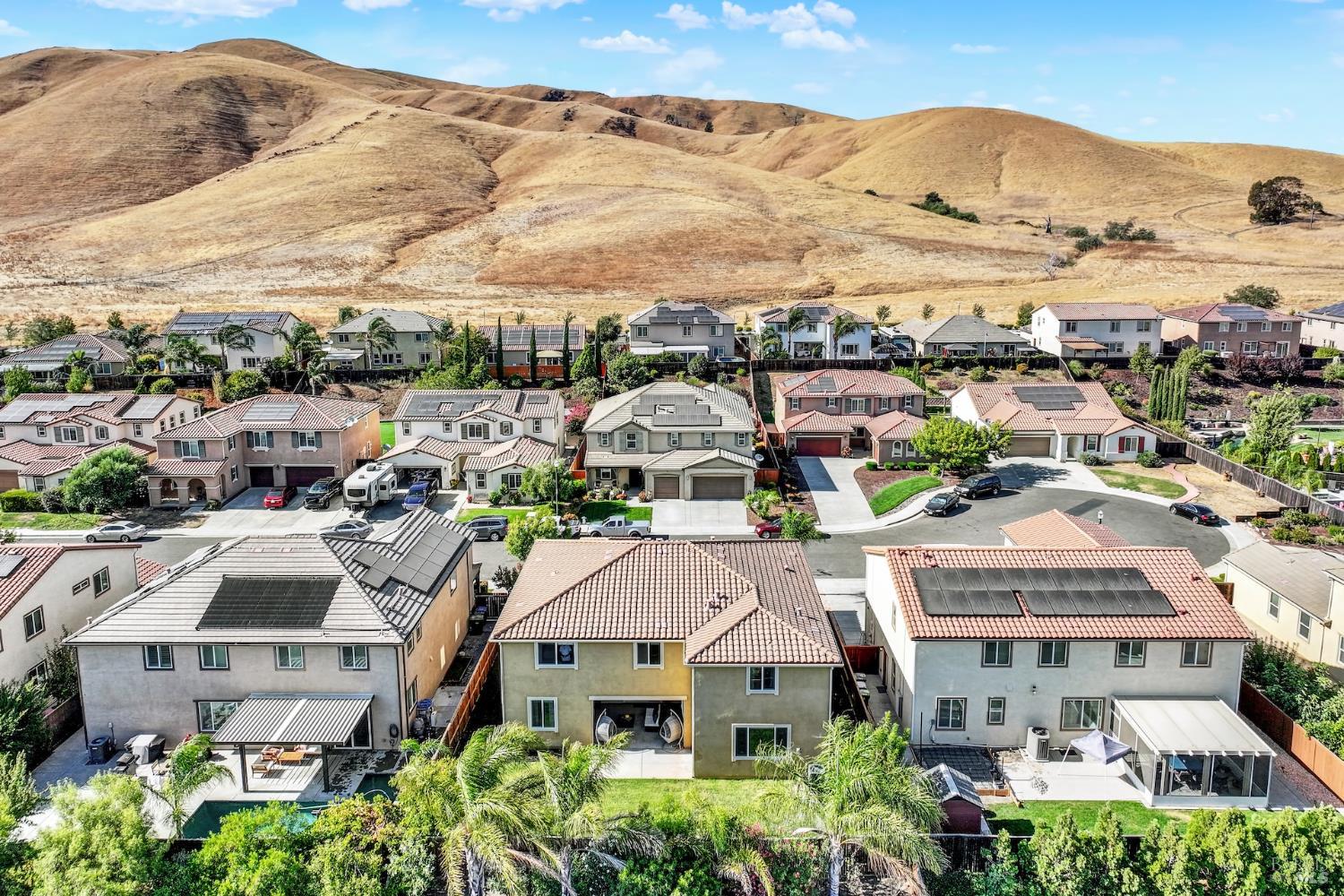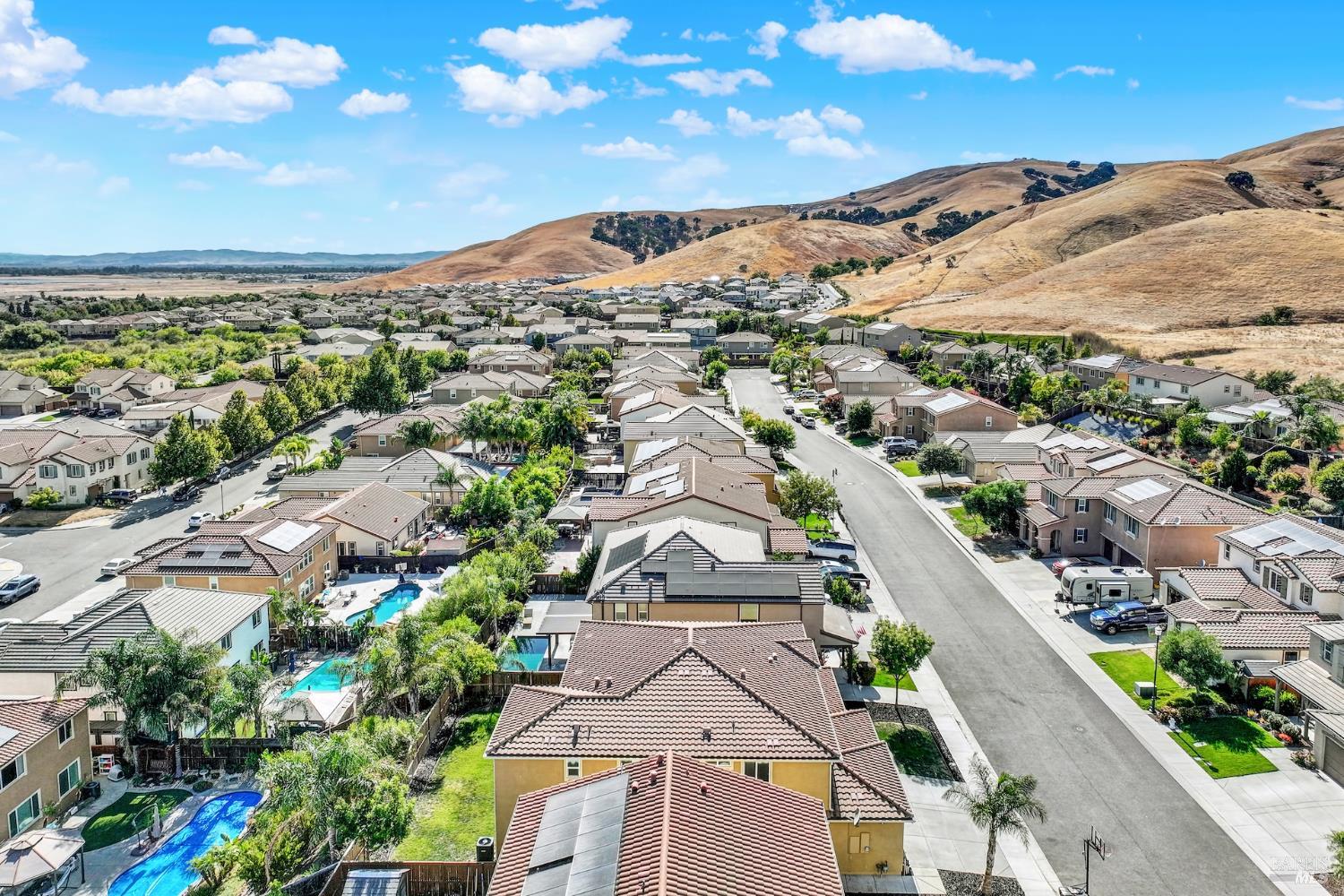 Beautifully updated home in the Gold Ridge subdivision of Fairfield. This spacious 5-bedroom, 4-bath residence offers style, comfort, and flexibility. Upgrades and features include a gourmet kitchen showcasing shaker-style cabinets, granite countertops, large center island, recessed and pendant lighting, stainless-steel appliances, laminate wood flooring throughout, fresh interior paint, dual pane windows, central heat and air, and tasteful modern updates. The bathrooms have been recently updated, providing a fresh and modern touch. The main level features a full bedroom and bath plus an additional office or possible 6th bedroom. Upstairs offers 4 additional bedrooms, a large loft provides separate living space or could easily serve as a 7th or 8th bedroom. Enjoy year-round entertaining in the inviting California room patio or take in the beautiful views of Mount Diablo from the primary suite. Additional highlights include a tile roof and a three-car garage. Located within the sought-after Travis School District, this property is just minutes from Travis Air Force Base with easy access to I-80 via Airbase Parkway.