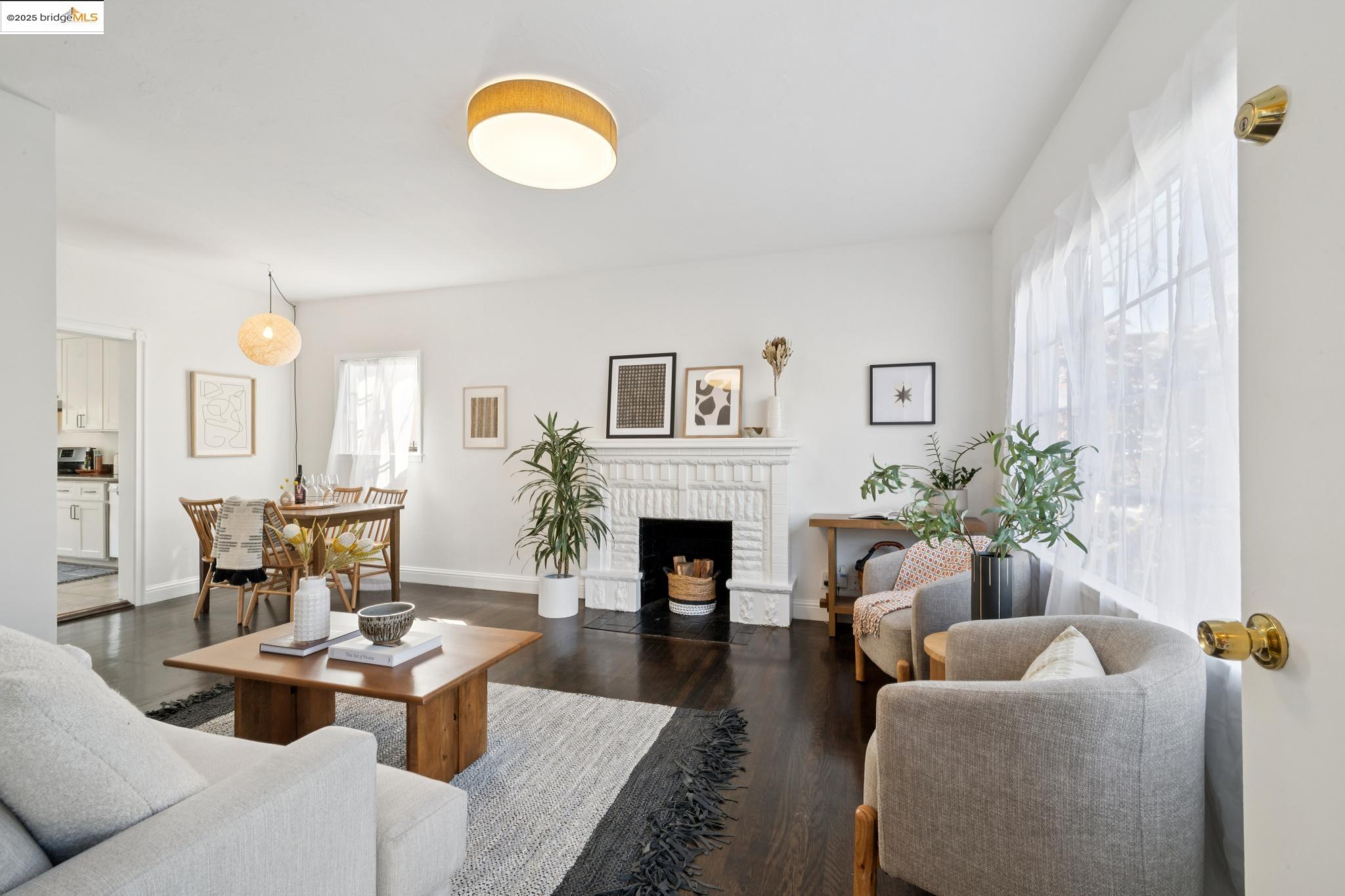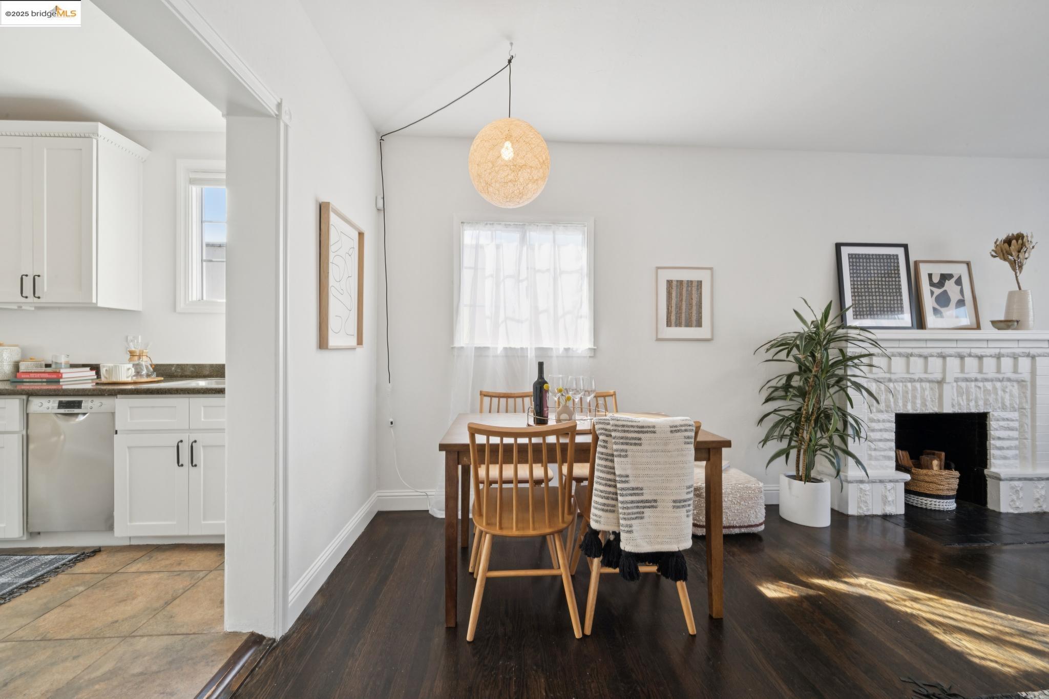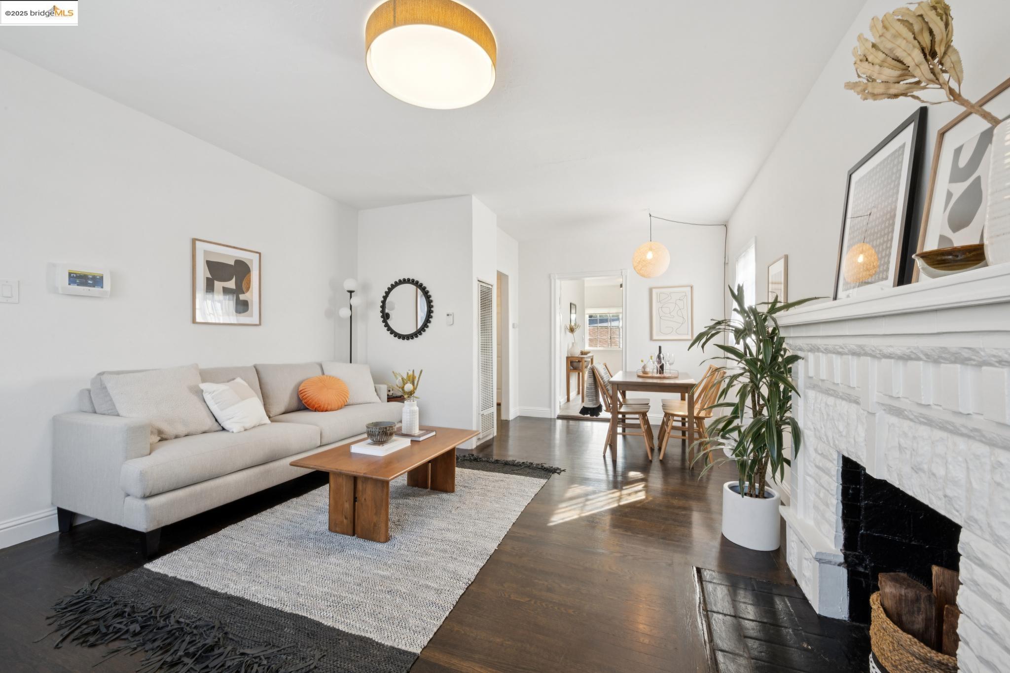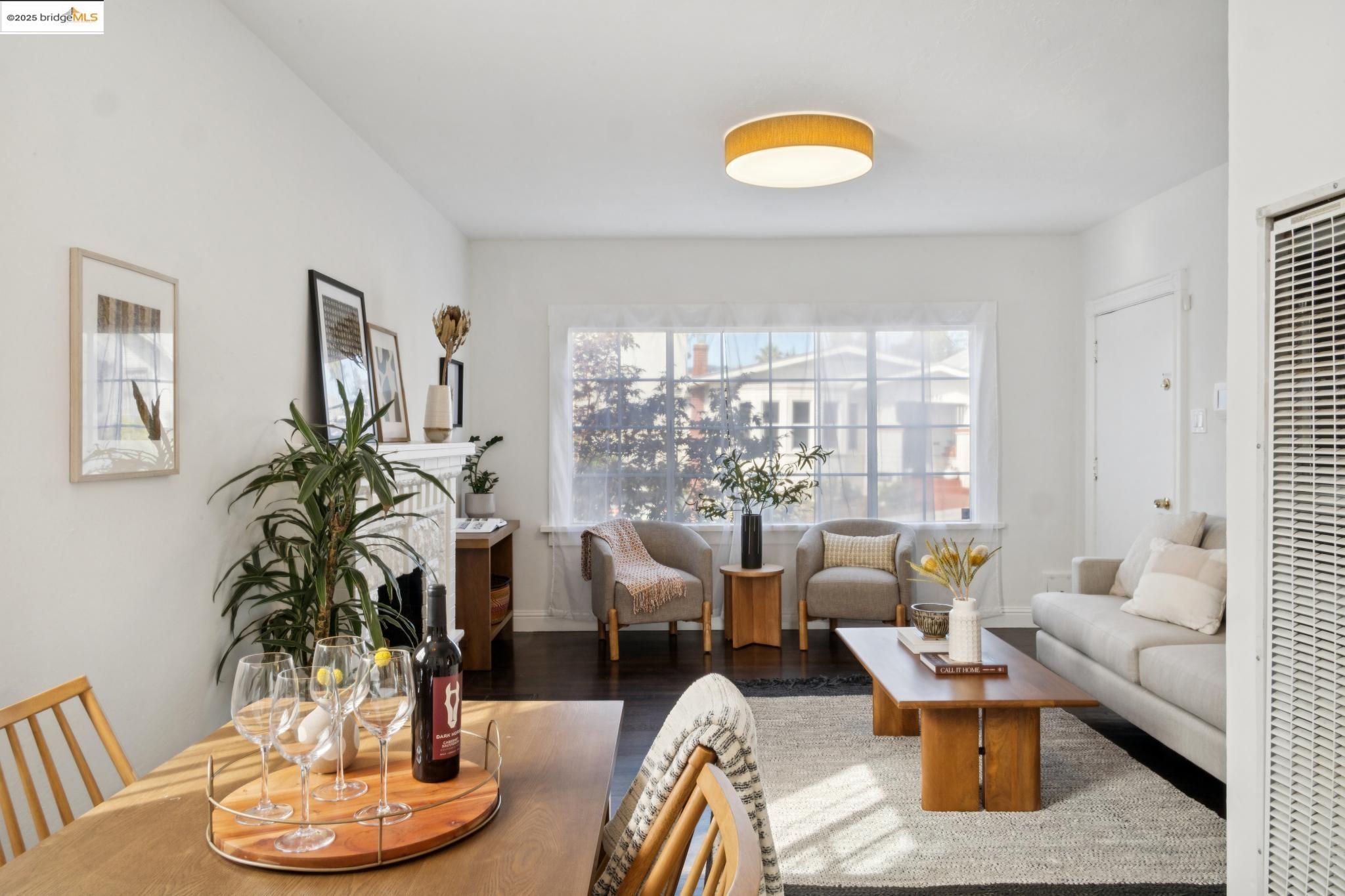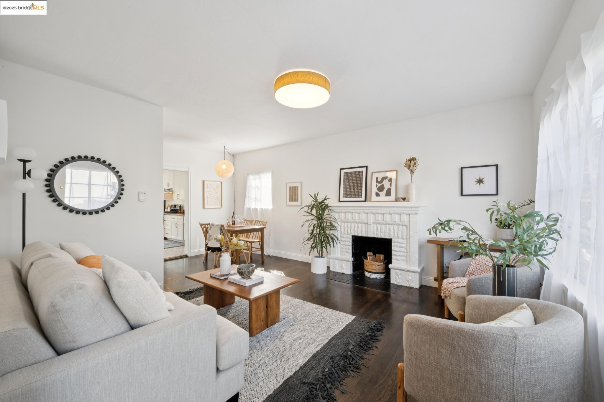Charming 2-bedroom, 1-bathroom home designed for easy living. Centrally located, this property is blocks away from Dimond District shops and restaurants, parks, public library, freeway, and public transportation. This home is anchored by a welcoming living room dining room combo with a decorative fireplace. A well-appointed kitchen provides ample counter space and storage. Off the kitchen, discover an additional versatile space ideal for an office, music nook, or crafts corner. A glass door at the end of the room offers abundant natural light and opens to an inviting sunny patio for al fresco dining or a quiet afternoon nap. Two bedrooms with functional closets. Refreshed bathroom with skylight over the tub. This home is a blend of charm and practicality - ideal for those looking for the low maintenance of a condo with the privacy and independence of a detached home.