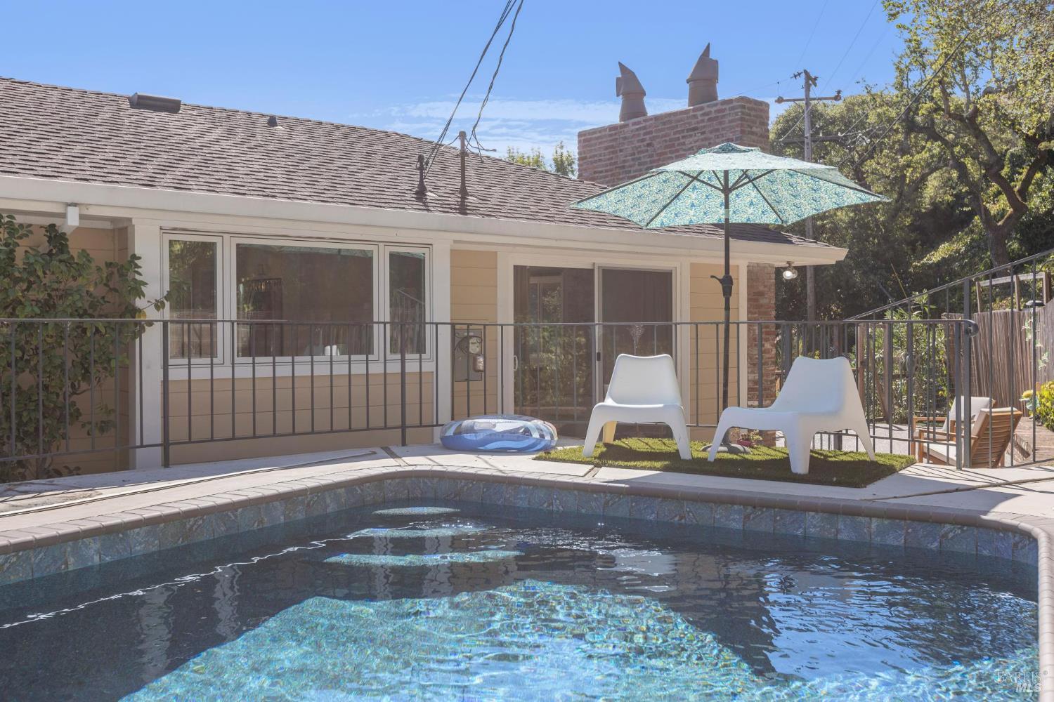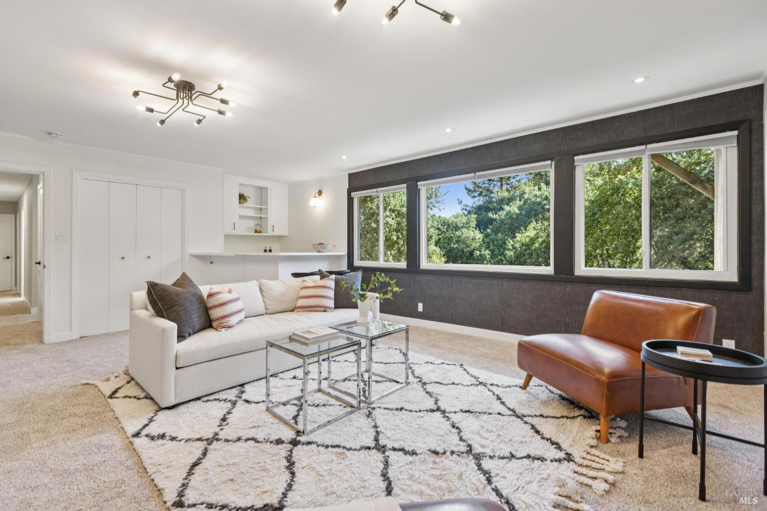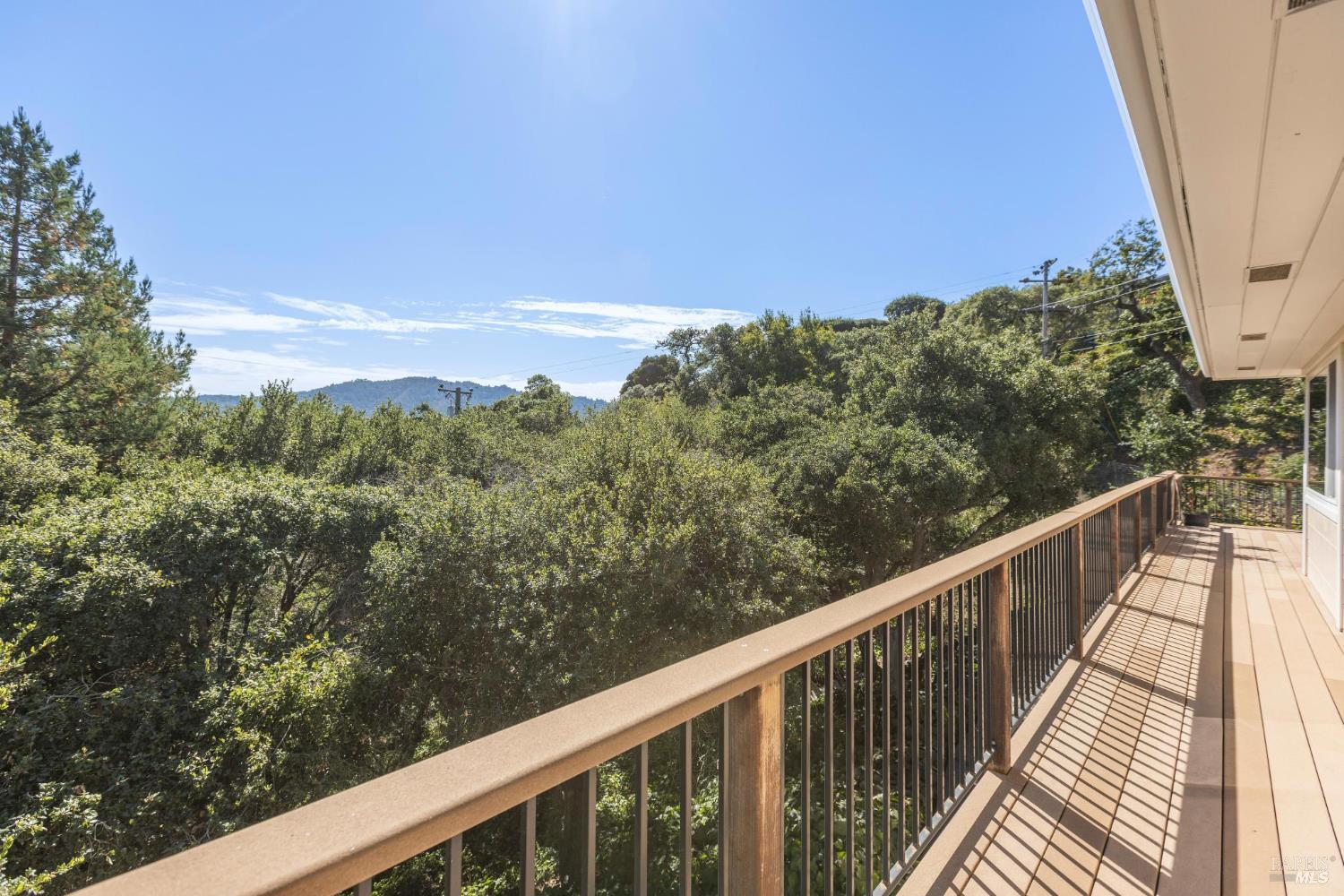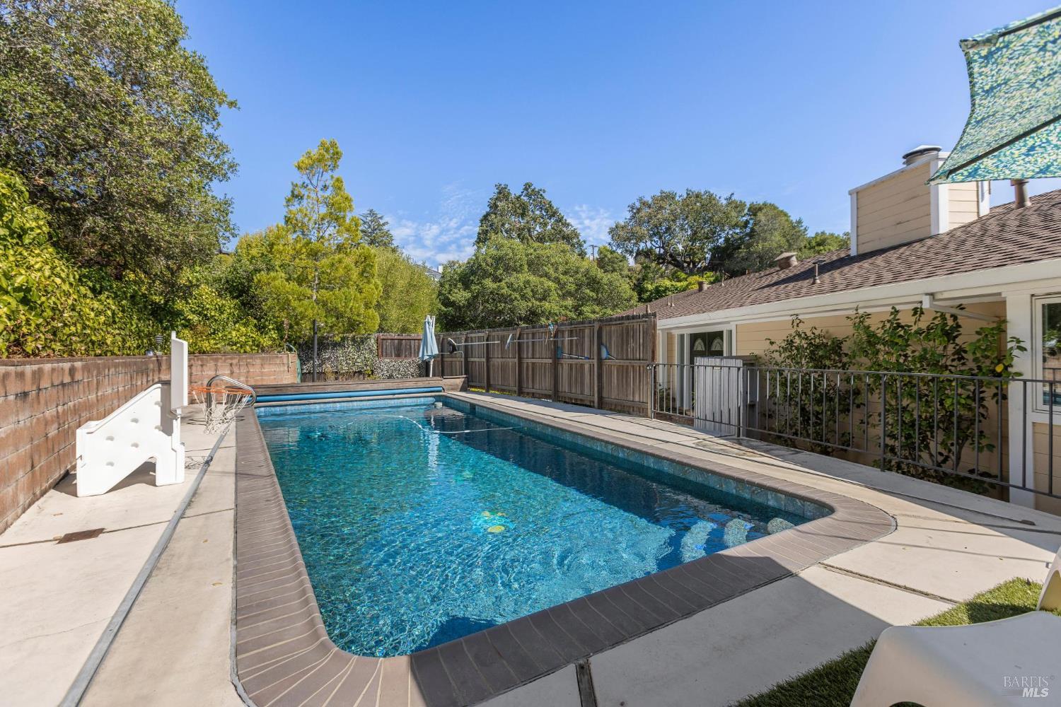 Nestled on over an acre of private, sun-drenched land on a quiet cul-de-sac, this expansive and recently remodeled hillside family home offers the ideal blend of space, comfort, and convenience. With sprawling interiors designed for both relaxed living and stylish entertaining, this home is a rare find in one of Marin's most desirable settings. The main level features a formal living room, dining room, den, a spacious eat-in kitchen with expansive marble island, five bedrooms, and three bathrooms. The serene Primary Bedroom includes a remodeled en-suite bathroom with soaking tub, and a private deck to take in glowing Mt. Tam sunsets. The backyard features a sparkling pool framed by generous decks and hillside views. Perfect for poolside al fresco dining, this outdoor oasis seamlessly extends the living space. Downstairs, you'll find a large family room with a built-in bar, dedicated exercise room complete with rubber flooring and sliding glass doors, a sixth bedroom, another remodeled bathroom, and an attached two-car garage. Located just minutes from the Larkspur ferry and Highway 101, this retreat in award-winning Kentfield school district offers easy access to the best of the Bay Area while maintaining the tranquility of a private, natural setting.