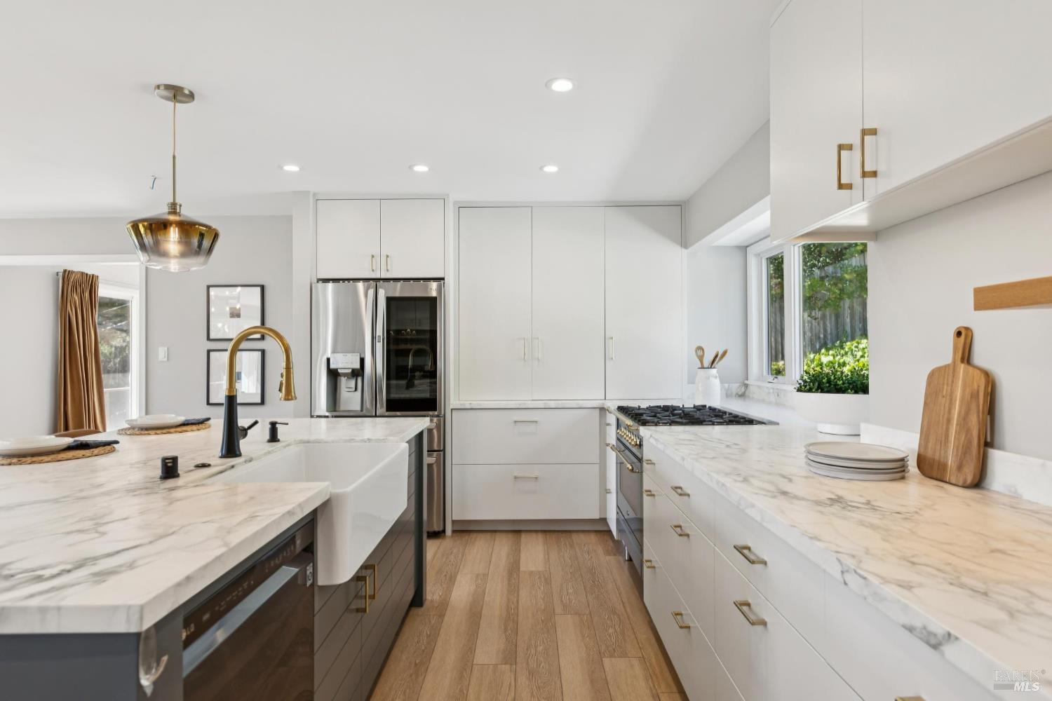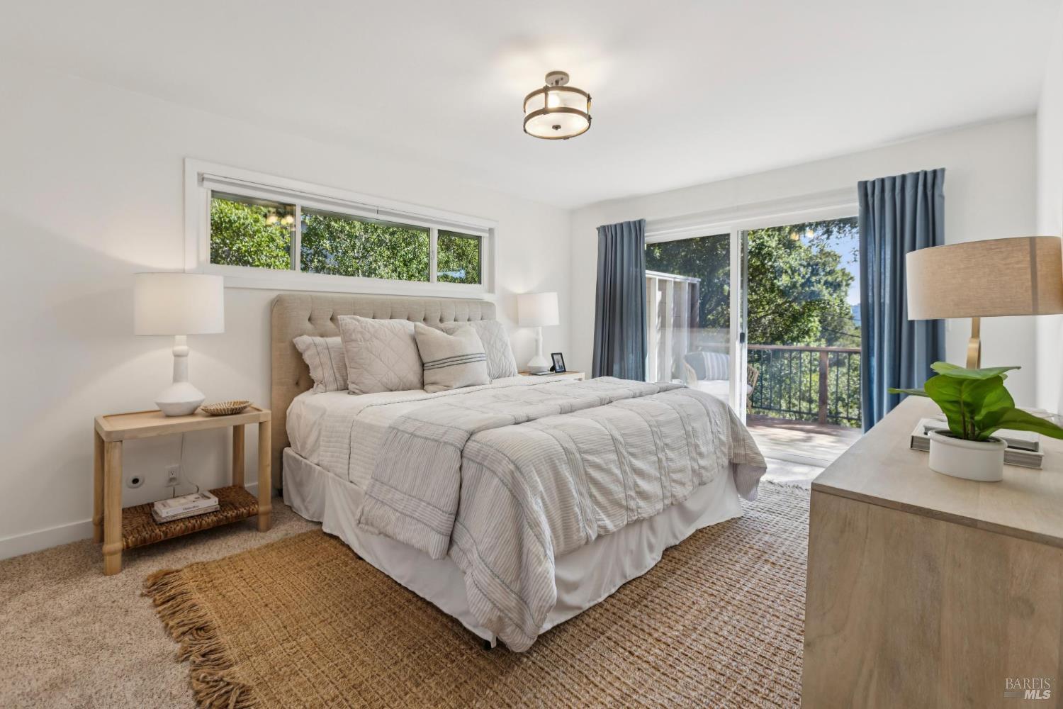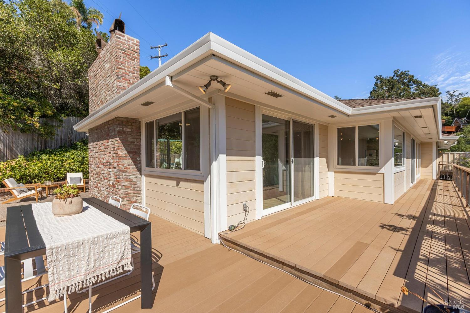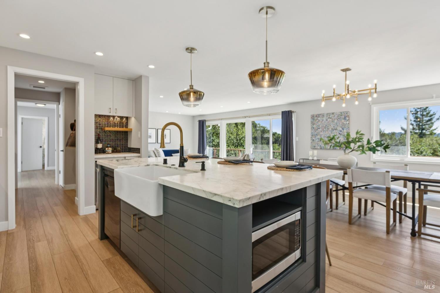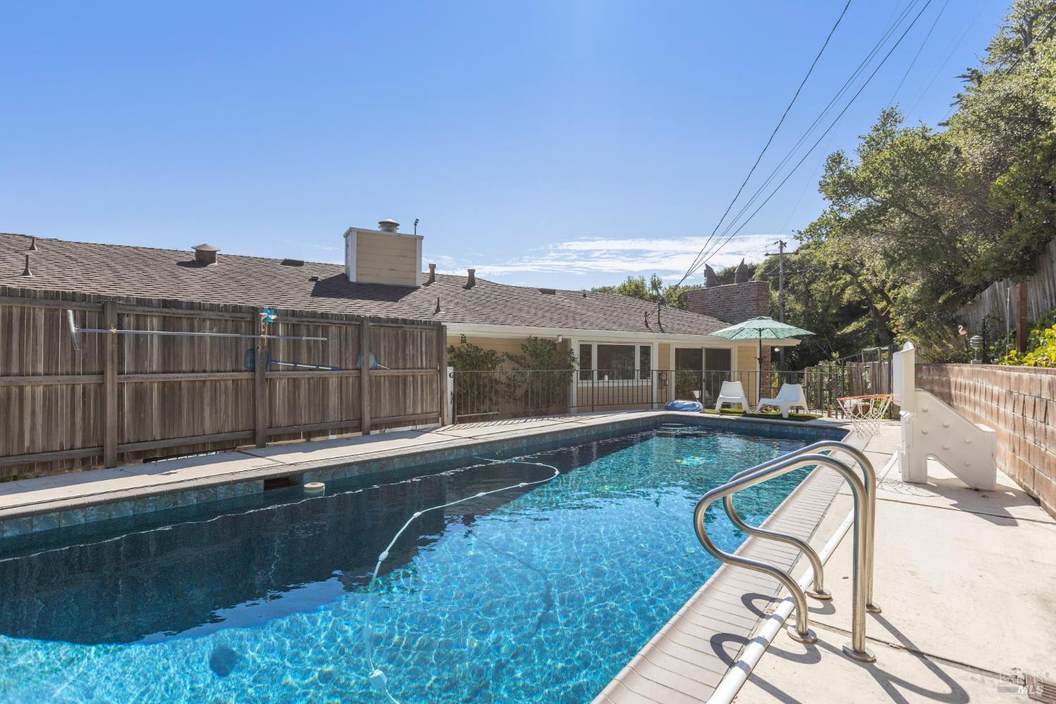 Nestled on over an acre of private, sun-drenched land on a quiet cul-de-sac, this expansive and recently remodeled hillside family home offers the ideal blend of space, comfort, and convenience. With sprawling interiors designed for both relaxed living and stylish entertaining, this home is a rare find in one of Marin's most desirable settings. The main level features a formal living room, dining room, den, a spacious eat-in kitchen with expansive marble island, five bedrooms, and three bathrooms. The serene Primary Bedroom includes a remodeled en-suite bathroom with soaking tub, and a private deck to take in glowing Mt. Tam sunsets. The backyard features a sparkling pool framed by generous decks and hillside views. Perfect for poolside al fresco dining, this outdoor oasis seamlessly extends the living space. Downstairs, you'll find a large family room with a built-in bar, dedicated exercise room complete with rubber flooring and sliding glass doors, a sixth bedroom, another remodeled bathroom, and an attached two-car garage. Located just minutes from the Larkspur ferry and Highway 101, this retreat in award-winning Kentfield school district offers easy access to the best of the Bay Area while maintaining the tranquility of a private, natural setting.