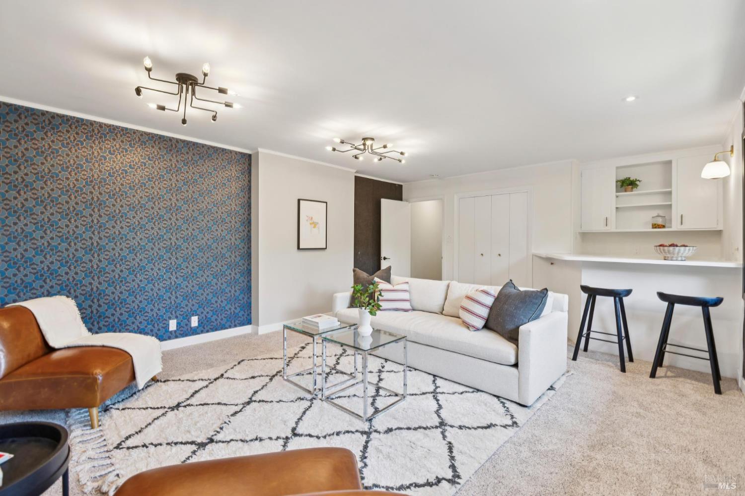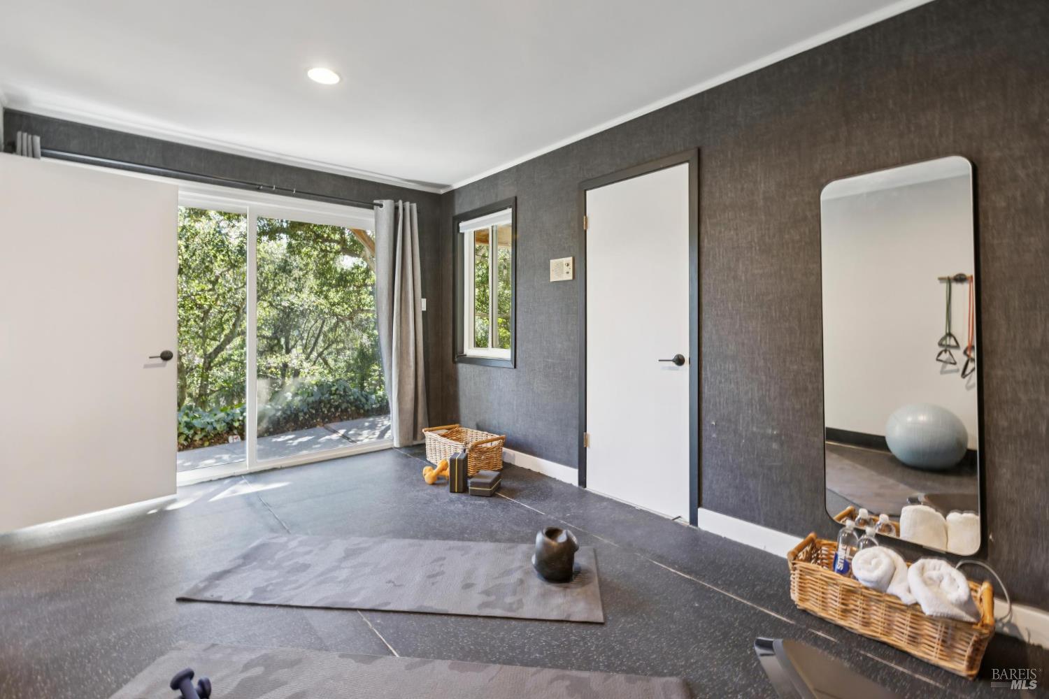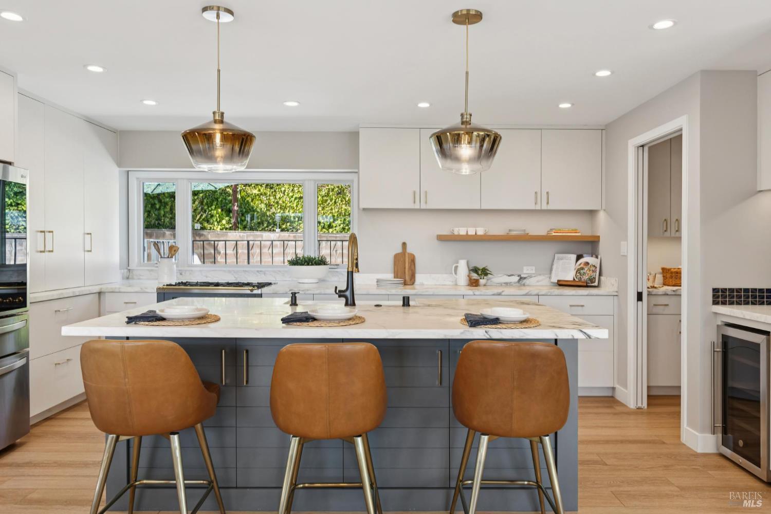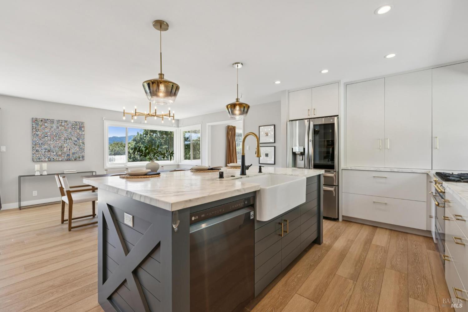 Nestled on over an acre of private, sun-drenched land on a quiet cul-de-sac, this expansive and recently remodeled hillside family home offers the ideal blend of space, comfort, and convenience. With sprawling interiors designed for both relaxed living and stylish entertaining, this home is a rare find in one of Marin's most desirable settings. The main level features a formal living room, dining room, den, a spacious eat-in kitchen with expansive marble island, five bedrooms, and three bathrooms. The serene Primary Bedroom includes a remodeled en-suite bathroom with soaking tub, and a private deck to take in glowing Mt. Tam sunsets. The backyard features a sparkling pool framed by generous decks and hillside views. Perfect for poolside al fresco dining, this outdoor oasis seamlessly extends the living space. Downstairs, you'll find a large family room with a built-in bar, dedicated exercise room complete with rubber flooring and sliding glass doors, a sixth bedroom, another remodeled bathroom, and an attached two-car garage. Located just minutes from the Larkspur ferry and Highway 101, this retreat in award-winning Kentfield school district offers easy access to the best of the Bay Area while maintaining the tranquility of a private, natural setting.