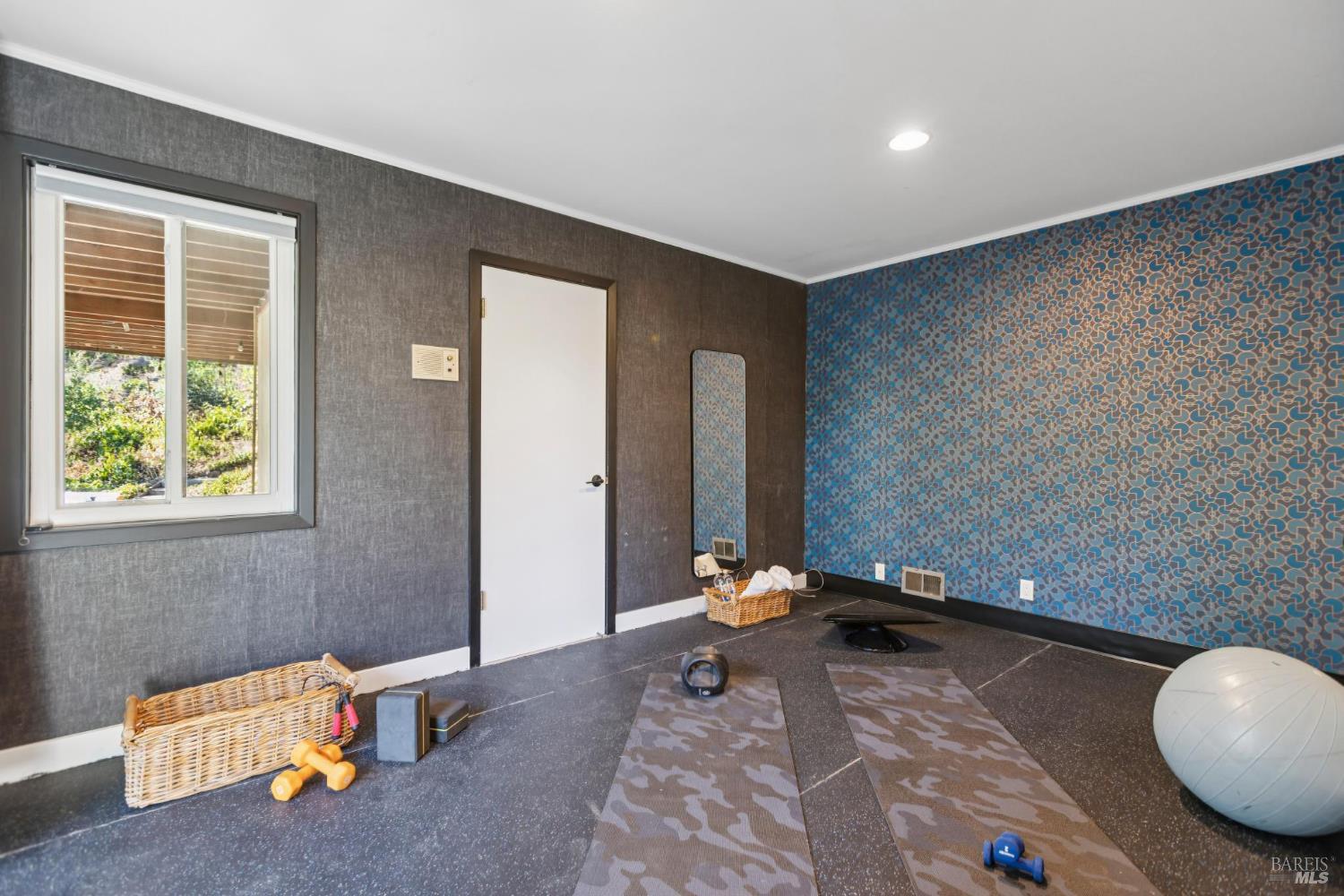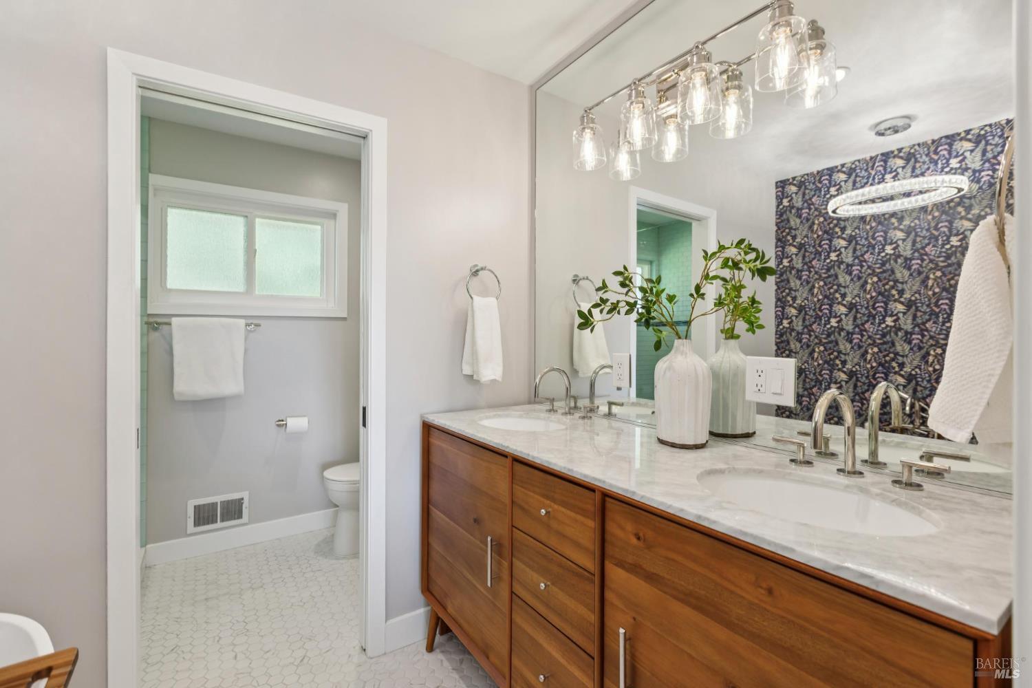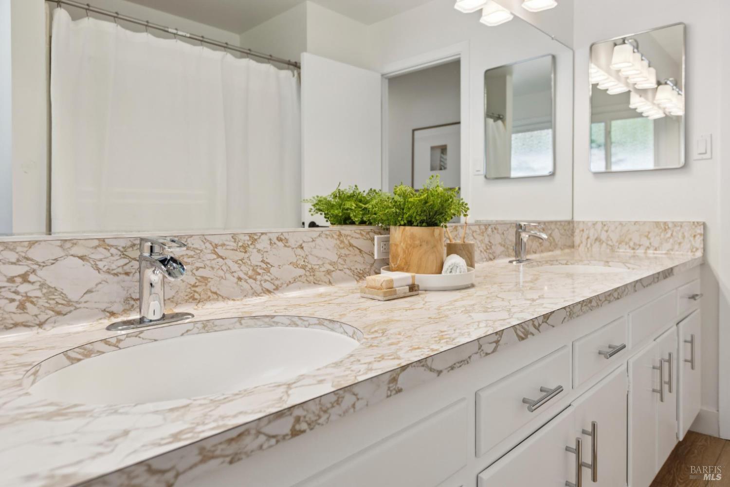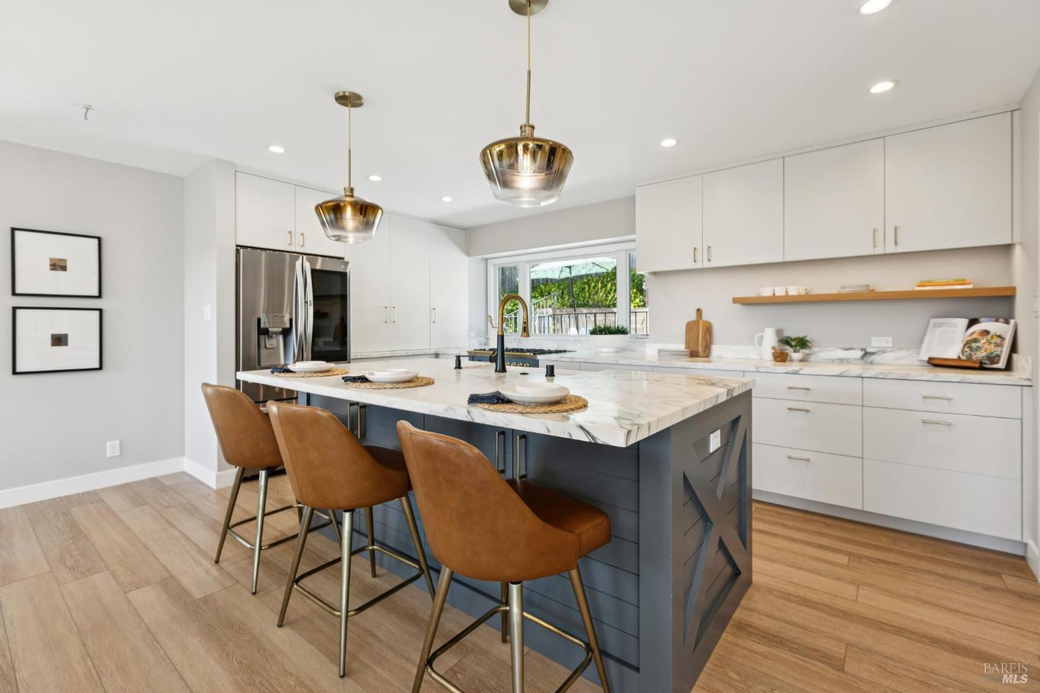 Nestled on over an acre of private, sun-drenched land on a quiet cul-de-sac, this expansive and recently remodeled hillside family home offers the ideal blend of space, comfort, and convenience. With sprawling interiors designed for both relaxed living and stylish entertaining, this home is a rare find in one of Marin's most desirable settings. The main level features a formal living room, dining room, den, a spacious eat-in kitchen with expansive marble island, five bedrooms, and three bathrooms. The serene Primary Bedroom includes a remodeled en-suite bathroom with soaking tub, and a private deck to take in glowing Mt. Tam sunsets. The backyard features a sparkling pool framed by generous decks and hillside views. Perfect for poolside al fresco dining, this outdoor oasis seamlessly extends the living space. Downstairs, you'll find a large family room with a built-in bar, dedicated exercise room complete with rubber flooring and sliding glass doors, a sixth bedroom, another remodeled bathroom, and an attached two-car garage. Located just minutes from the Larkspur ferry and Highway 101, this retreat in award-winning Kentfield school district offers easy access to the best of the Bay Area while maintaining the tranquility of a private, natural setting.