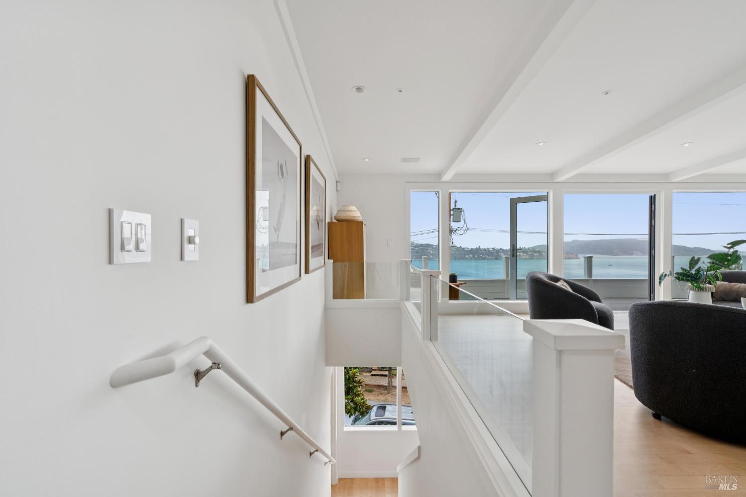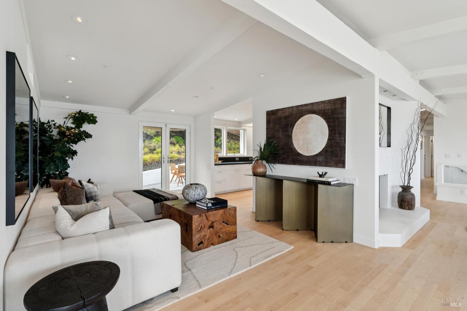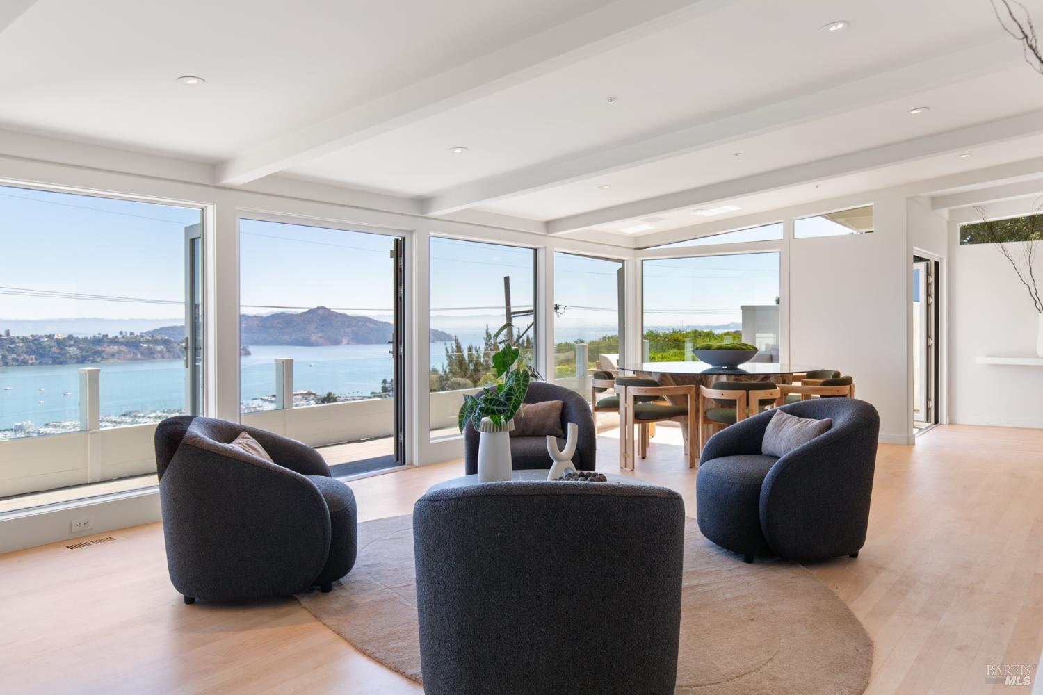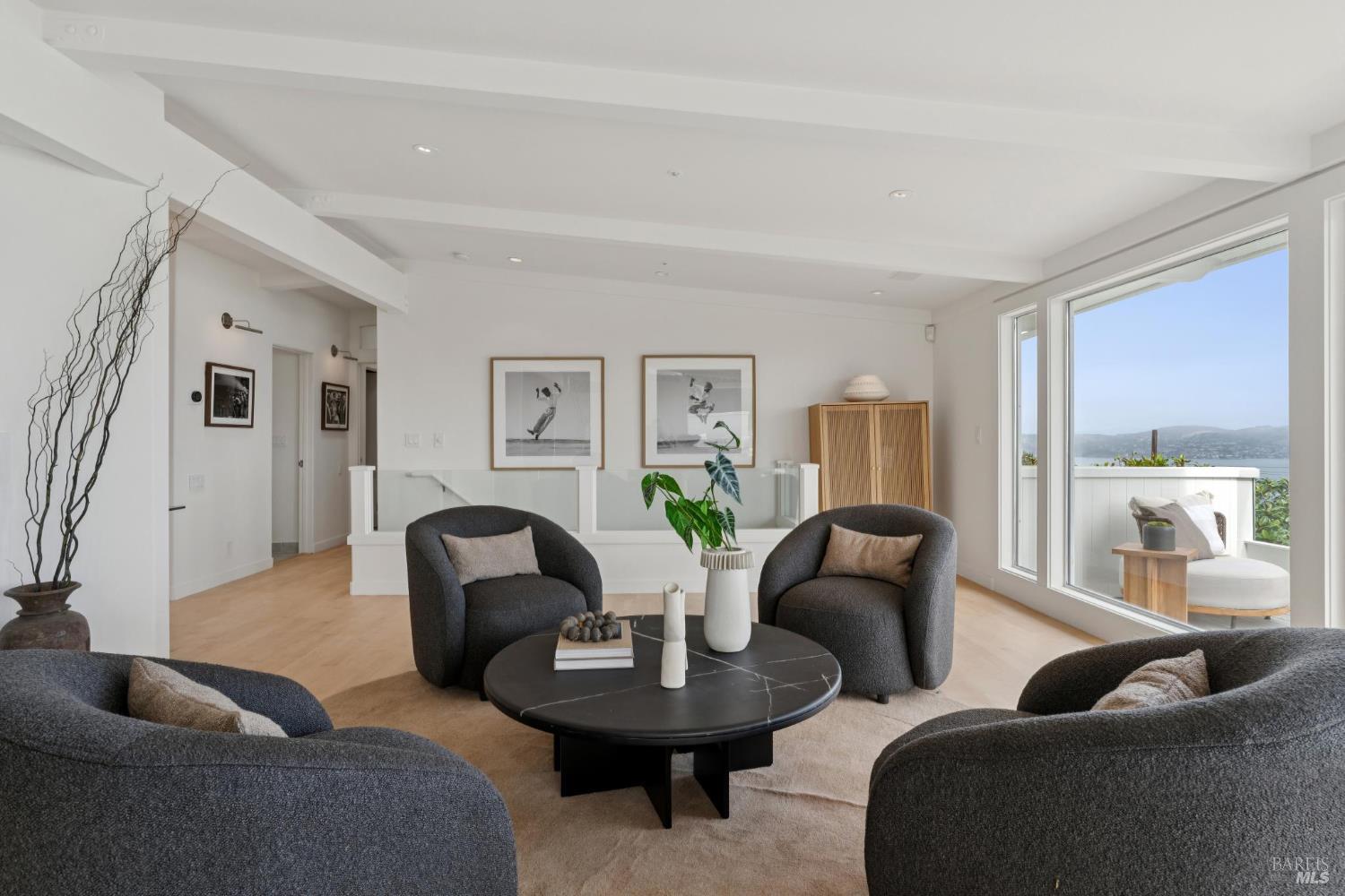 Nestled in one of Sausalito's most sought-after neighborhoods, this iconic 4-bedroom, 2.5-bath mid-century modern retreat showcases sweeping bay views, single-level living on the main level, and seamless indoor-outdoor connections. From the effortless stairless approach at the driveway, you enter into a striking entry foyer that unfolds into an airy open floor plan featuring a timeless kitchen and family room that opens to a patio and lush yard ideal for play and gatherings. The elegant dining and living rooms appear to float over the bay, complemented by a central powder room, guest bedroom (currently used as an office), and luxurious primary suite. The lower level offers two expansive bedrooms with a shared bath, a generous family room, and an oversized 2-car garage. Nearly every space blends indoor comfort with outdoor living, while enjoying privacy and all-day sun. The expansive driveway enhances autonomy with ample parking, framed by mature landscaping. With its southeast orientation, inspiring views, and close proximity to Caledonia Street, Sausalito's thriving downtown, and easy access to 101, this versatile, stylish mid-century modern gem truly checks every box.