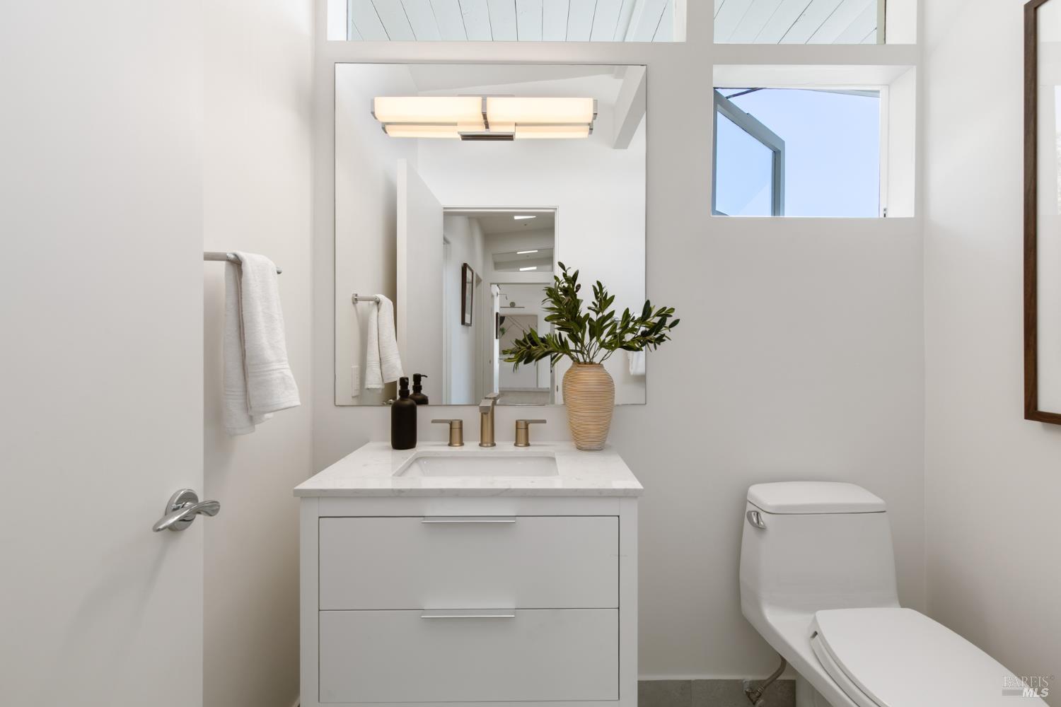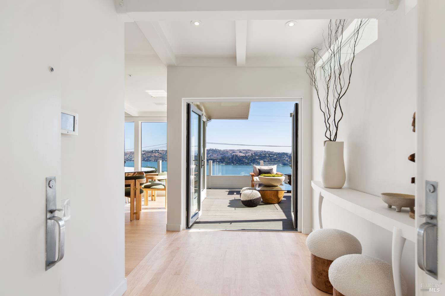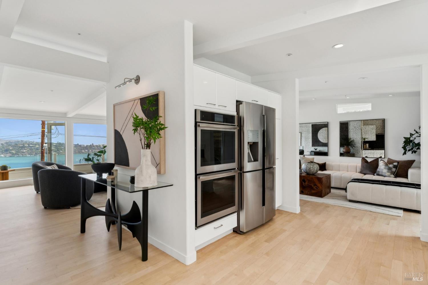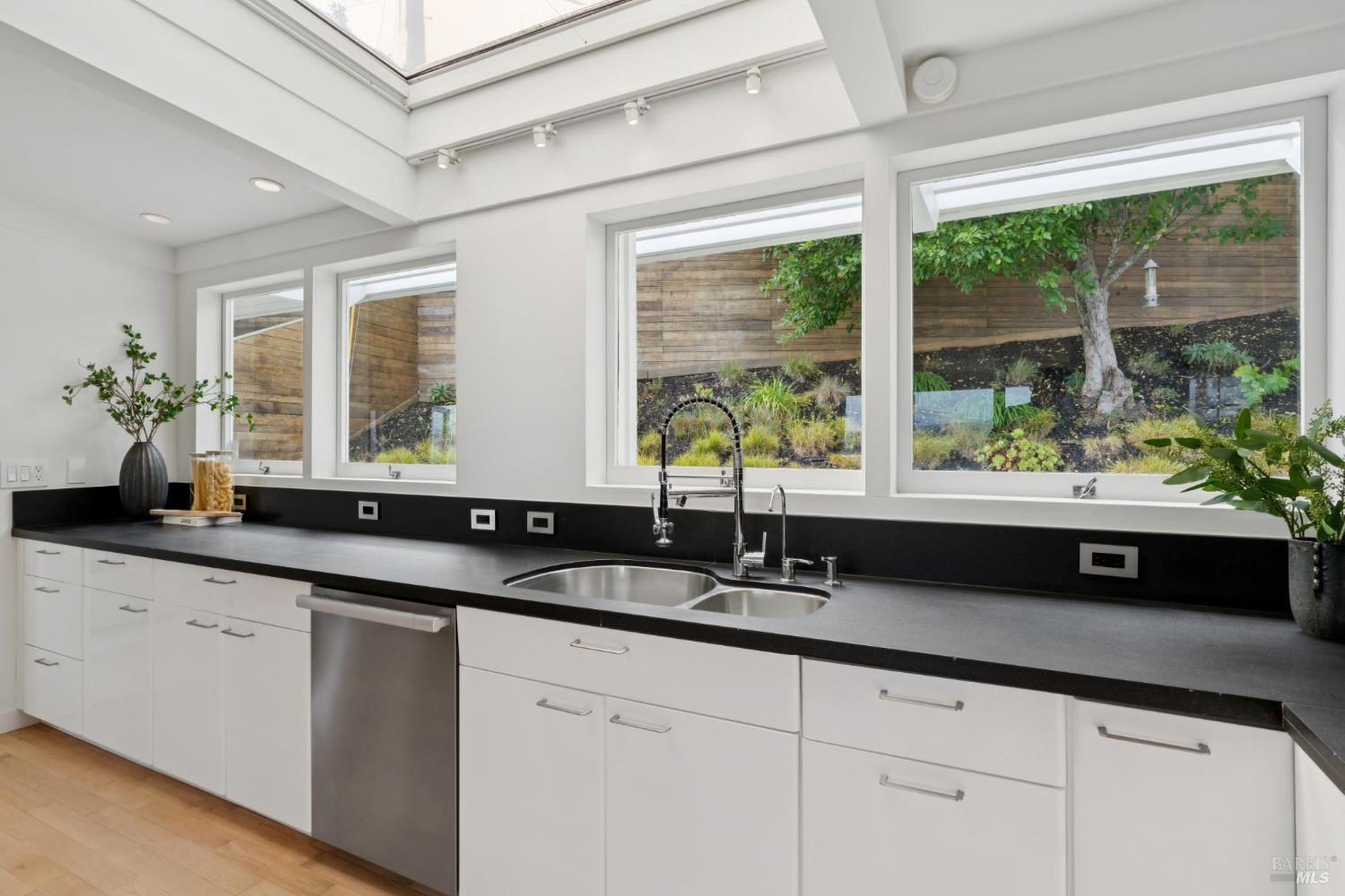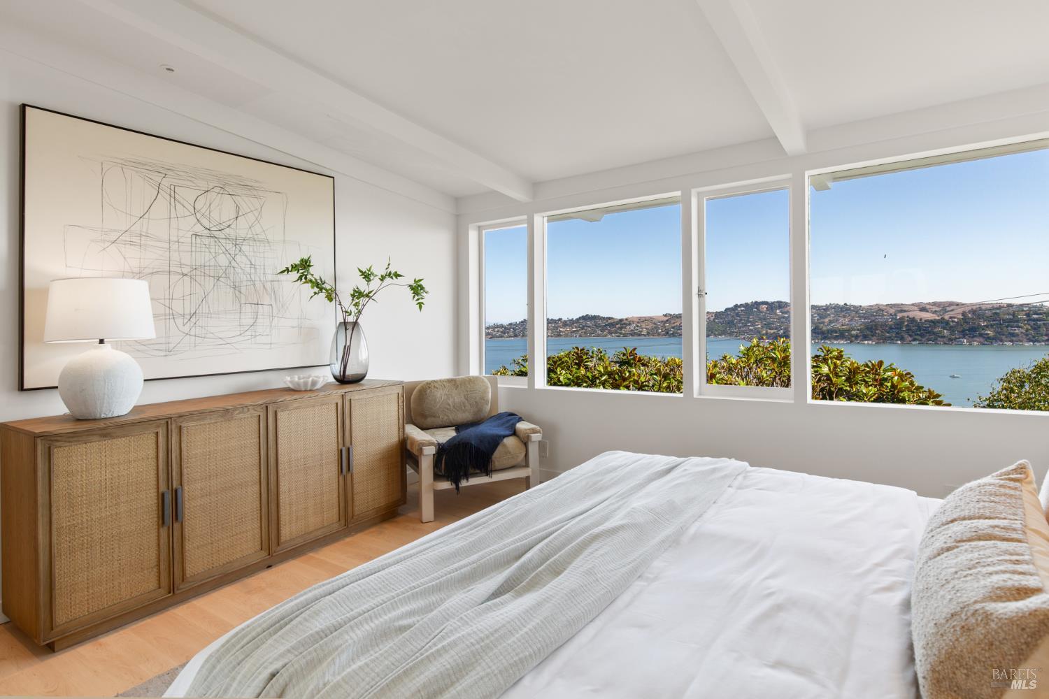 Nestled in one of Sausalito's most sought-after neighborhoods, this iconic 4-bedroom, 2.5-bath mid-century modern retreat showcases sweeping bay views, single-level living on the main level, and seamless indoor-outdoor connections. From the effortless stairless approach at the driveway, you enter into a striking entry foyer that unfolds into an airy open floor plan featuring a timeless kitchen and family room that opens to a patio and lush yard ideal for play and gatherings. The elegant dining and living rooms appear to float over the bay, complemented by a central powder room, guest bedroom (currently used as an office), and luxurious primary suite. The lower level offers two expansive bedrooms with a shared bath, a generous family room, and an oversized 2-car garage. Nearly every space blends indoor comfort with outdoor living, while enjoying privacy and all-day sun. The expansive driveway enhances autonomy with ample parking, framed by mature landscaping. With its southeast orientation, inspiring views, and close proximity to Caledonia Street, Sausalito's thriving downtown, and easy access to 101, this versatile, stylish mid-century modern gem truly checks every box.