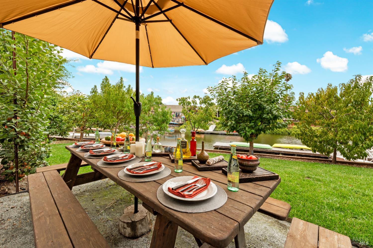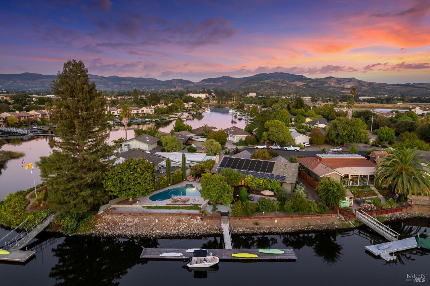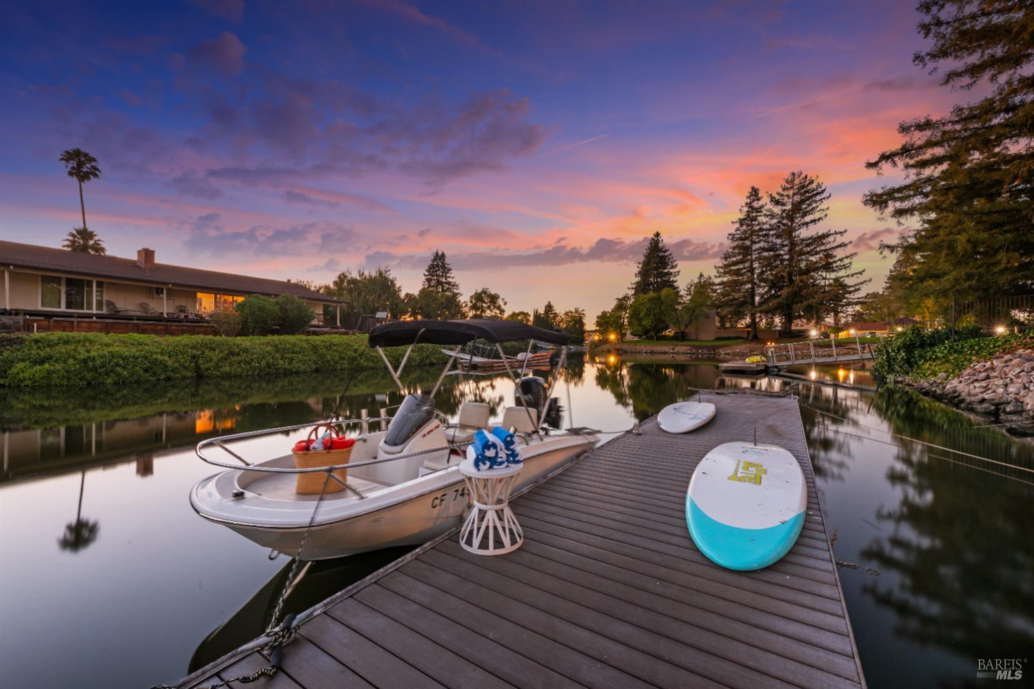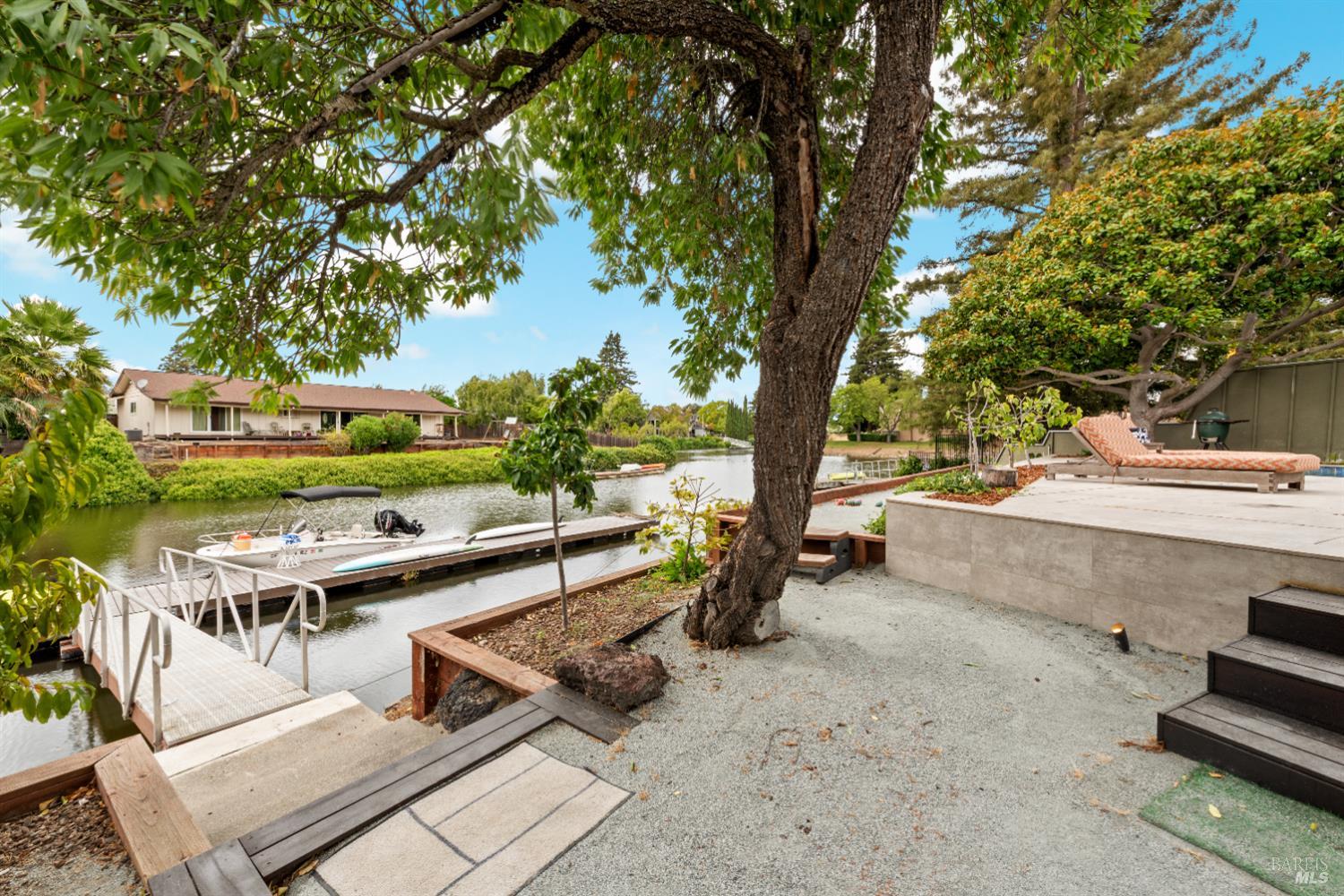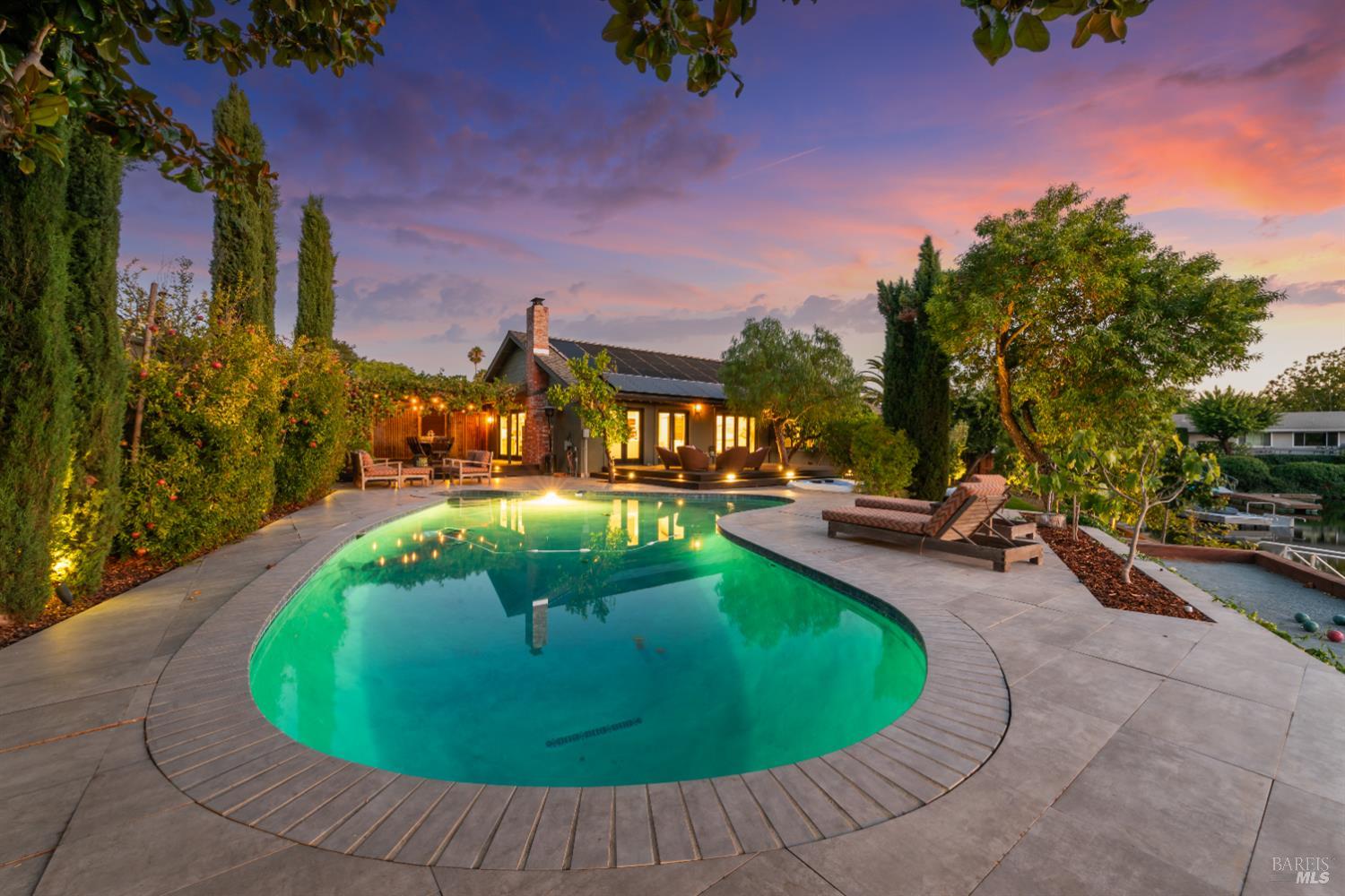 Abundance and Style define this custom single-level residence on .37 acre of Waterfront. Consummate Napa Valley living is easy as vast entertaining spaces flow seamlessly indoors and out. Life centers on a Great Room with wood-burning fireplace and views across a placid Pool onto Western light reflected on the River. All of this is set amidst a professional landscape designed for outdoor cooking, dining and farm-to-table culinary pleasure. The 70' dock on 264' of riverfront tempts you to relax on the friendly water in anticipation of a memorable evening, or play Bocce as the sun sets. Just as a Stainless and Gas open Kitchen with Carrara Marble surfaces will inspire any Chef, the Office/Media and Sleeping Rooms are a retreat apart from social and lounging spaces. Luxe Baths, Closets, and Storage assure serenity and respite from an active lifestyle. Rebuilt in 2016, conceived for sanctuary and wellness, every corner of this beautifully realized home offers comfort. From the Entry Courtyard to the huge Pergola laden with Winegrapes, across expansive IPE Decking to the Spa, and plantings on all four sides yielding Fruits, Vegetables and Herbs, this lush abode truly will feed your passion for living well. Solar, EV Charger, Light, Sound and Security systems simply enhance the luxury.