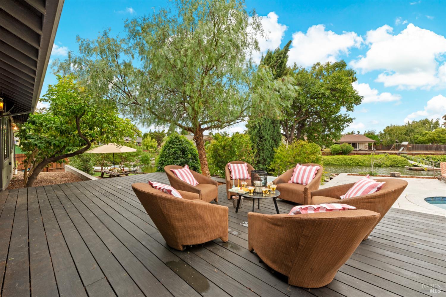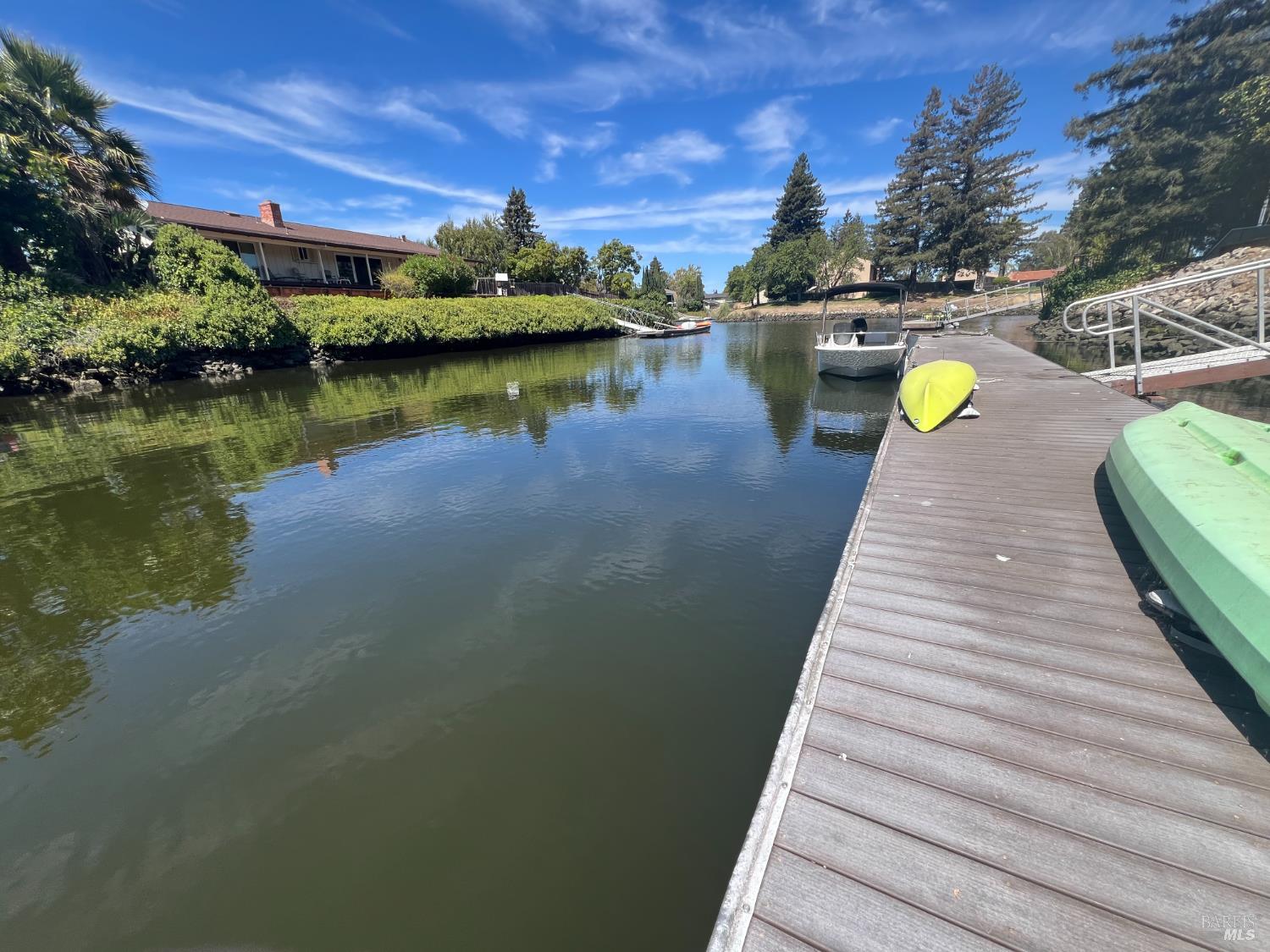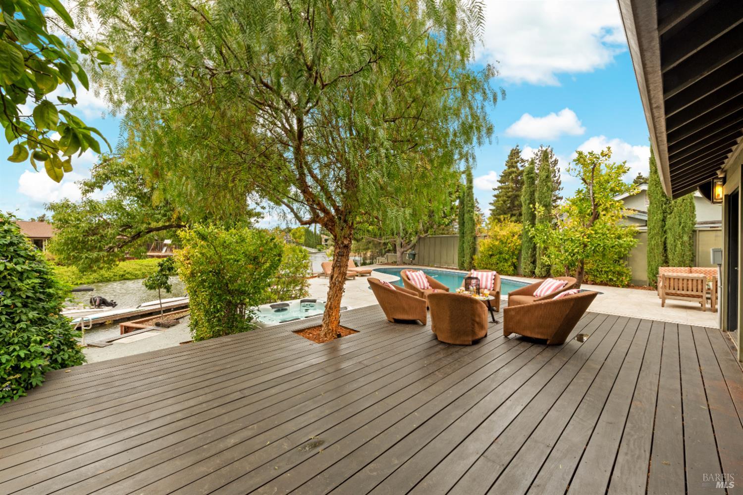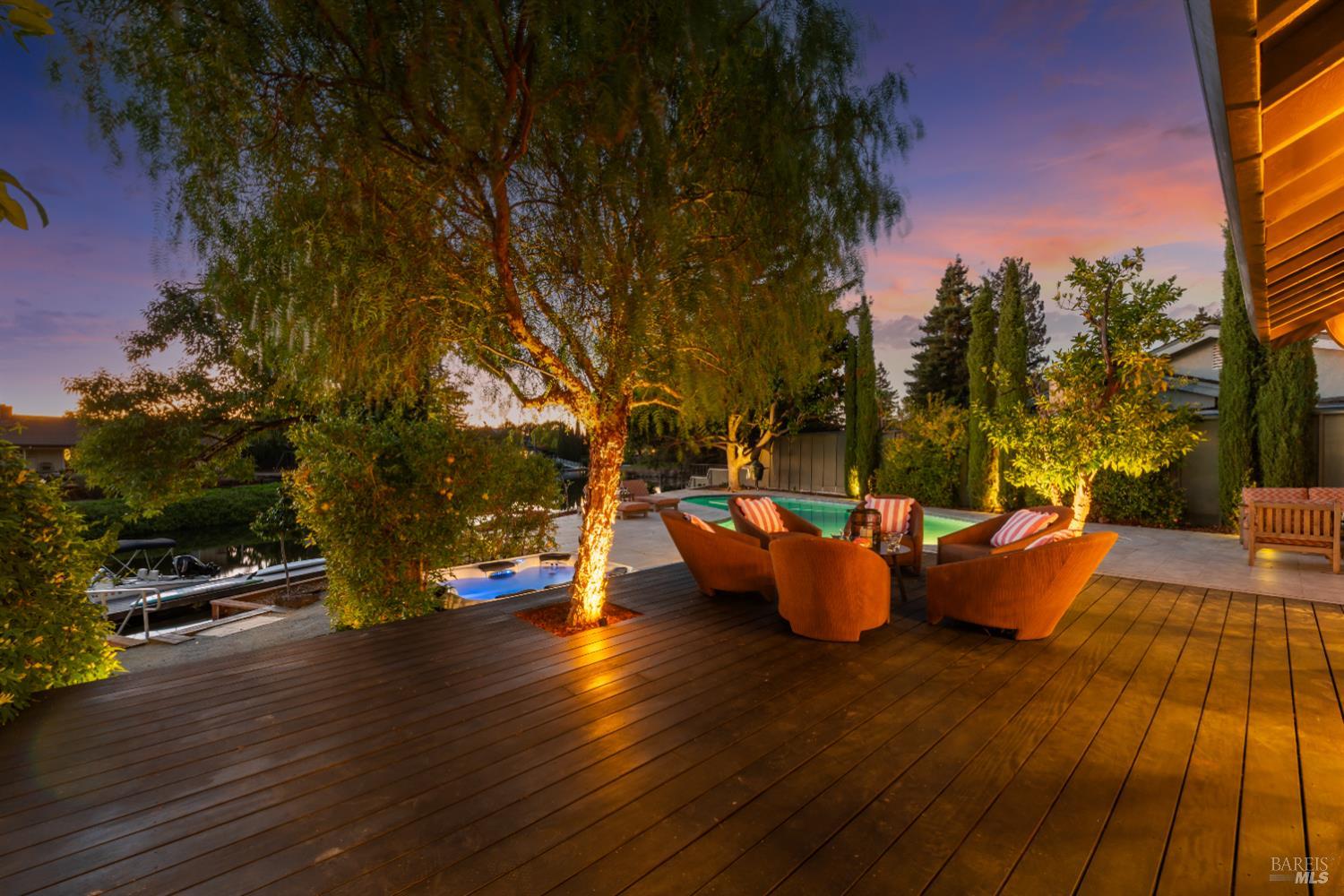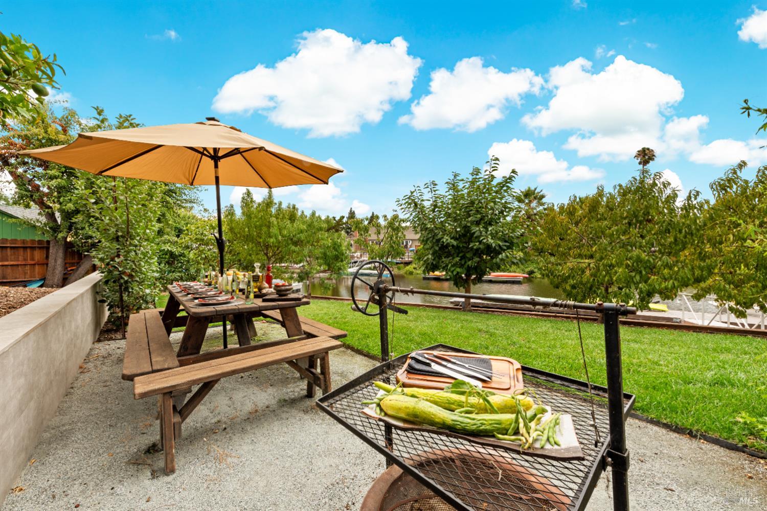 Abundance and Style define this custom single-level residence on .37 acre of Waterfront. Consummate Napa Valley living is easy as vast entertaining spaces flow seamlessly indoors and out. Life centers on a Great Room with wood-burning fireplace and views across a placid Pool onto Western light reflected on the River. All of this is set amidst a professional landscape designed for outdoor cooking, dining and farm-to-table culinary pleasure. The 70' dock on 264' of riverfront tempts you to relax on the friendly water in anticipation of a memorable evening, or play Bocce as the sun sets. Just as a Stainless and Gas open Kitchen with Carrara Marble surfaces will inspire any Chef, the Office/Media and Sleeping Rooms are a retreat apart from social and lounging spaces. Luxe Baths, Closets, and Storage assure serenity and respite from an active lifestyle. Rebuilt in 2016, conceived for sanctuary and wellness, every corner of this beautifully realized home offers comfort. From the Entry Courtyard to the huge Pergola laden with Winegrapes, across expansive IPE Decking to the Spa, and plantings on all four sides yielding Fruits, Vegetables and Herbs, this lush abode truly will feed your passion for living well. Solar, EV Charger, Light, Sound and Security systems simply enhance the luxury.